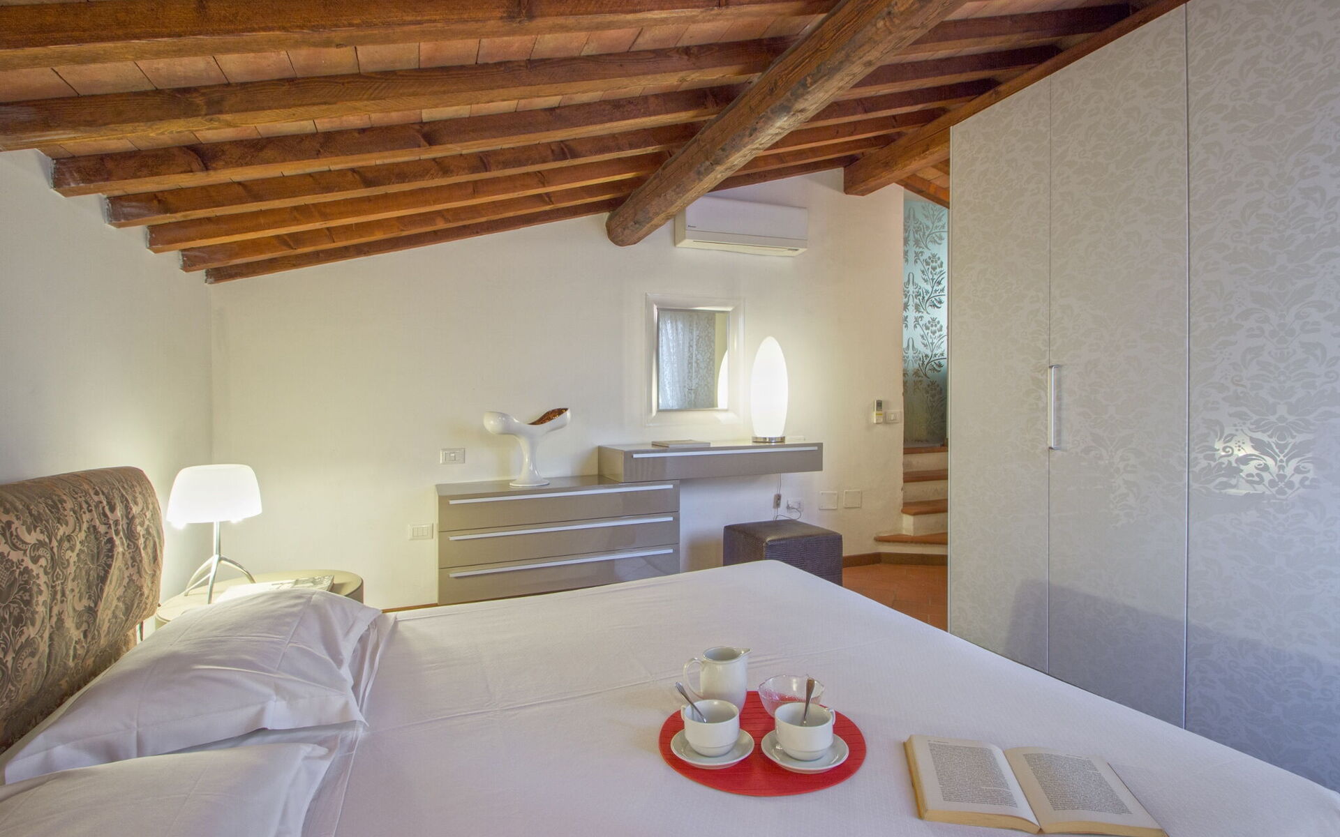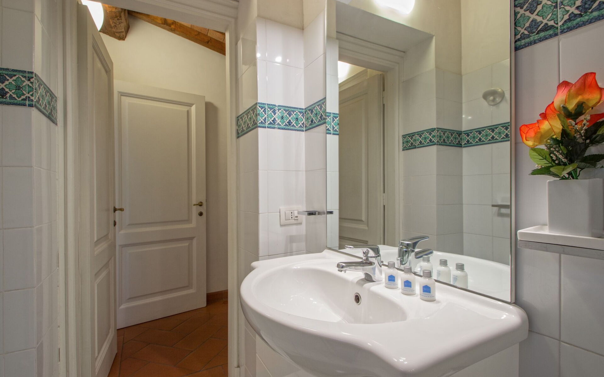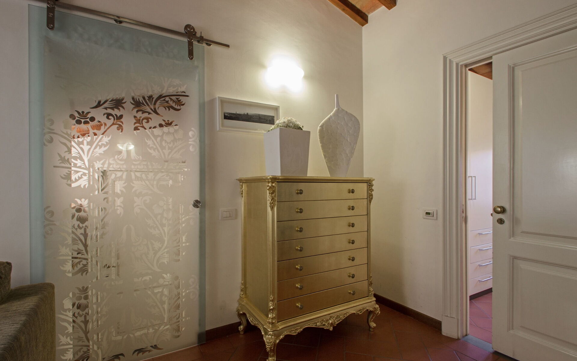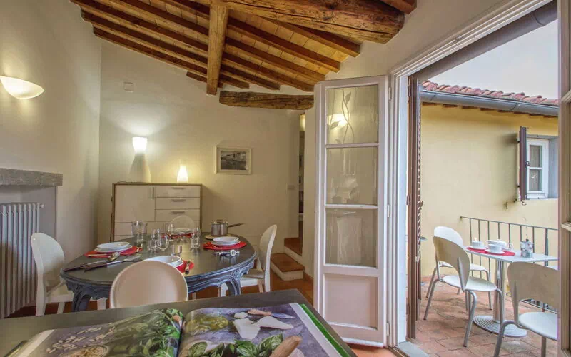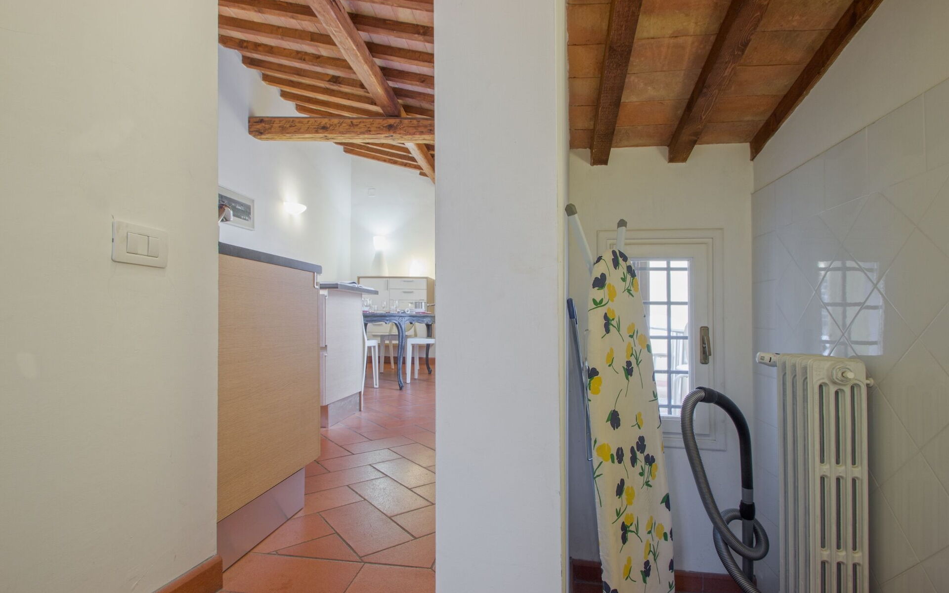 I pavimenti in cotto e il soffitto con travi a vista conferiscono all’appartamento un’atmosfera calda e tipicamente fiorentina.