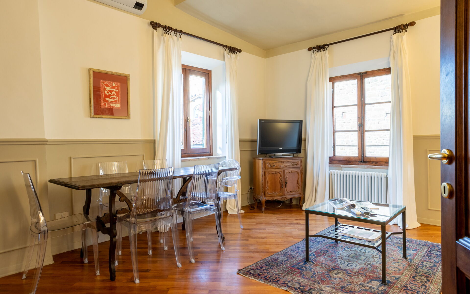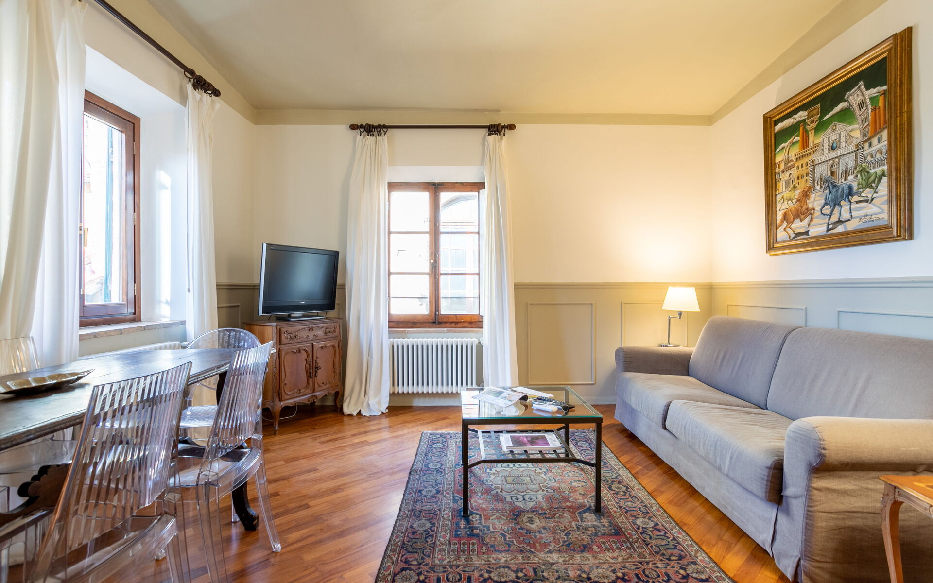 sulla sinistra al luminoso soggiorno con area pranzo, ideale per rilassarsi davanti alla TV o con un buon libro dopo una giornata di visite in città