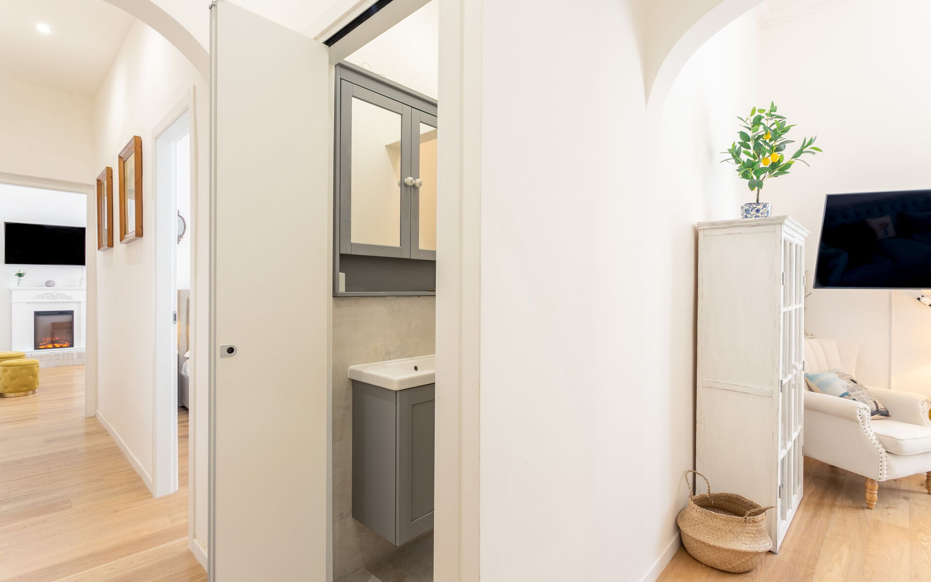 Entrando si accede a un ampio soggiorno luminoso con TV, divano e poltrona, caratterizzato da camino elettrico che crea un’atmosfera accogliente. Dal soggiorno si passa alla cucina ben attrezzata e a un bagno completo con lavatrice e asciugatrice. Sull’altro lato dell’appartamento si trovano le due camere matrimoniali e il secondo bagno completo.