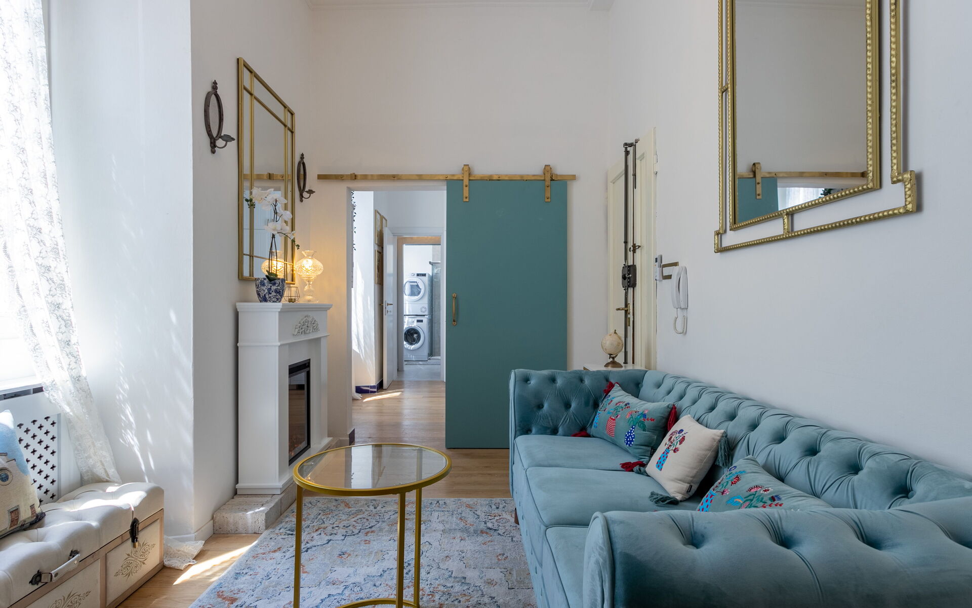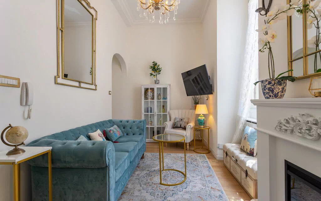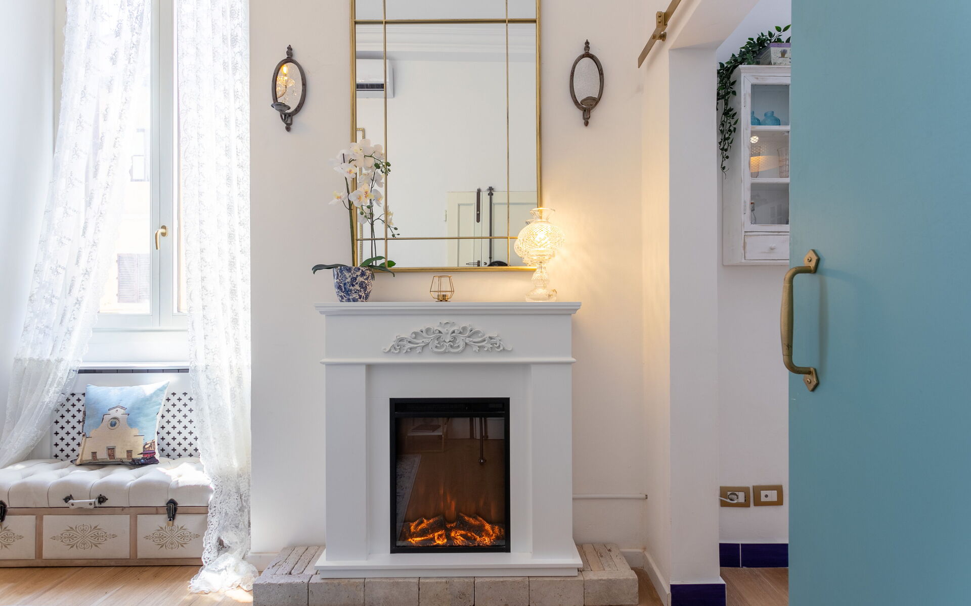 L’alloggio comprende un soggiorno luminoso con TV, divano e camino elettrico, una cucina completamente attrezzata e dotazioni moderne come aria condizionata, Wi-Fi e lavatrice e asciugatrice.