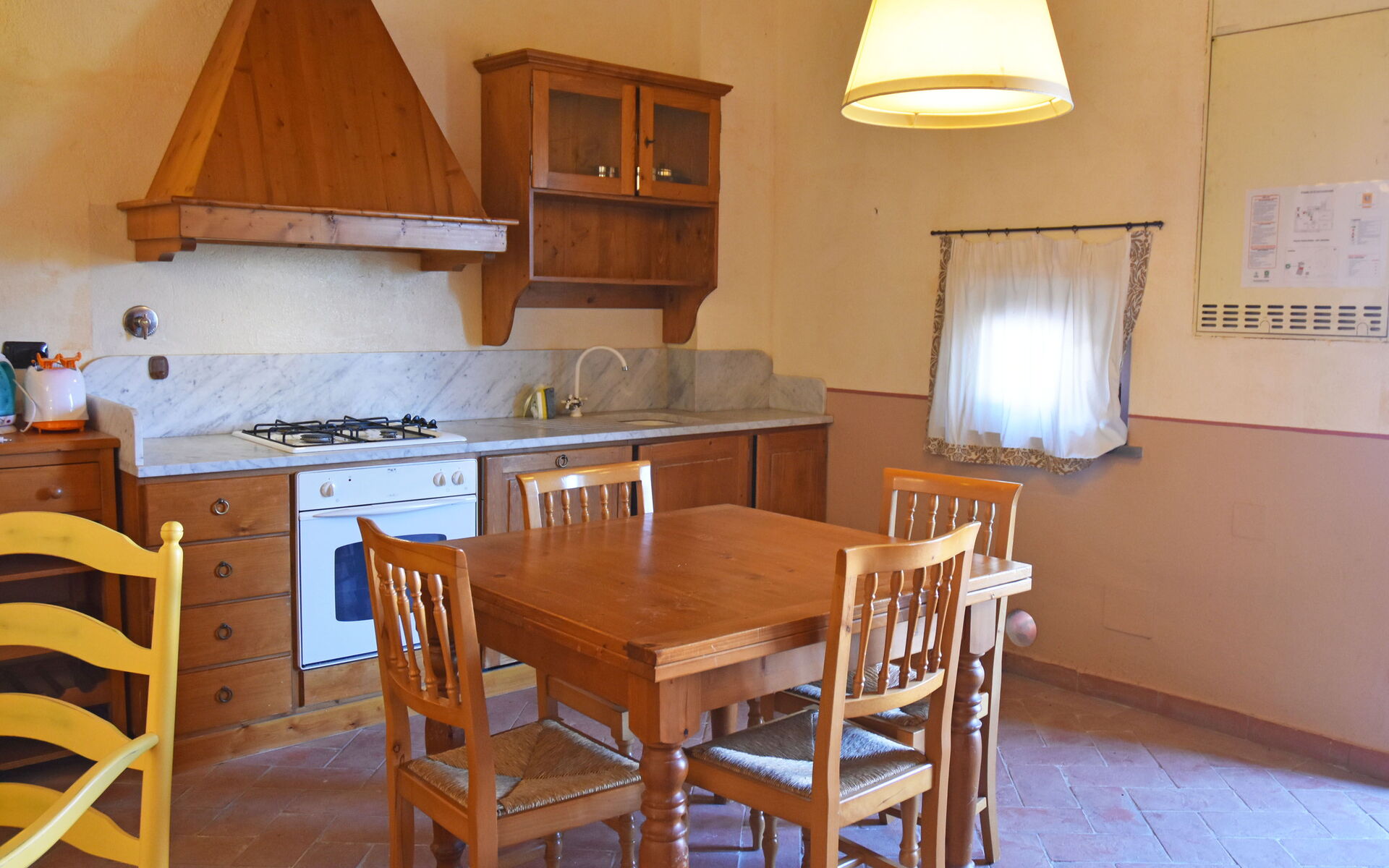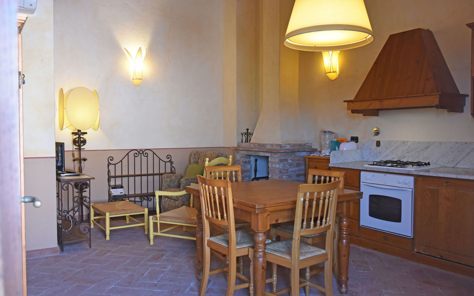 Dalla cucina/salotto ci sono 4 gradini per raggiungere la camera matrimoniale. Cucina con forno, lavastoviglie, piano cottura a gas e il camino.