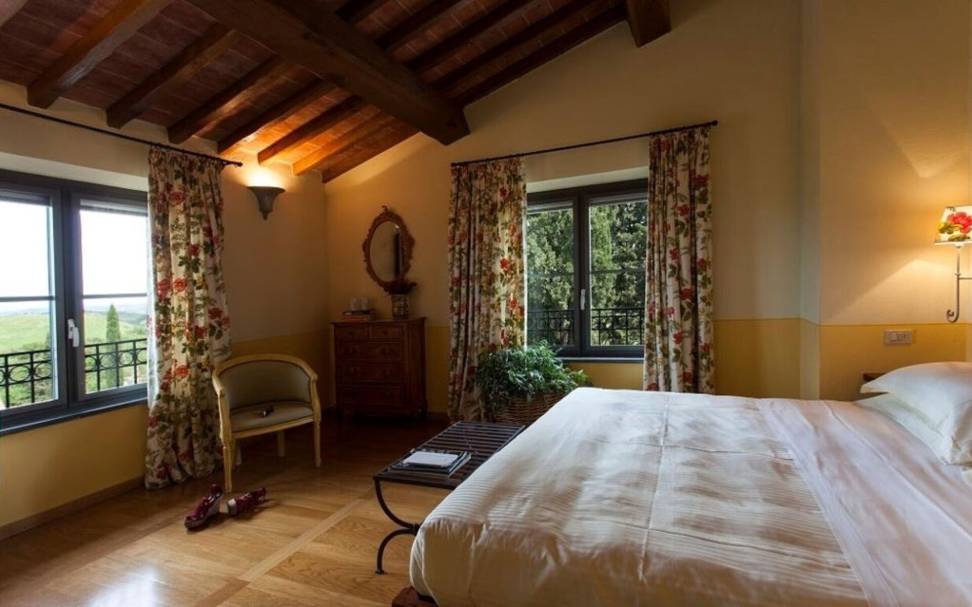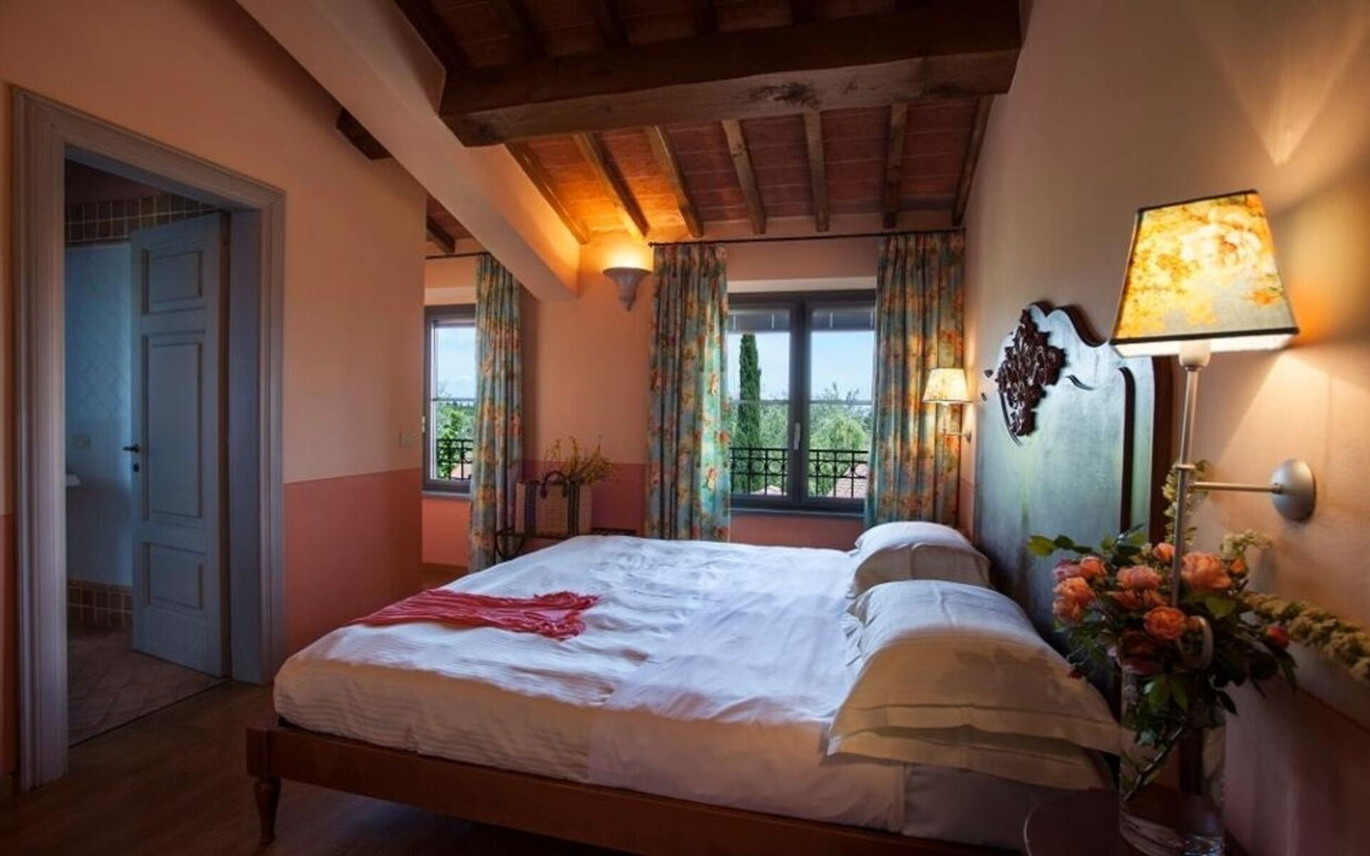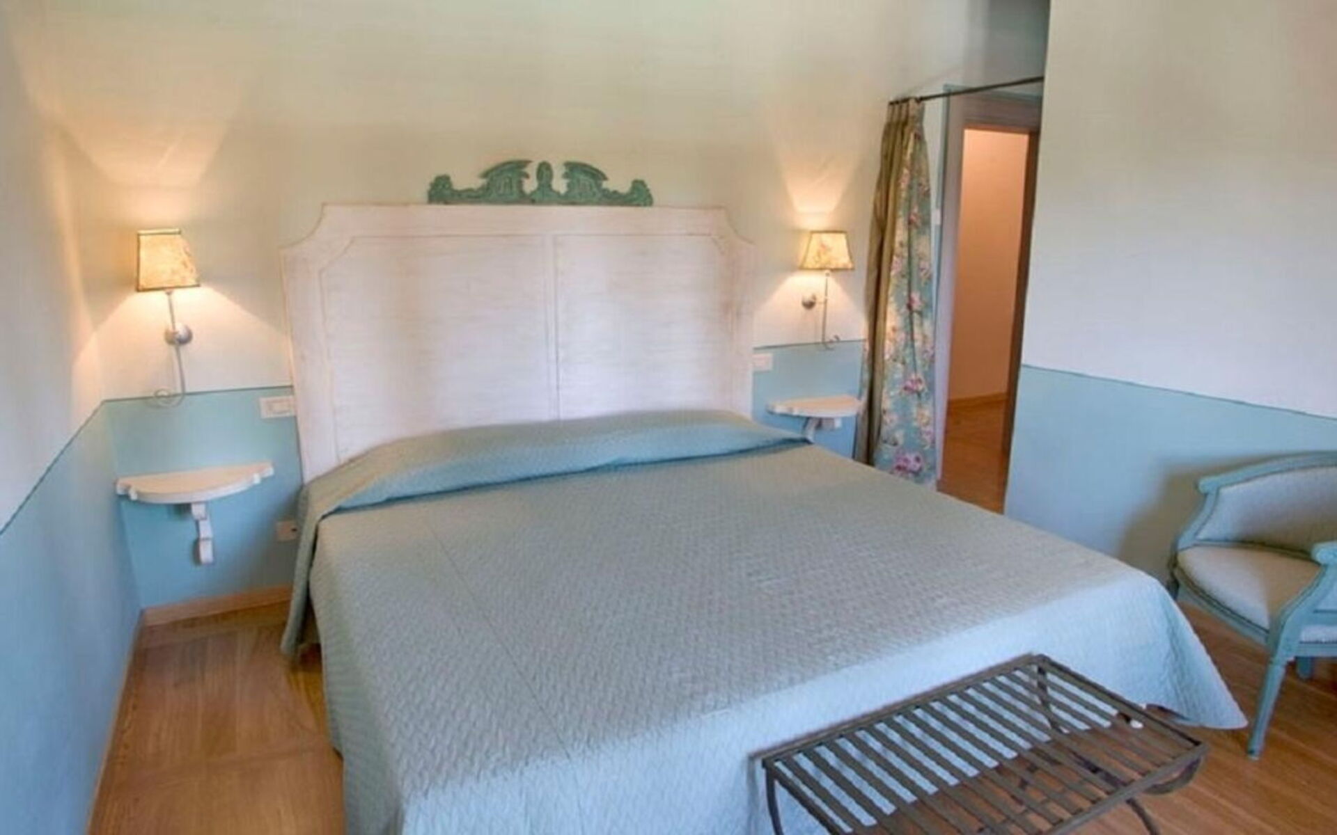 Primo piano: Il piano superiore, raggiungibile tramite una scala interna, è formato da 5 camere matrimoniali, ognuna dotata del proprio bagno ensuite con doccia (uno è attrezzato anche con vasca), 1 piccola camera doppia (i cui letti possono essere uniti se necessario) con bagno ensuite con doccia.