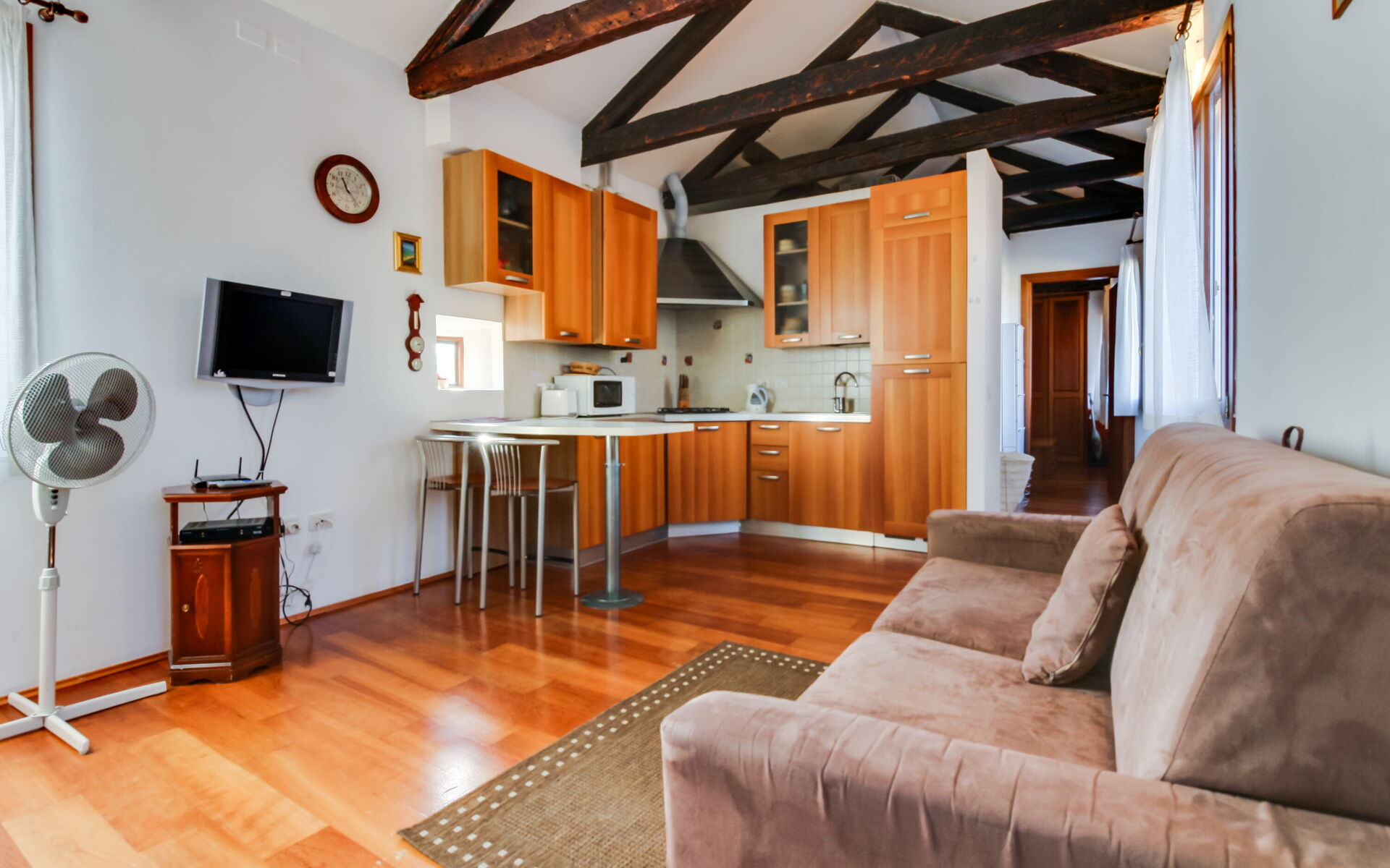 Aria condizionata, Lavastoviglie, Freezer, Frigo, Ferro da stiro, Macchina da caffè (Italiana), Microonde, Ventilatore portatile, Divano letto matrimoniale, Piano Cottura, Televisione, Tostapane, Cucina ben attrezzata, Internet WiFi