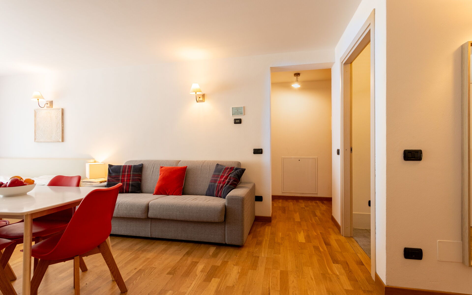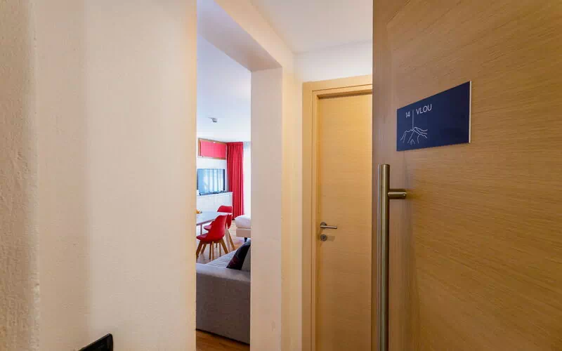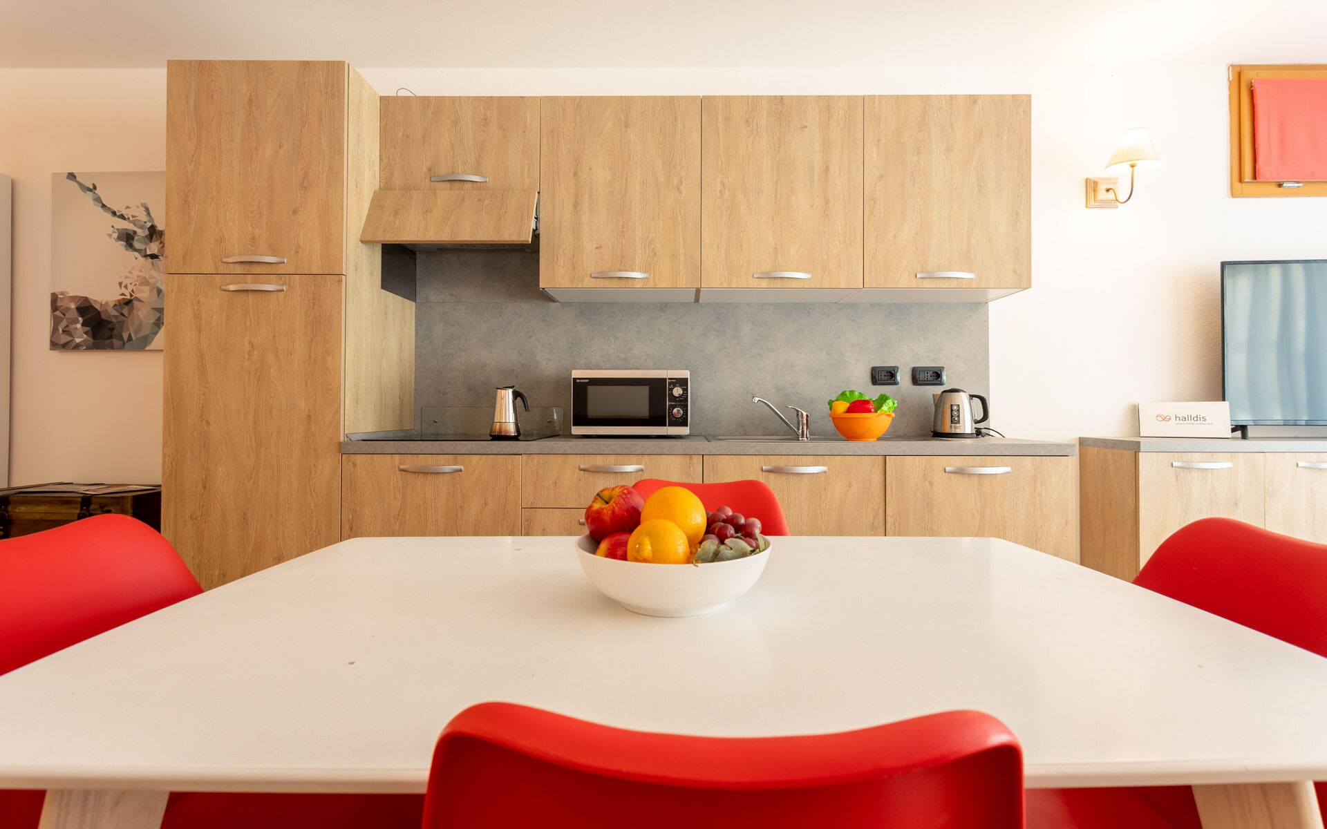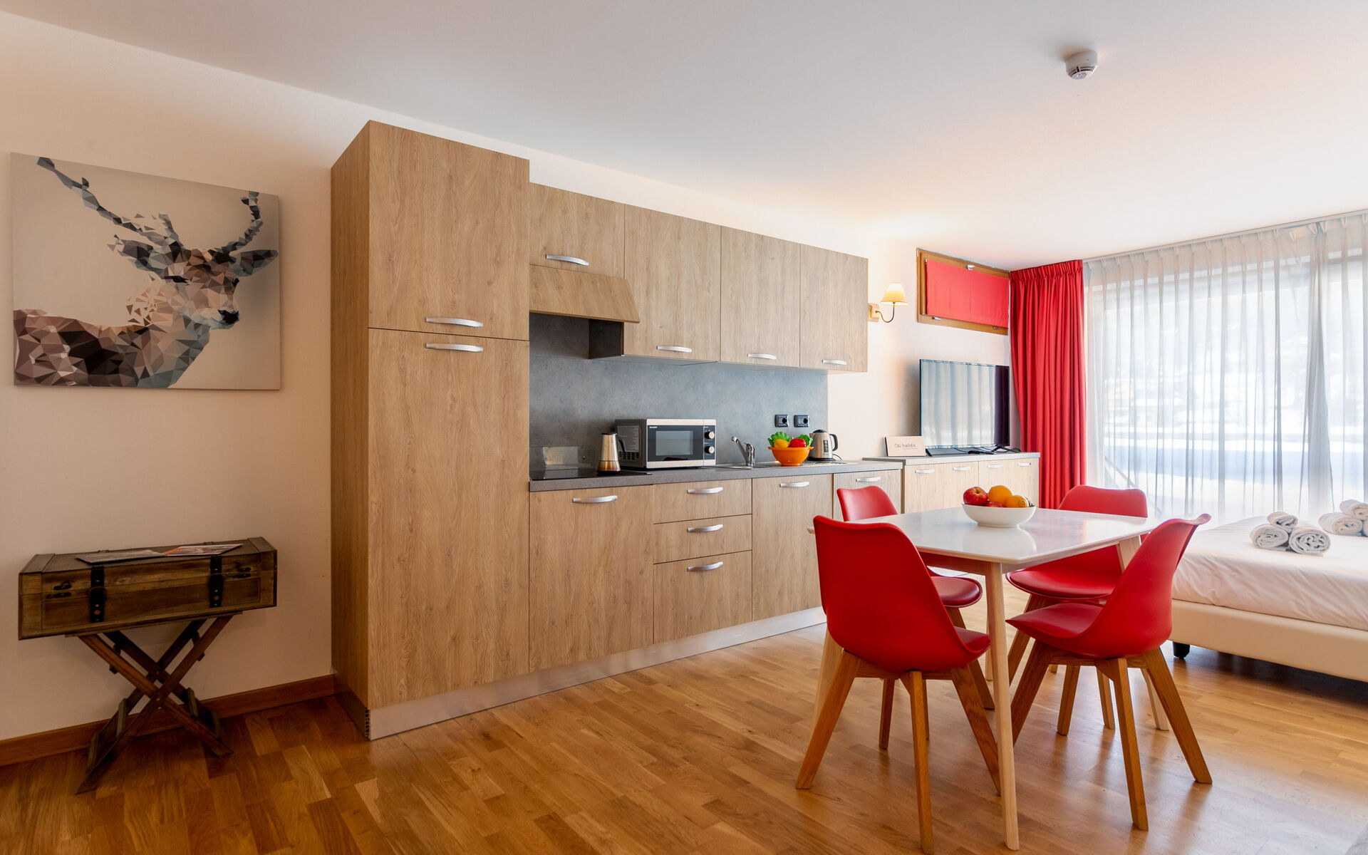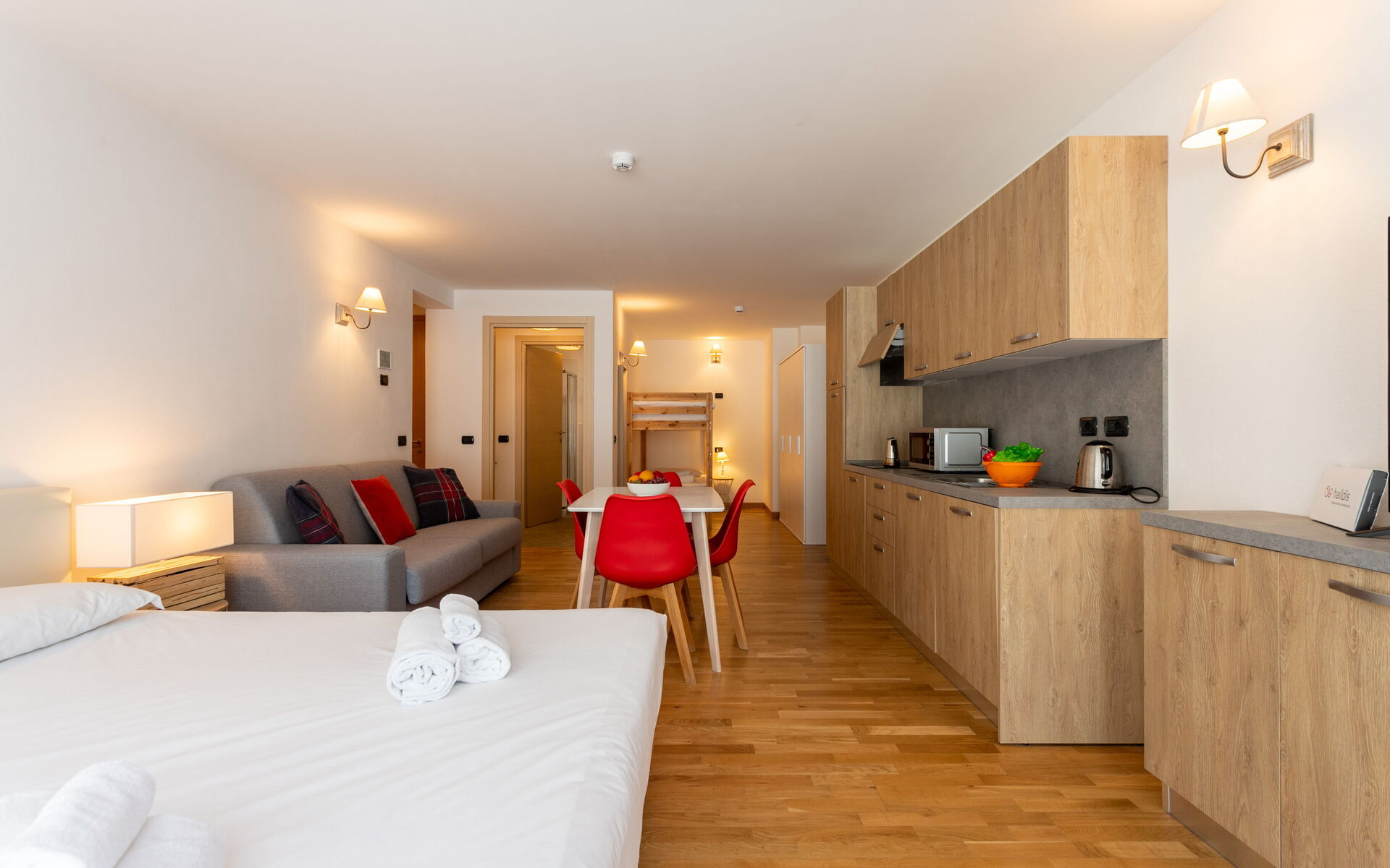 Entering, a small hallway gives access to the open space. On the right is a table for 4 guests in front of the kitchenette, equipped with induction burners, hood, dishwasher, refrigerator with freezer, microwave combo, kettle, and toaster.