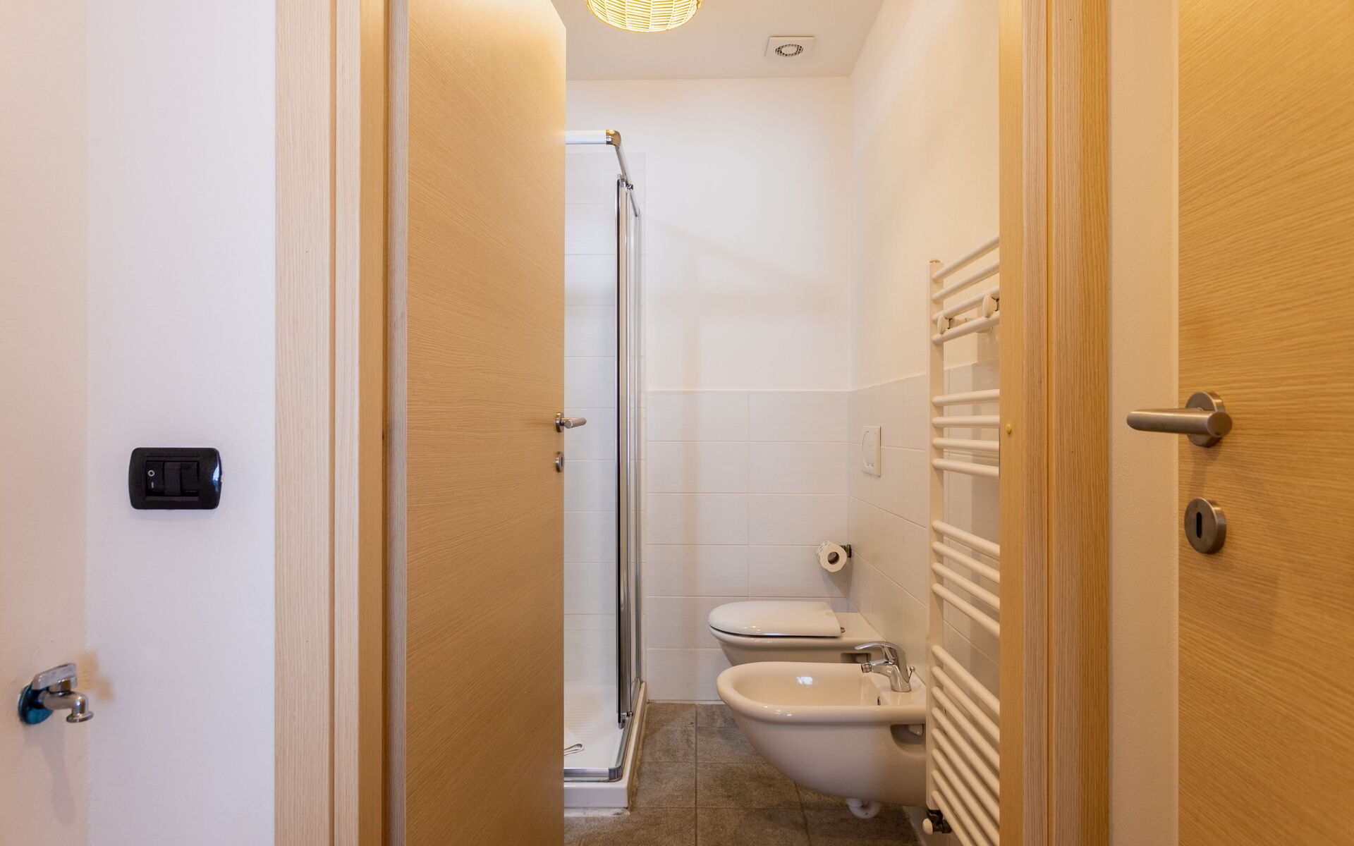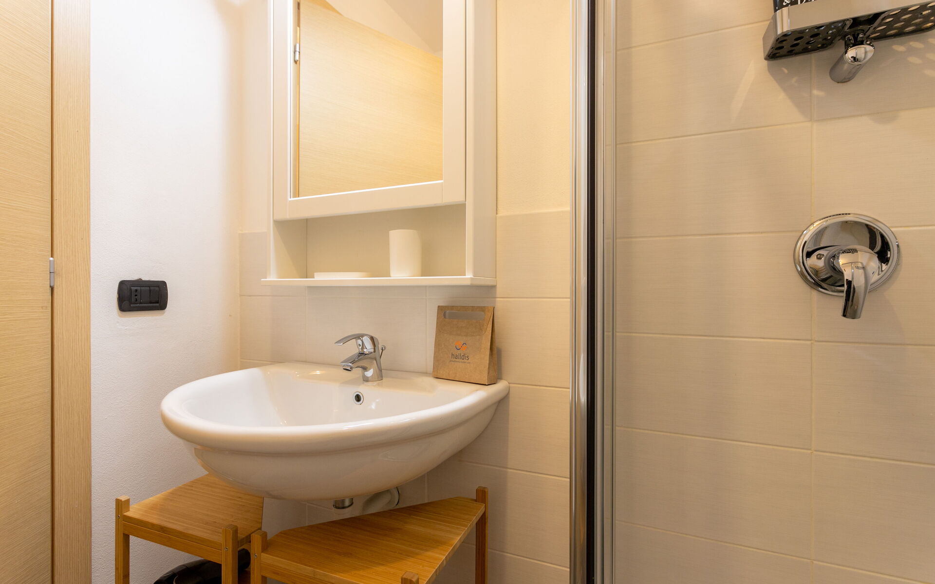 To the left of the entrance is a bathroom without windows, equipped with a shower.