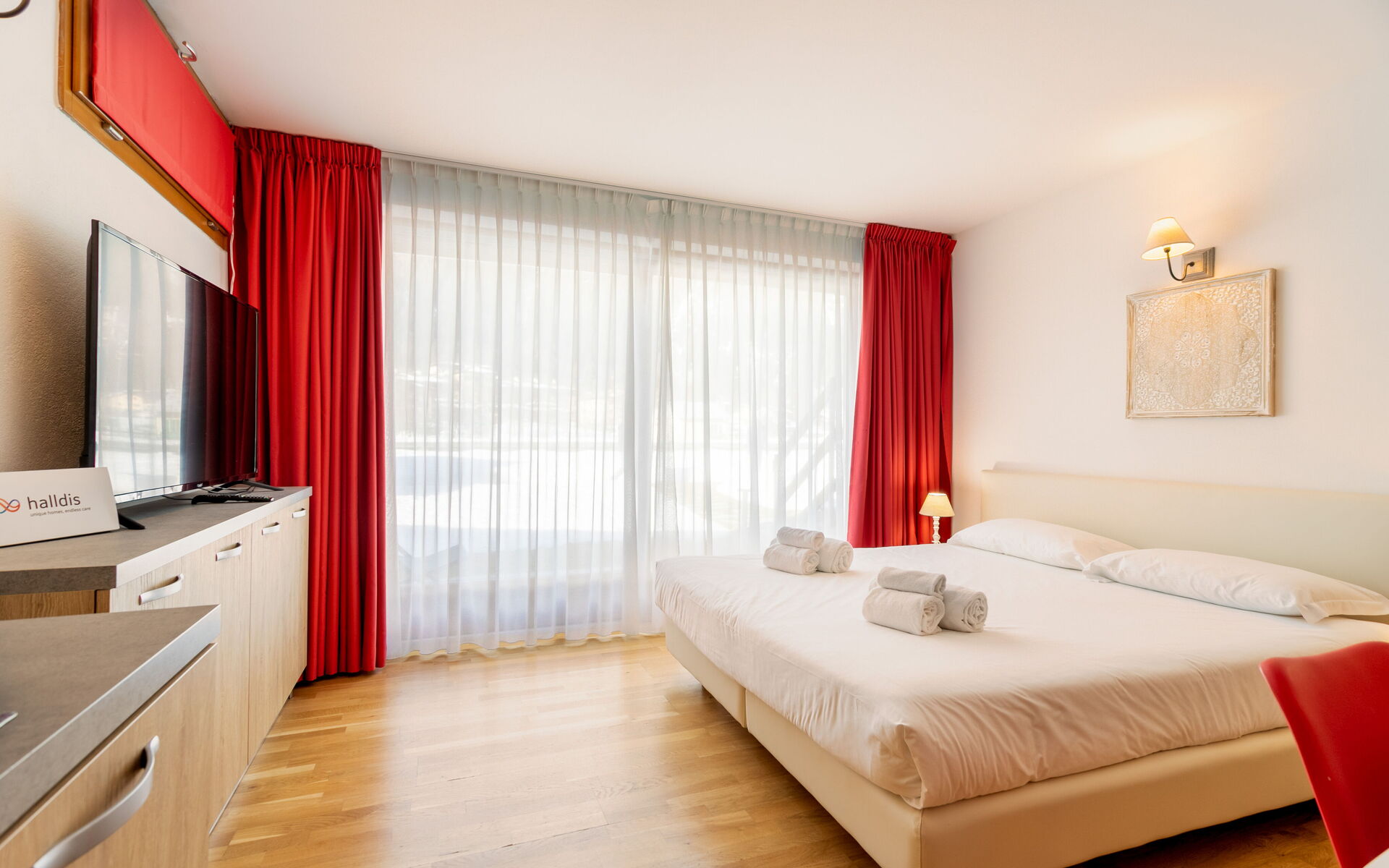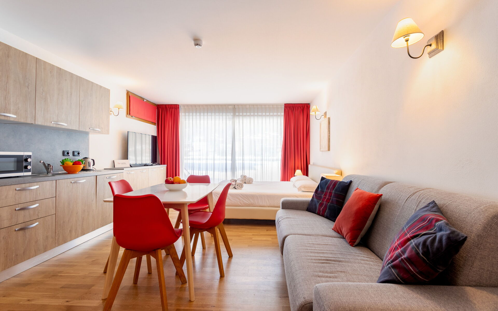 On the right, beyond the dining table, there is the sleeping area, furnished with a marriage bed that could be splitted in 2 single beds a sofa, and a 50” TV.