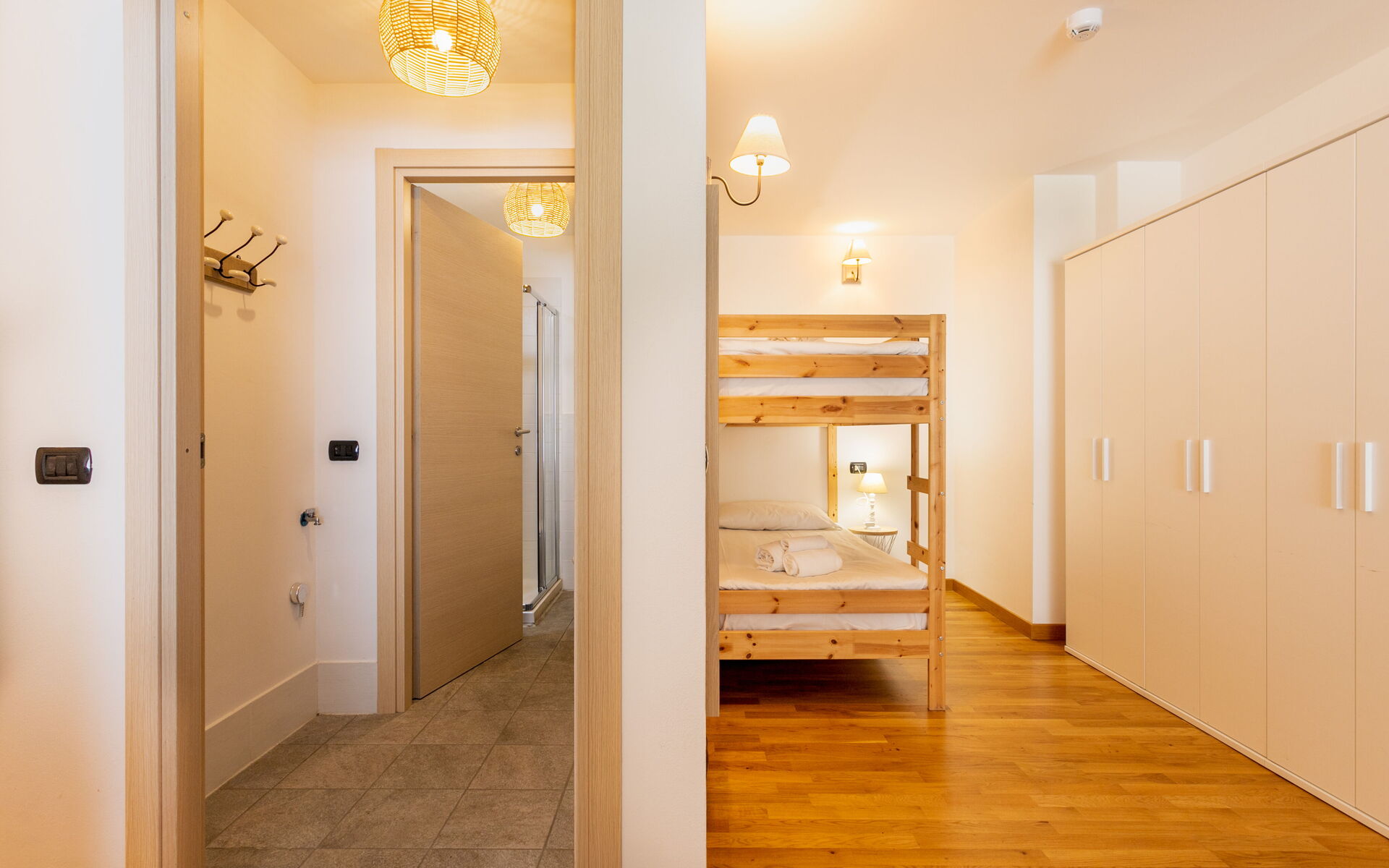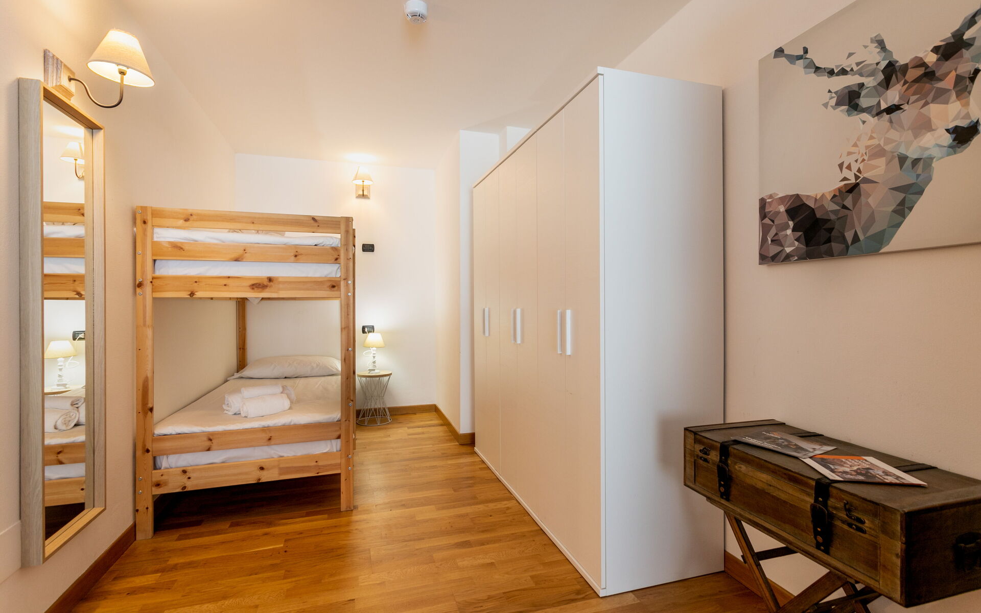 On the opposite side of the room there is a bunk bed and a large wardrobe.