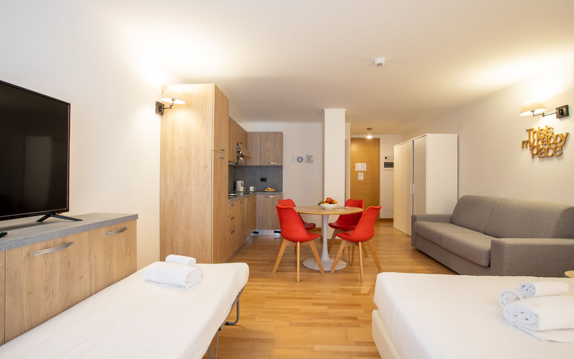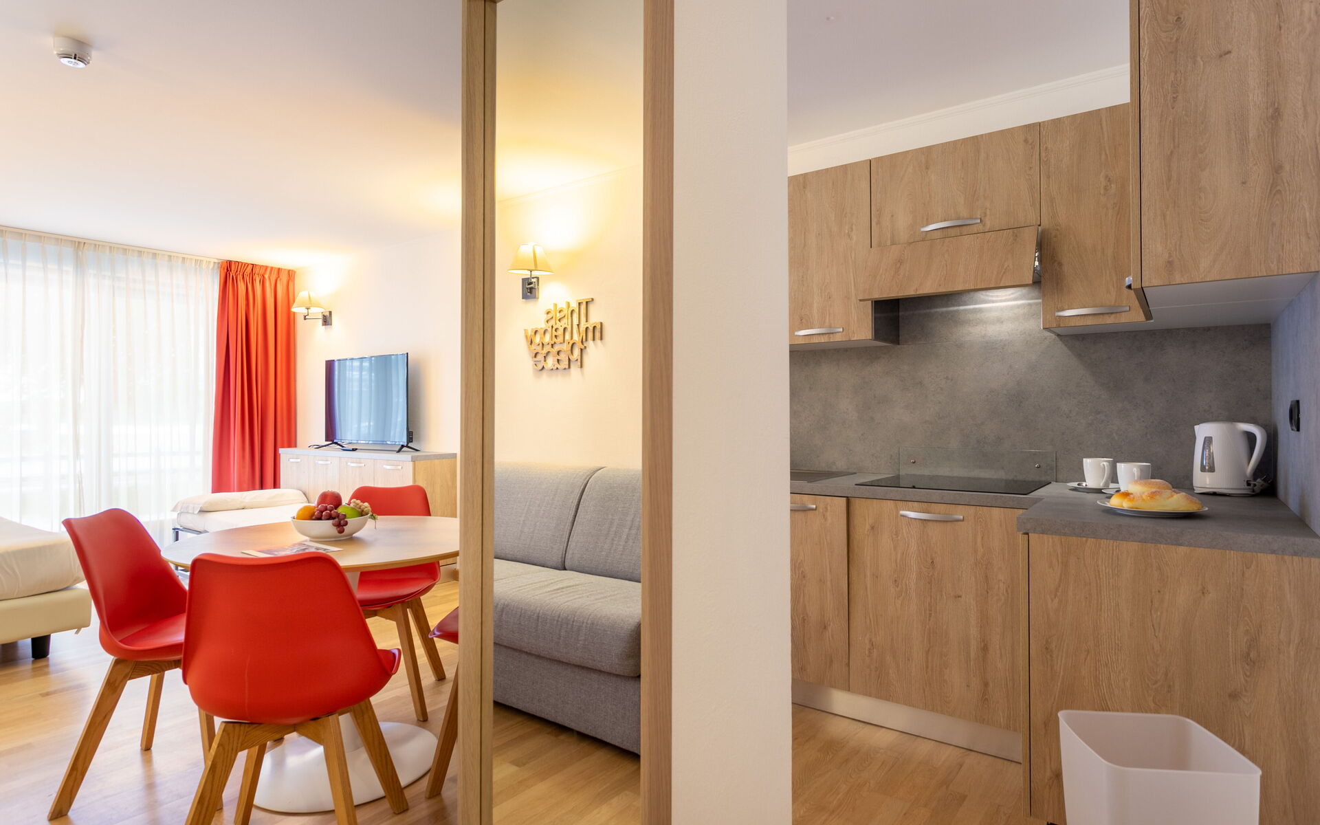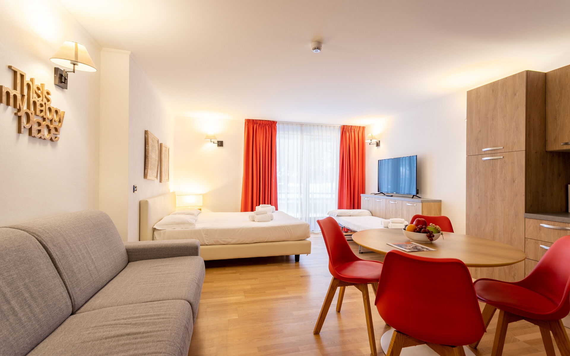 Entering the apartment, you will find the bathroom with shower (no window) on the right. Passing the bathroom you find yourself in the dining area with a large open floor plan kitchen, complete with induction burners, refrigerator, freezer, dishwasher, and hood. There is also a combination microwave, a kettle, and a toaster. Next to the kitchen there is a round table for 4 guests and at the end of the room there is a TV area with a double sofa bed and a 42” TV. There is also a pouf that can become the 3rd bed.