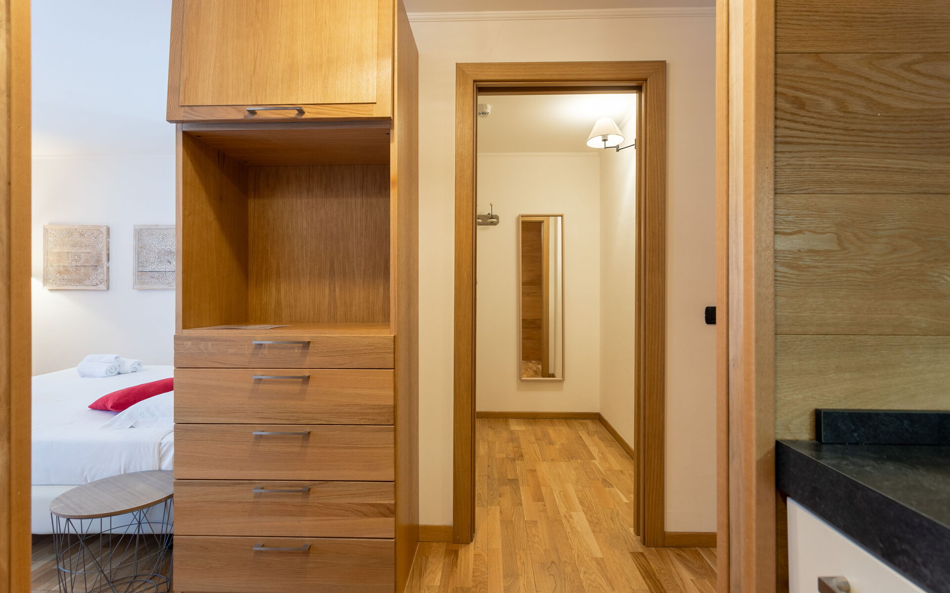 A corridor with a wall closet leads to the living area with kitchen equipped with electric burners, combination microwave oven, refrigerator and freezer, toaster, kettle, and crockery and kitchen utensils. A table with 4 chairs, a marriage bed that could be splitted in 2 single beds, and a 42” television complete the room made luminous by a French door that leads to the common garden. There is also a wardrobe room with another closet and a bathroom with ventilation system (no window) and shower stall.