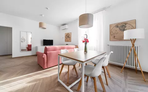 This elegant 1-bedroom apartment of approximately 50 sq m has been furnished with bespoke furniture made by Italian artisans, ensuring our guests with a pleasant environment. The apartment opens onto the large day area, well-lit by two french windows and a balcony overlooking via Massarenti and Bologna city centre. The dining table for up to 6 people is located behind a comfy double sofa bed (160x200). The kitchen is fully equipped with an electric oven, dishwasher, refrigerator, microwave, toaster, electric kettle and induction hob. A 32” Smart TV with WIFI connection is provided for our guests to access online services - such as Netflix - with their own account. The bedroom is large and sunny. It is furnished with a large wardrobe, a desk with chair and a comfy double bed (160x200). The bathroom is also well finished and equipped with a large crystal shower, heated towel rails and washing machine.