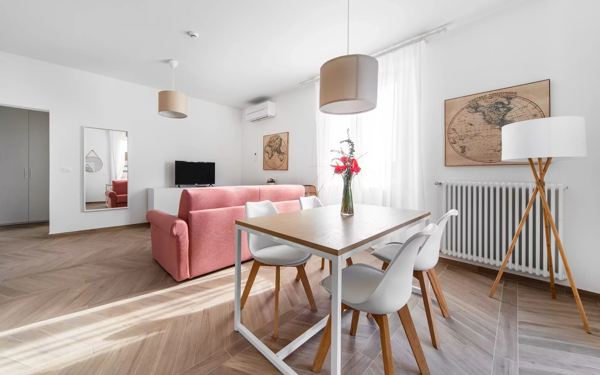 The apartment was completely renovated in October 2020 to ensure guests a pleasant stay in a refined and comfortable environment. Although overlooking via Massarenti, one of the most popular routes to reach the city center, the property is extremely quiet, thanks to high quality window fixtures. The building restoration was eco-sustainable: the construction of the thermal coat and the installation of solar panels on the rooftop both aimed at excellent insulation of the premises while minimizing the energy footprint of the building. Air conditioning with an air purification system provides a pleasant temperature and a hygienic environment at all times, while the central heating is adjustable via a thermostat.