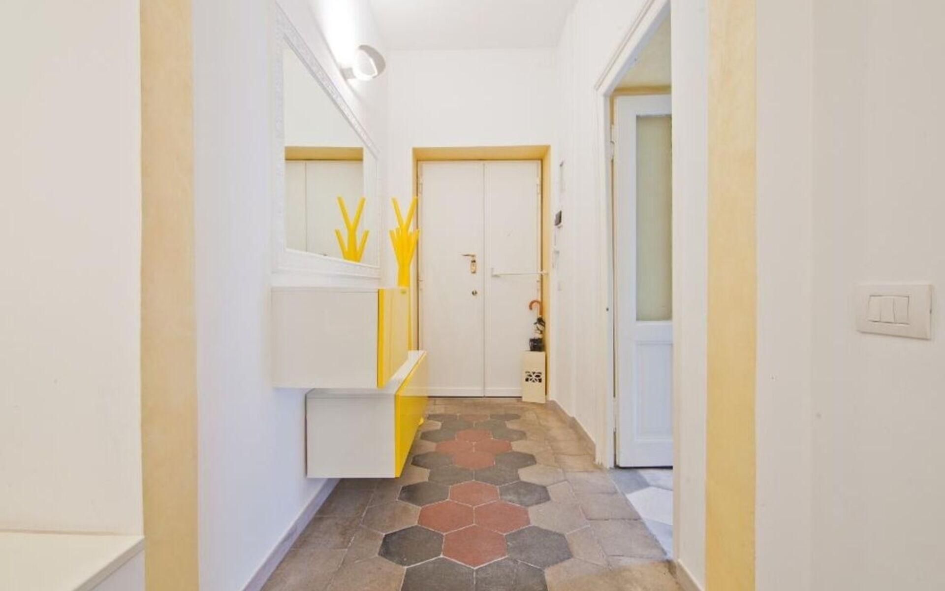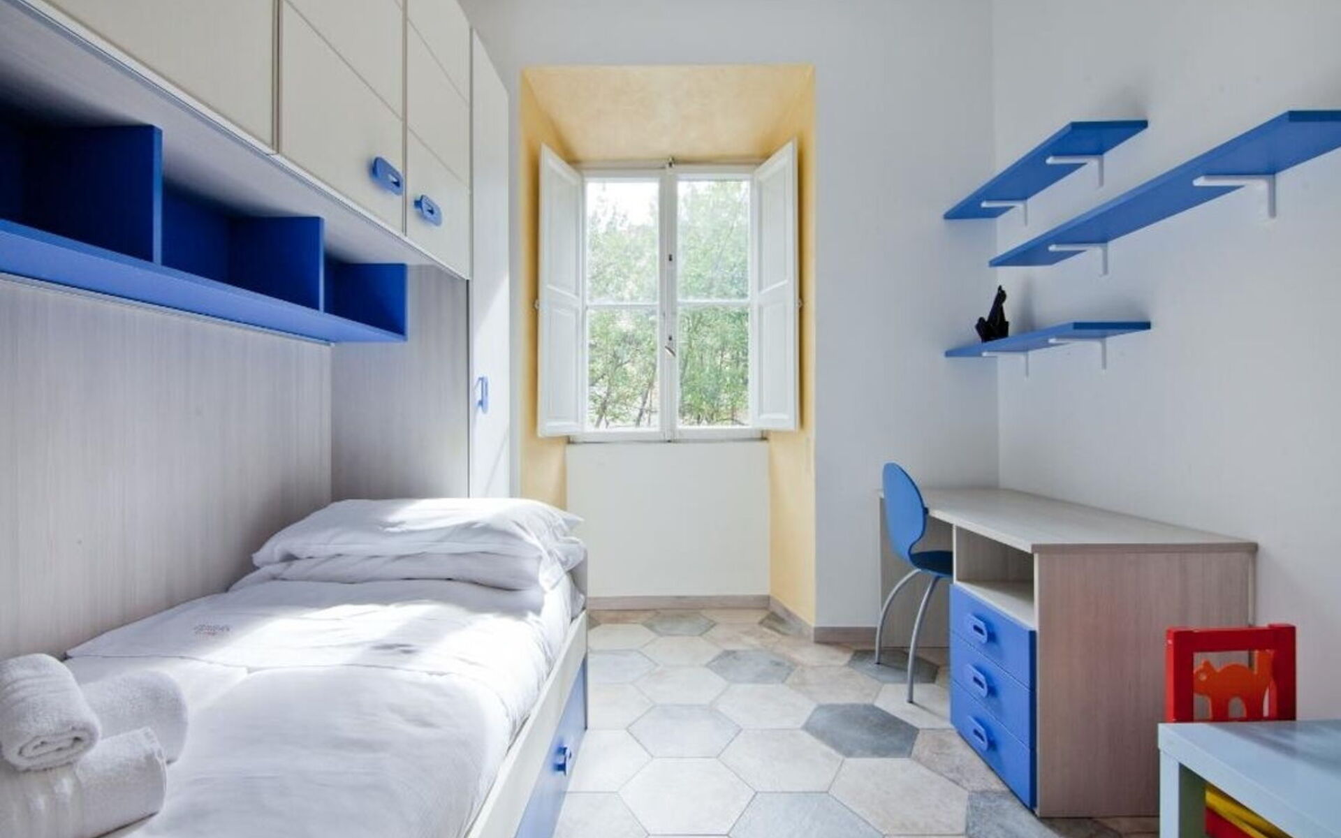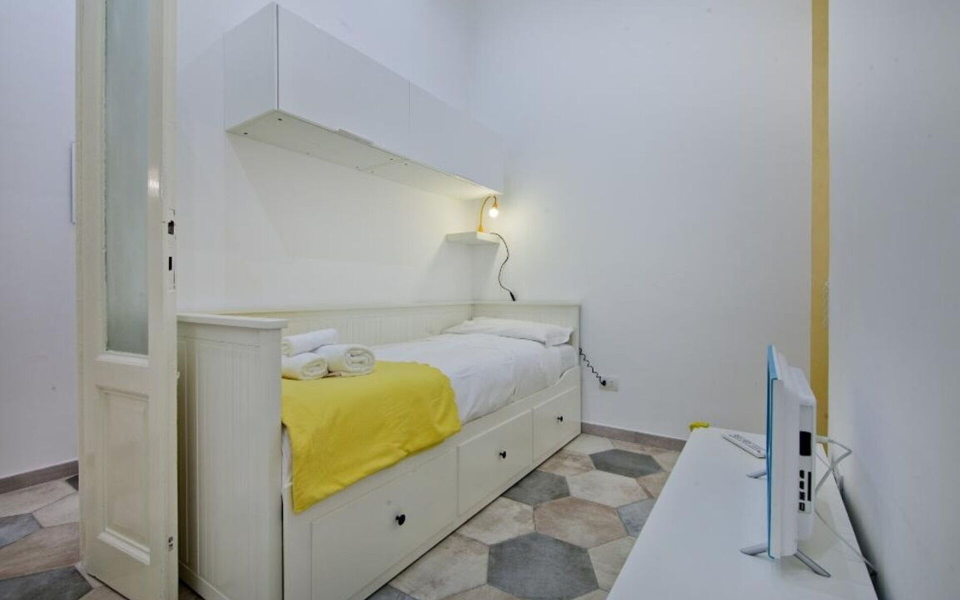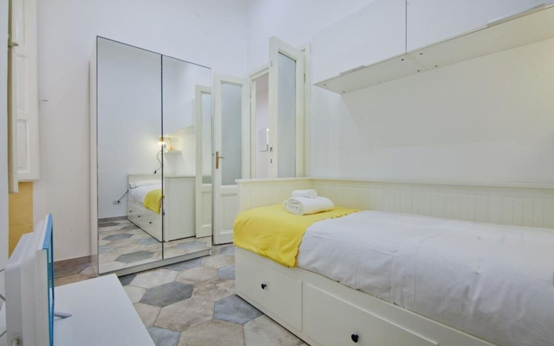 The bedroom, located to the right of the corridor, is furnished with a single bed and a wardrobe .