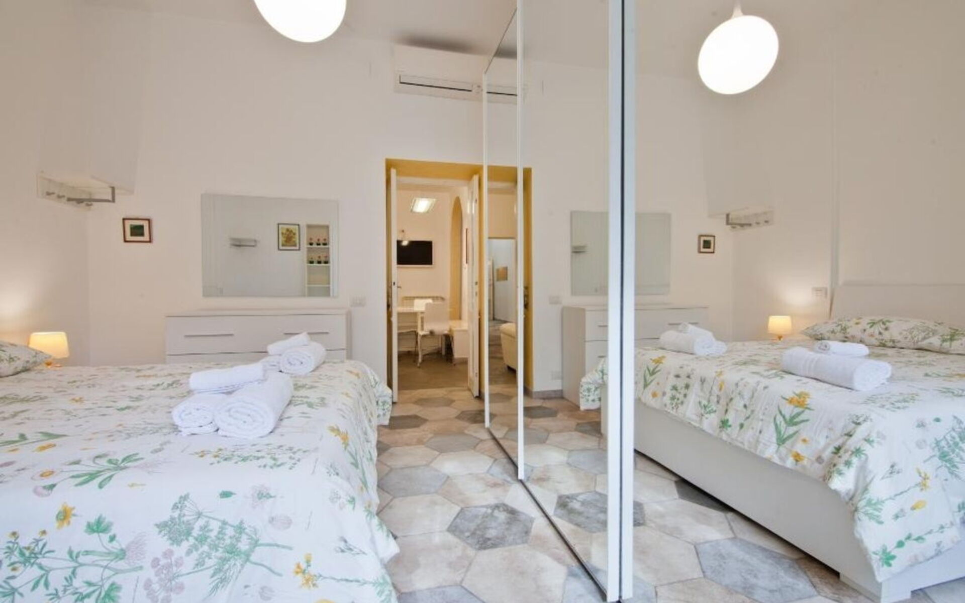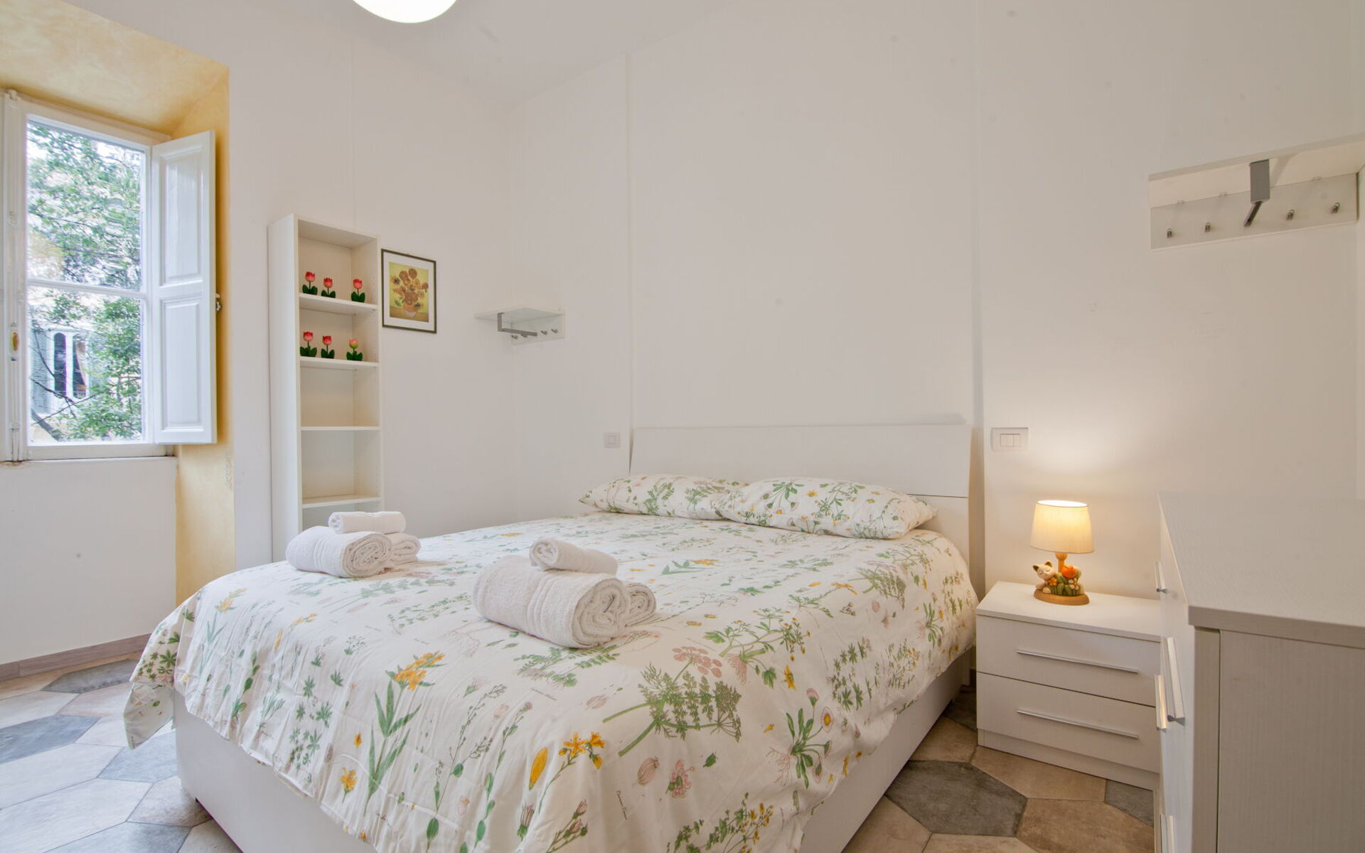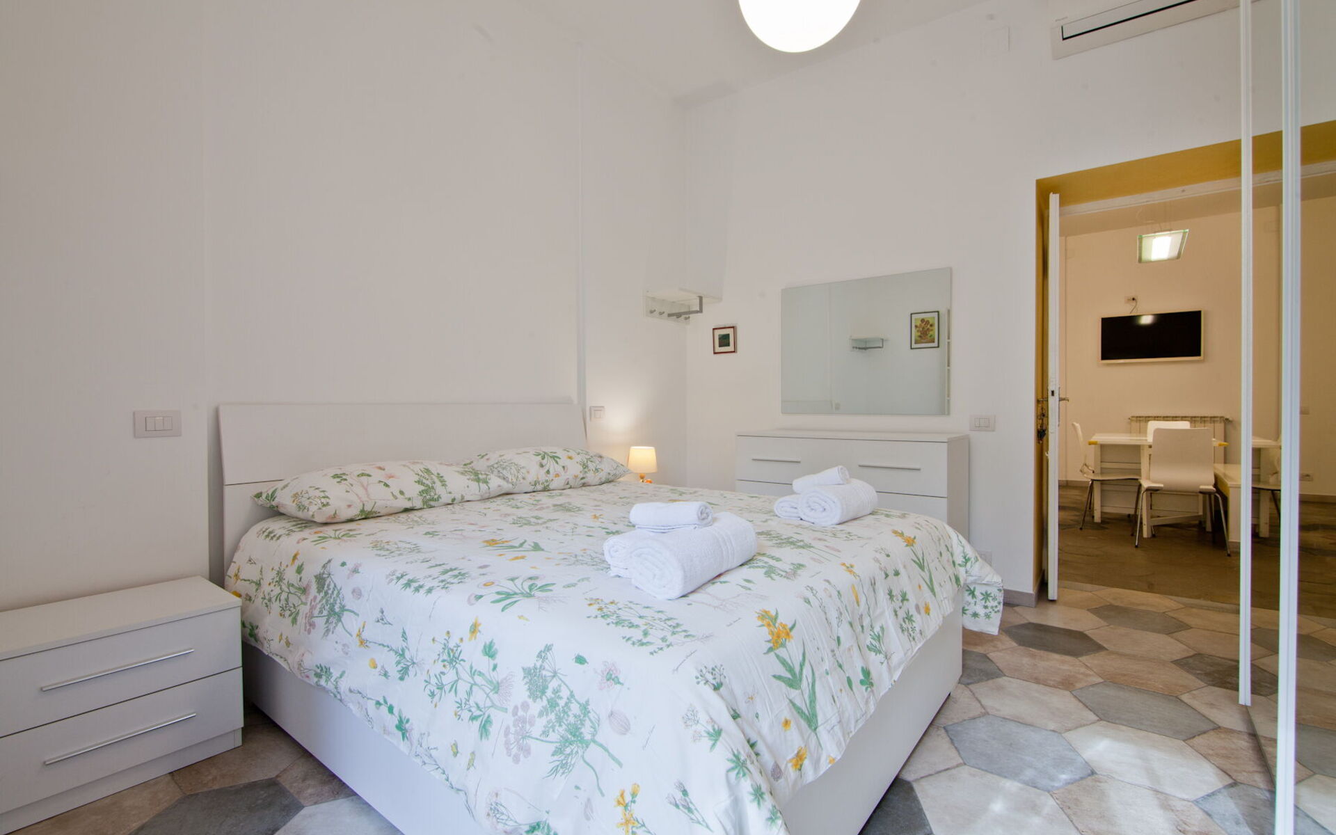 The second bedroom, which is also located to the left of the living room, is furnished with a double bed (160cm x 190cm), a chest of drawers, two bedside tables and a large wardrobe.