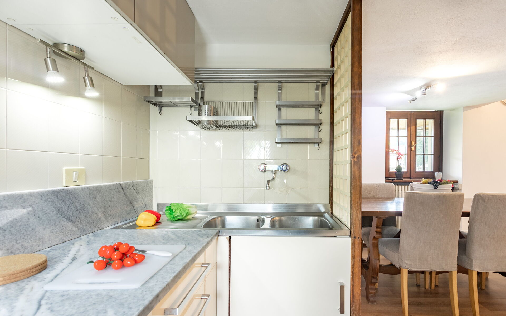 On the ground floor, you’ll find a cozy living area with a TV, dining table, and a well-equipped kitchen.