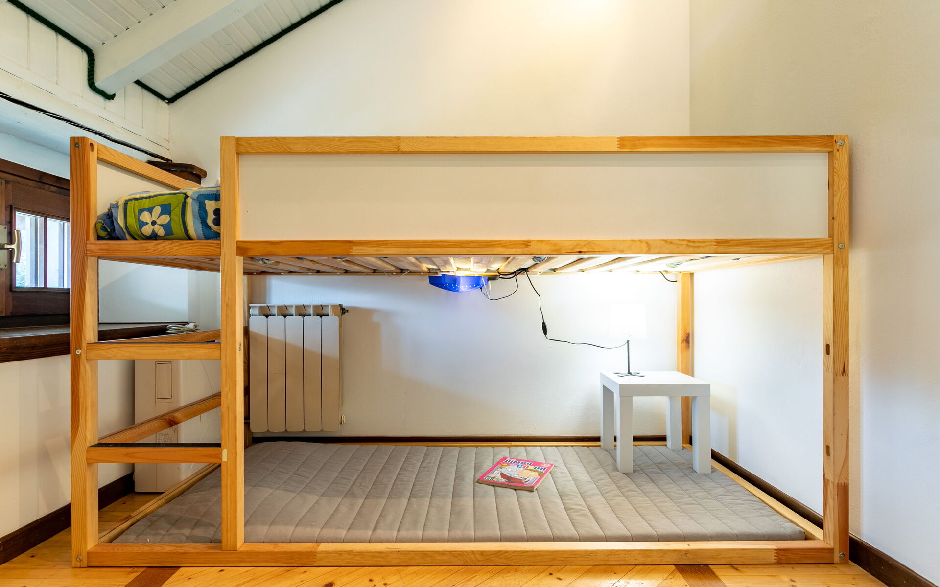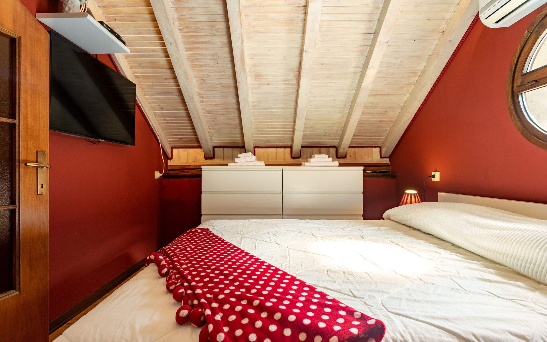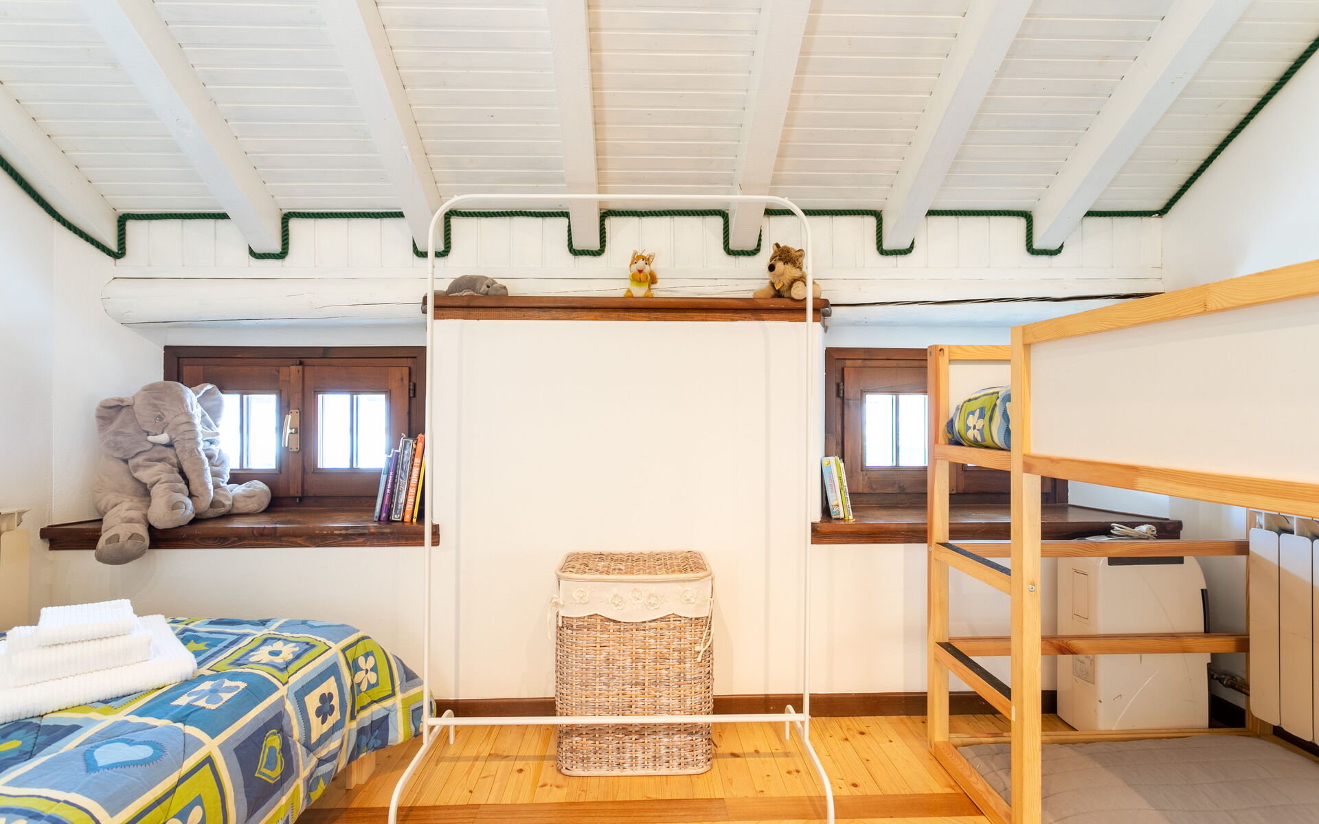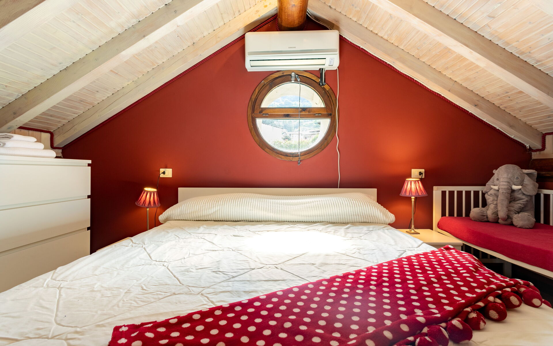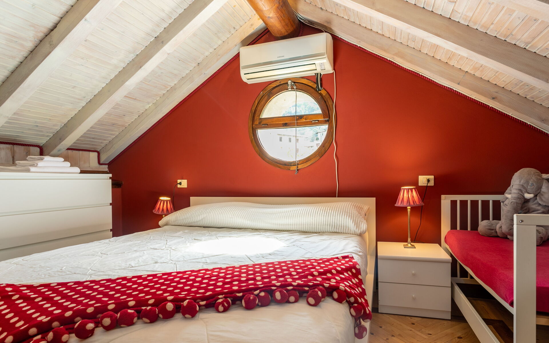 Upstairs are two comfortable bedrooms — one double room with air conditioning and one with twin single beds — along with a full bathroom.