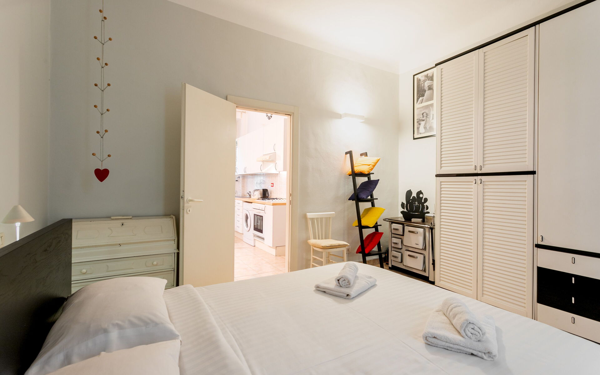 The bedroom is nicely furnished with a futon double bed, a 5-door closet, TV corner, chest of drawers and bookcase.
