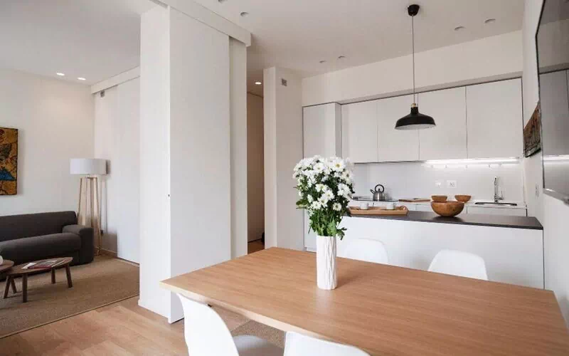 A part of the living area, separated by sliding doors, can be used as a second bedroom, since it is furnished with a sleeper sofa that turns into two comfortable single beds.
