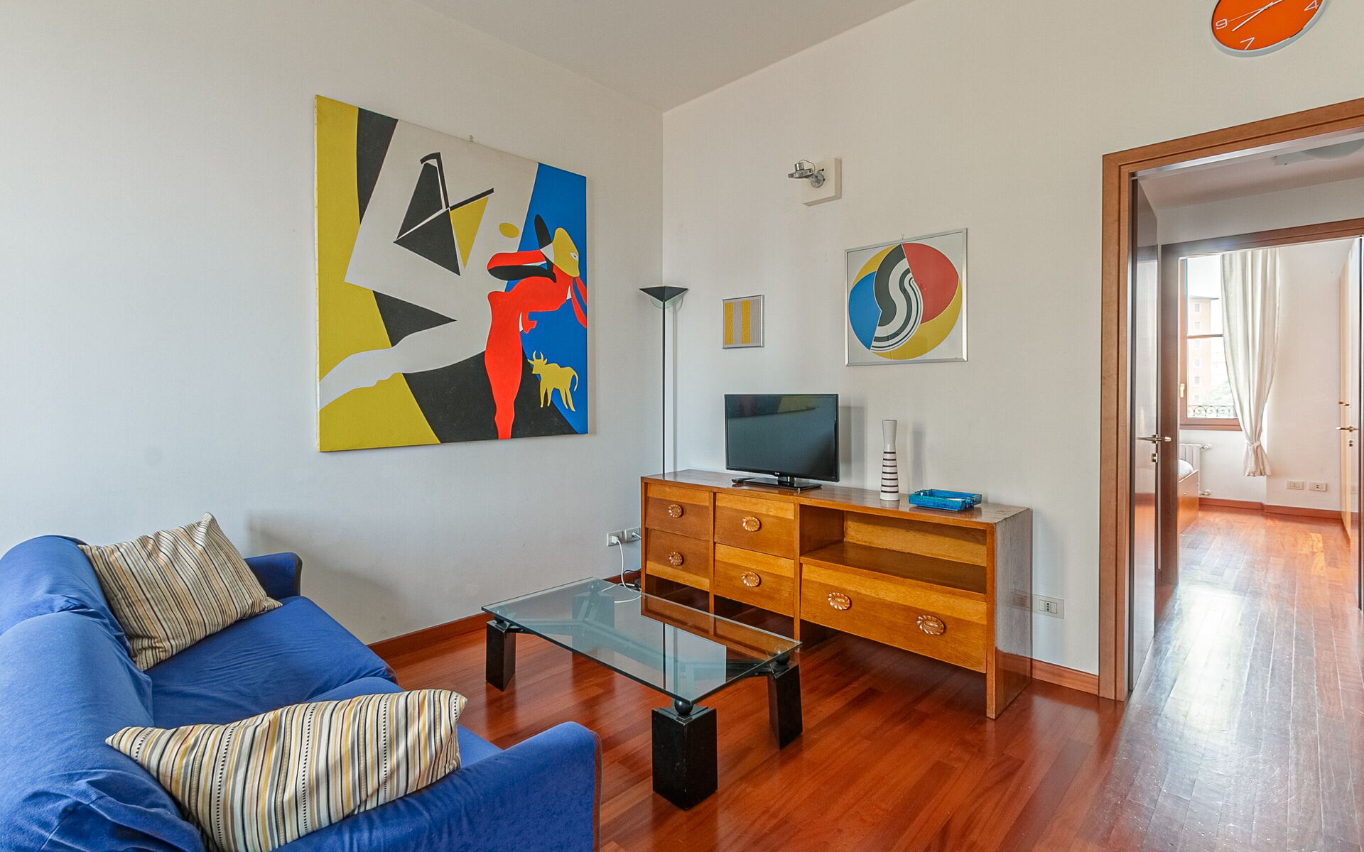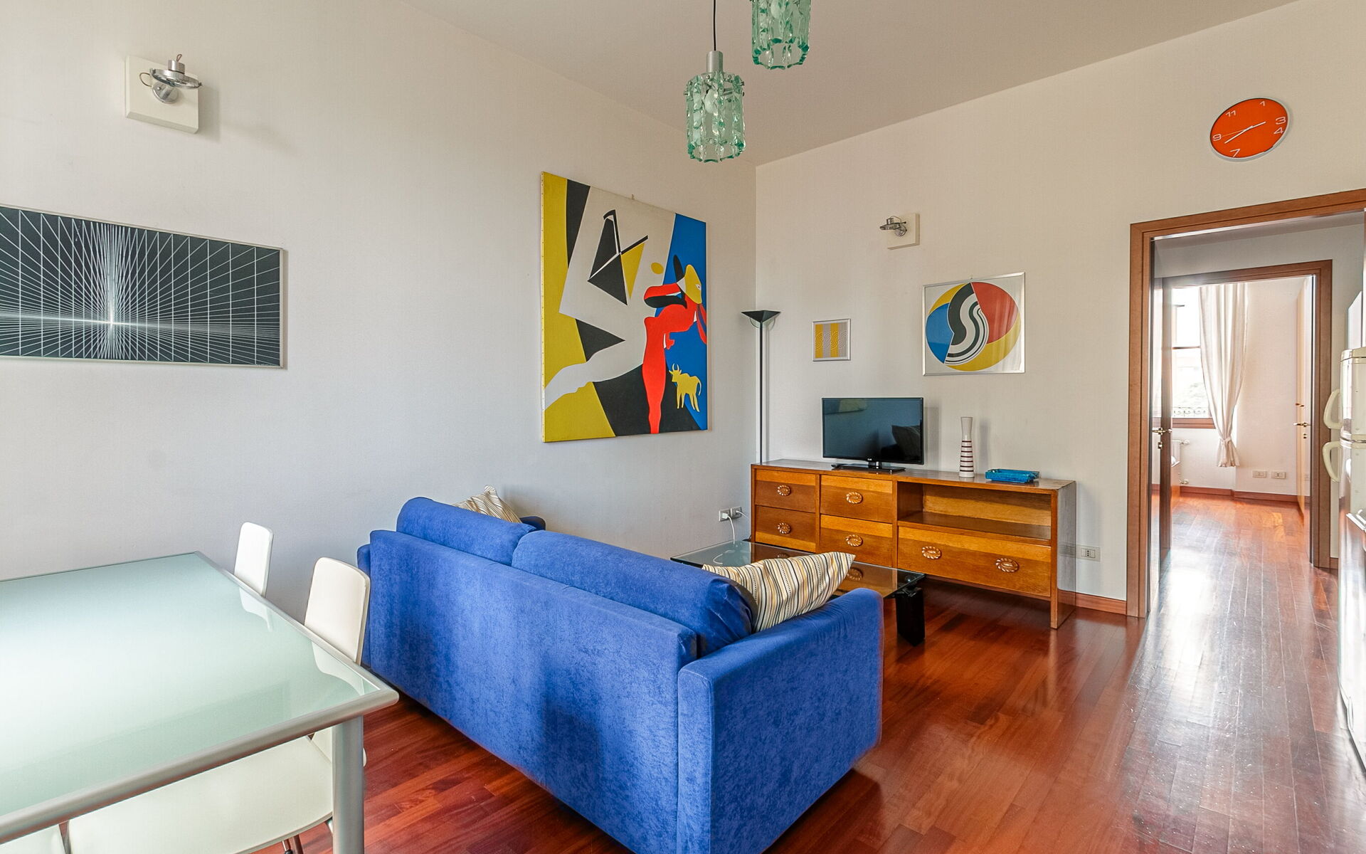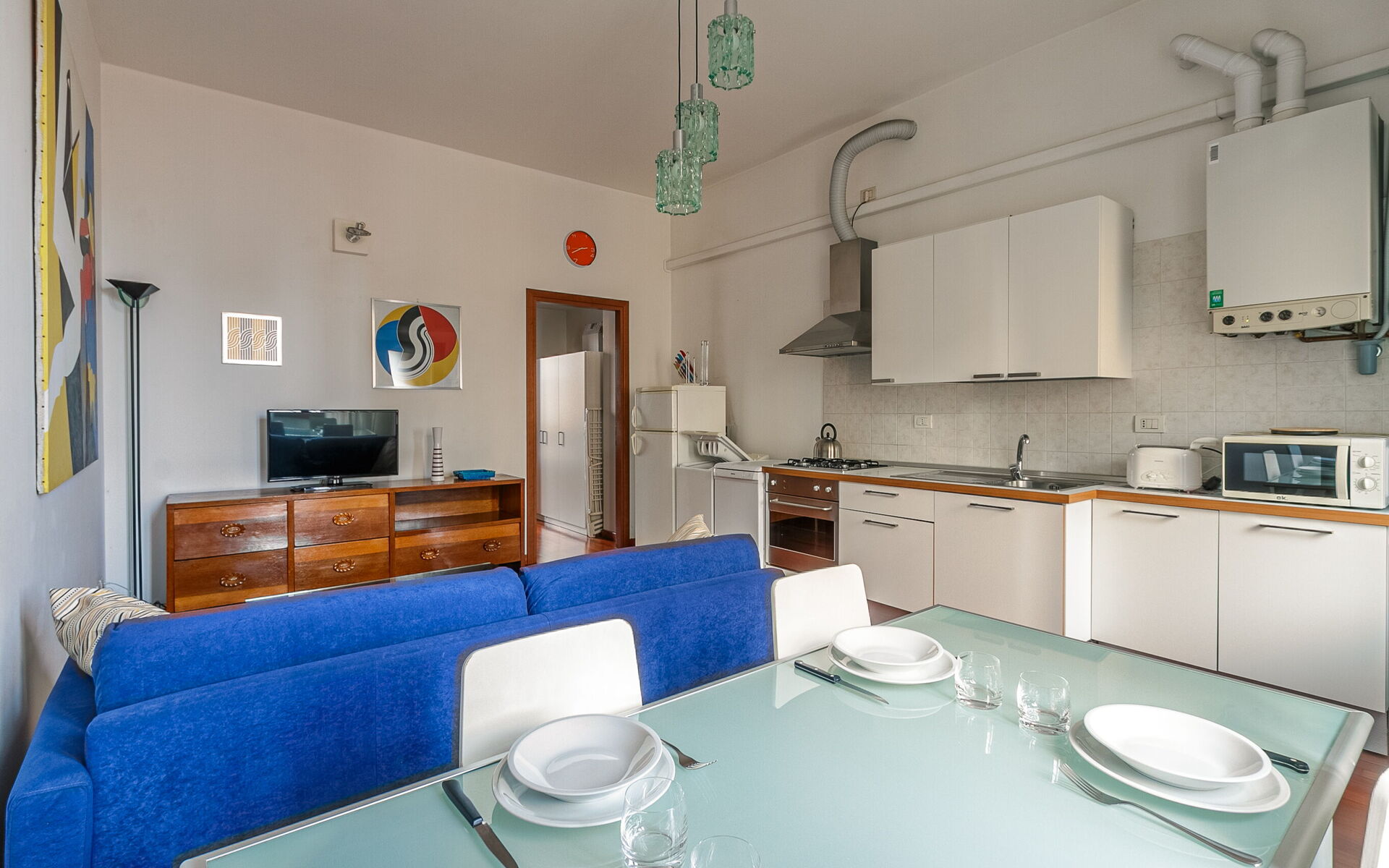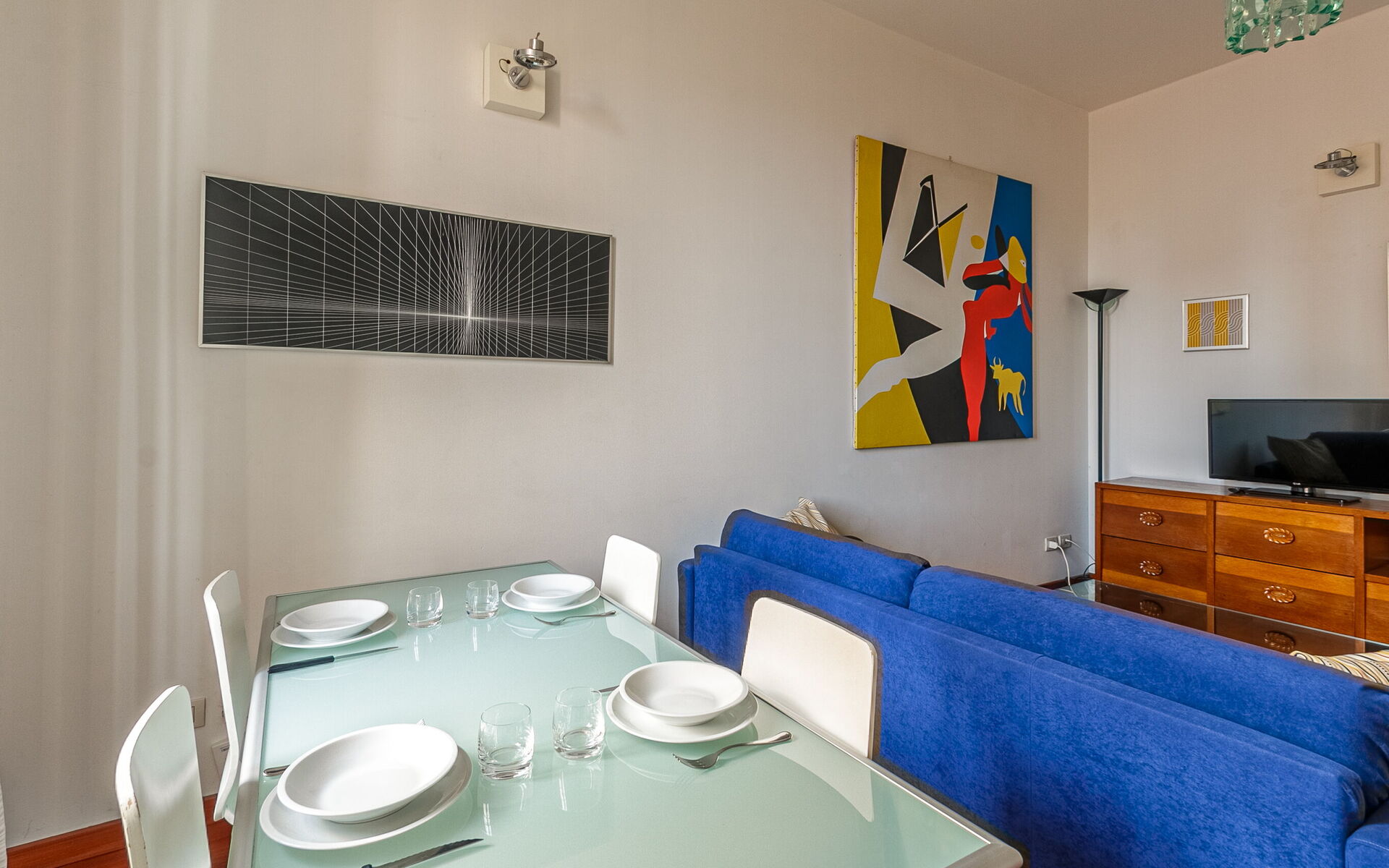 Entering you enter the living area where we find a table for 4 people, the television area and the double sofa bed with 2 seats.