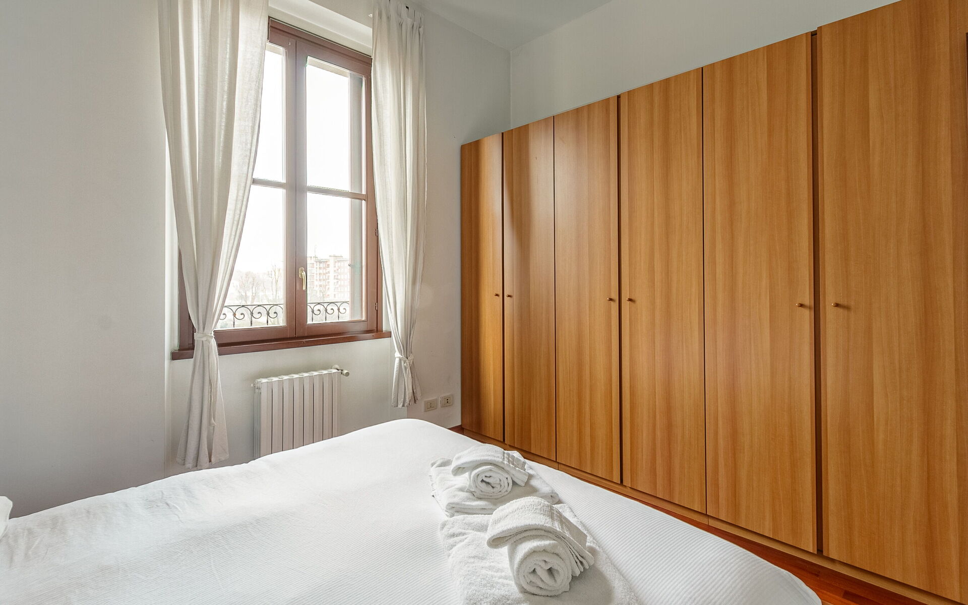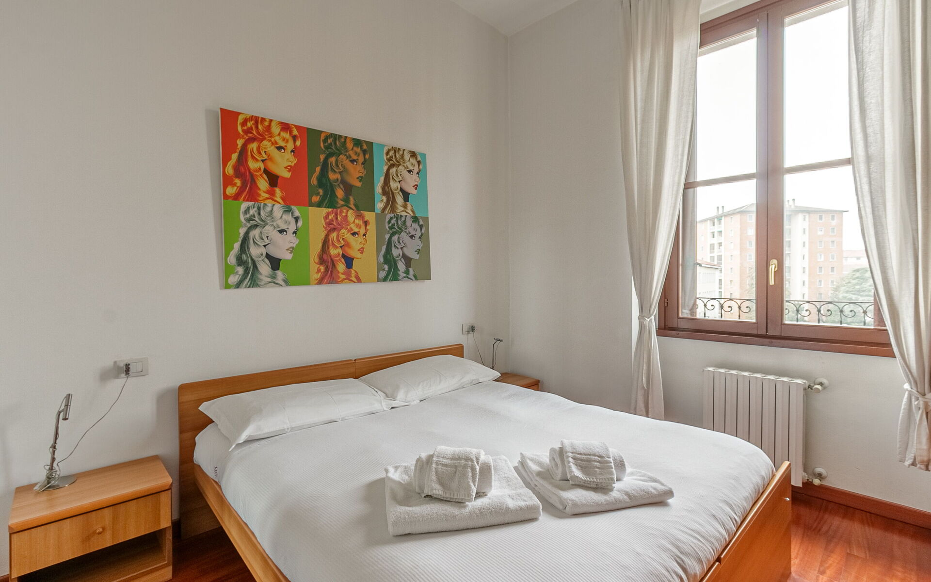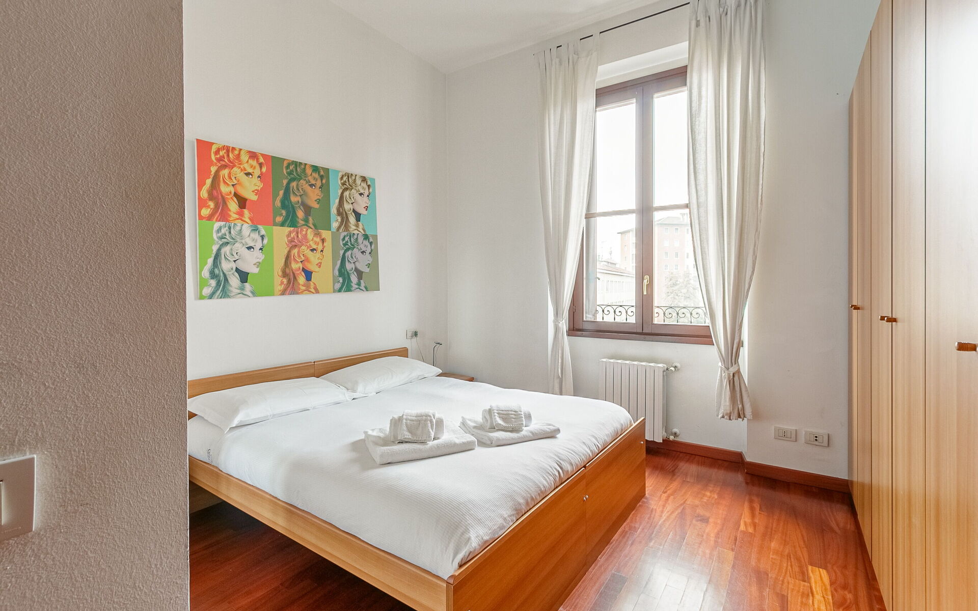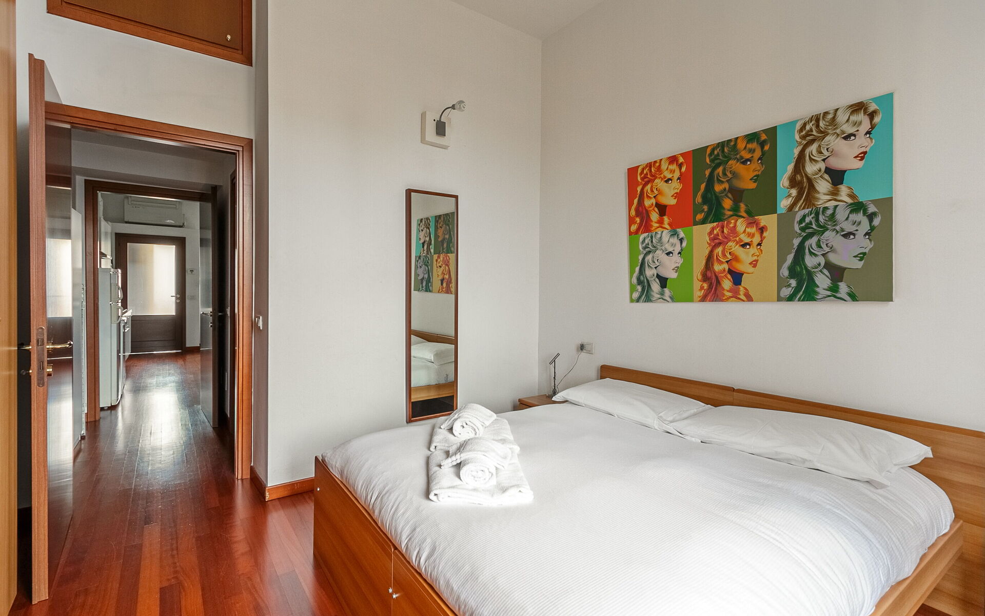 The bedroom has a double bed, bedside tables with lamps and a comfortable 6-door wardrobe.