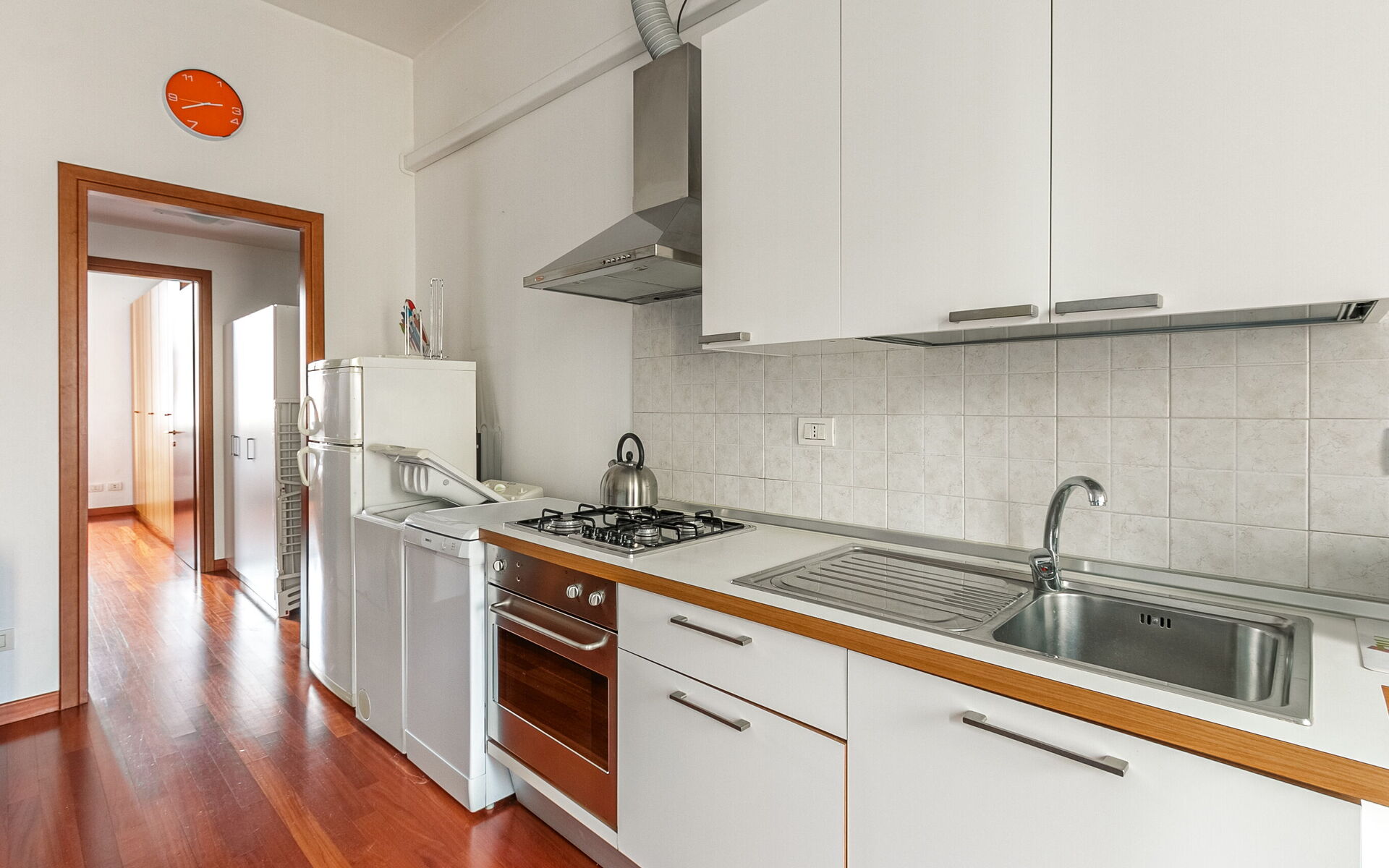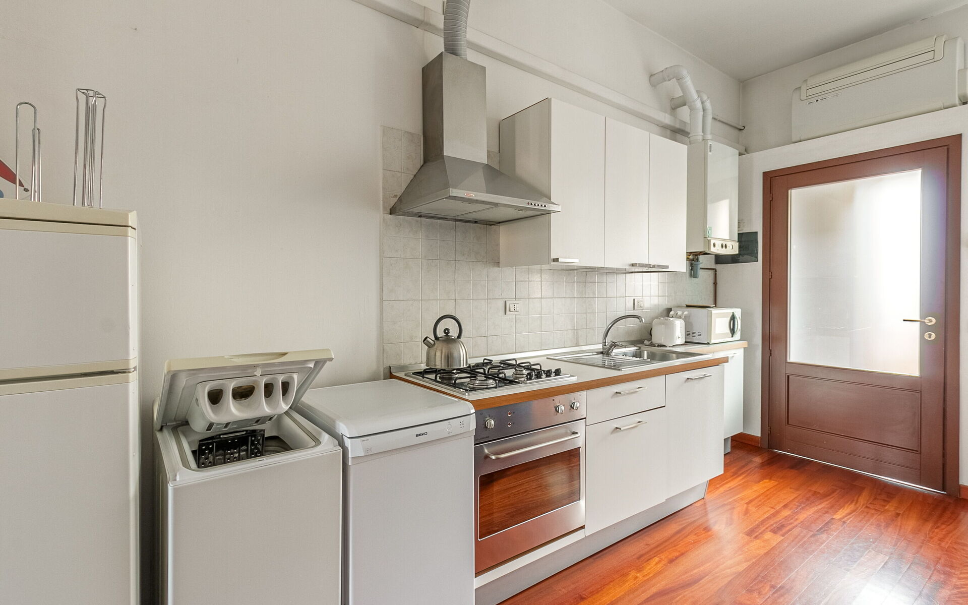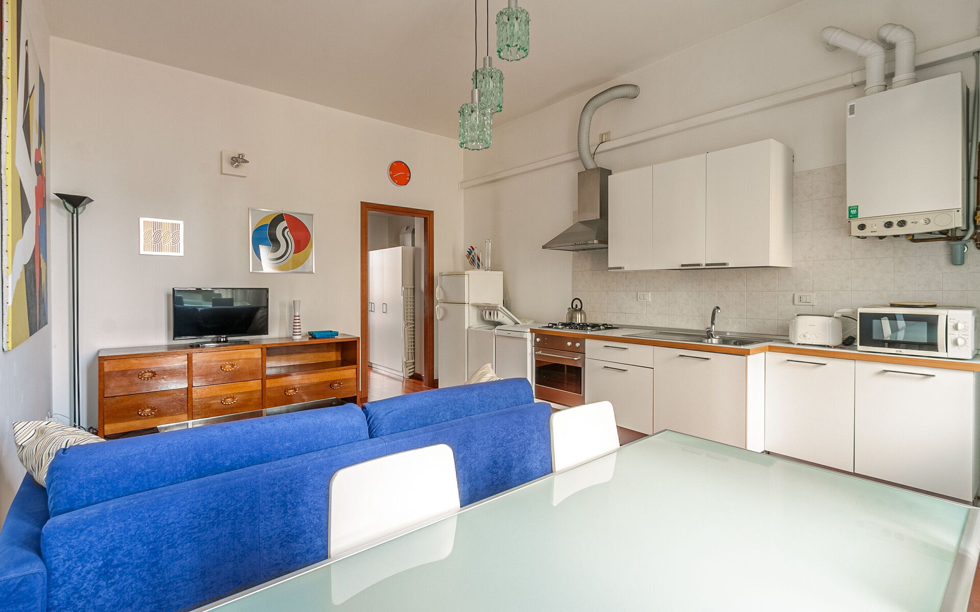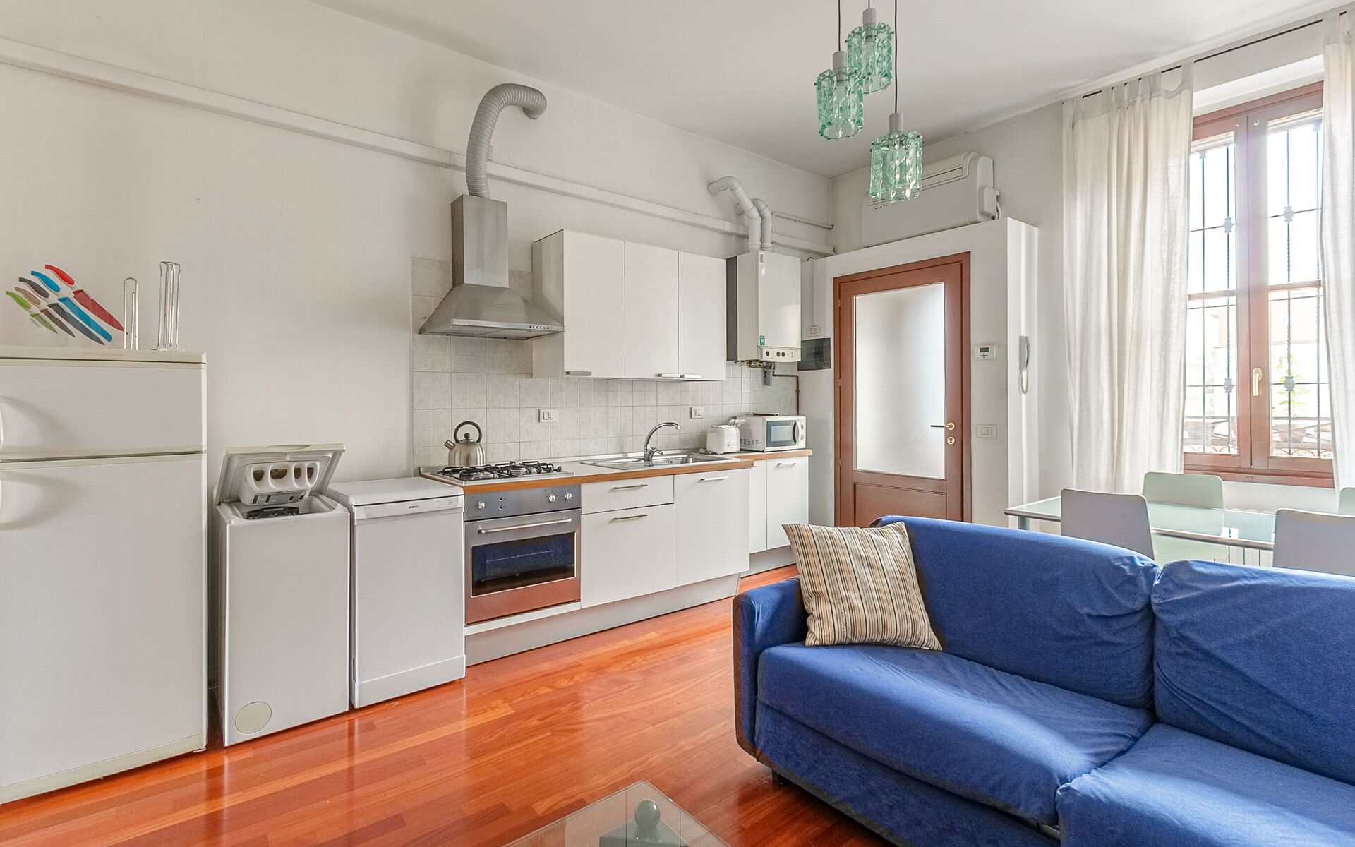 The open kitchen is fully equipped with a fridge, freezer, dishwasher, washing machine, microwave and toaster.