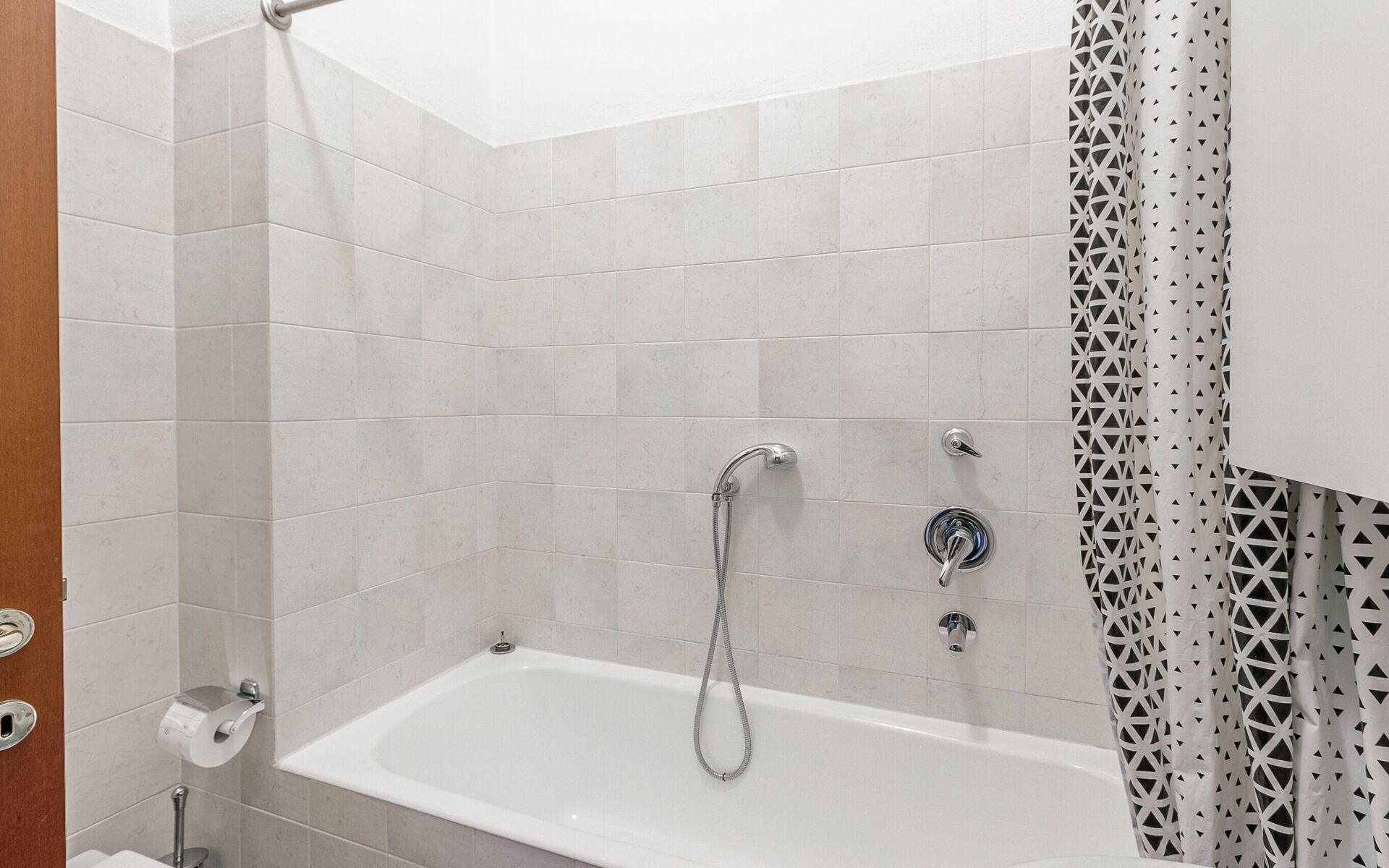 We then find a hallway that leads to the sleeping area. The blind bathroom has a bathtub, toilet, bidet and sink.