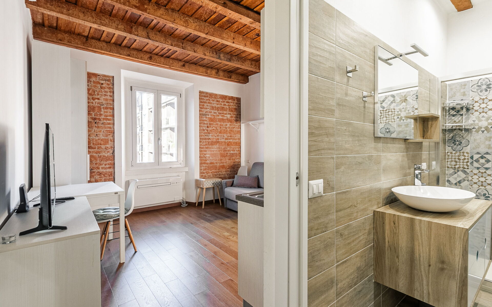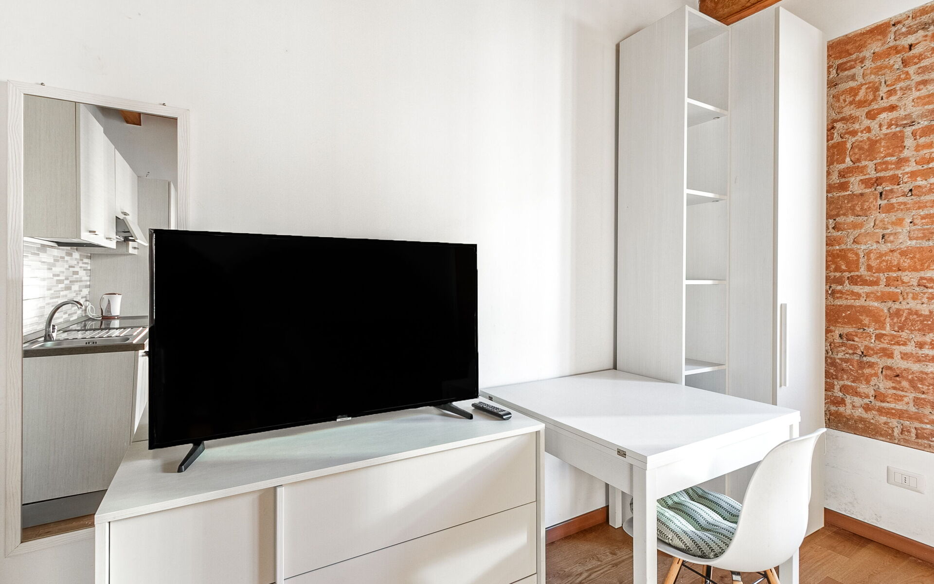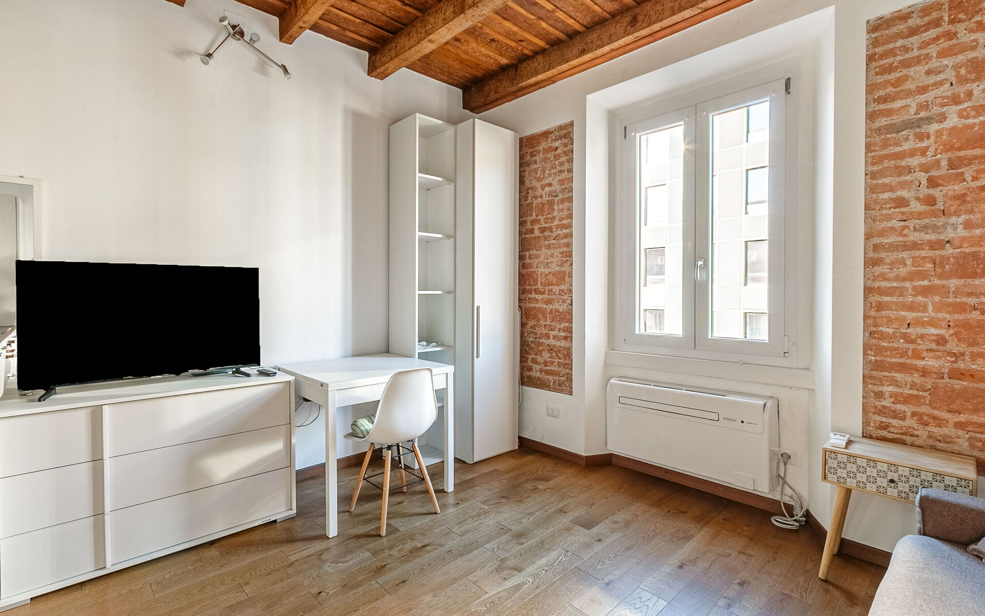 Entering you enter the single room in which we find a comfortable French sofa bed, the TV area with a 50-inch smart TV, a table for 2 people, a wardrobe and a chest of drawers.