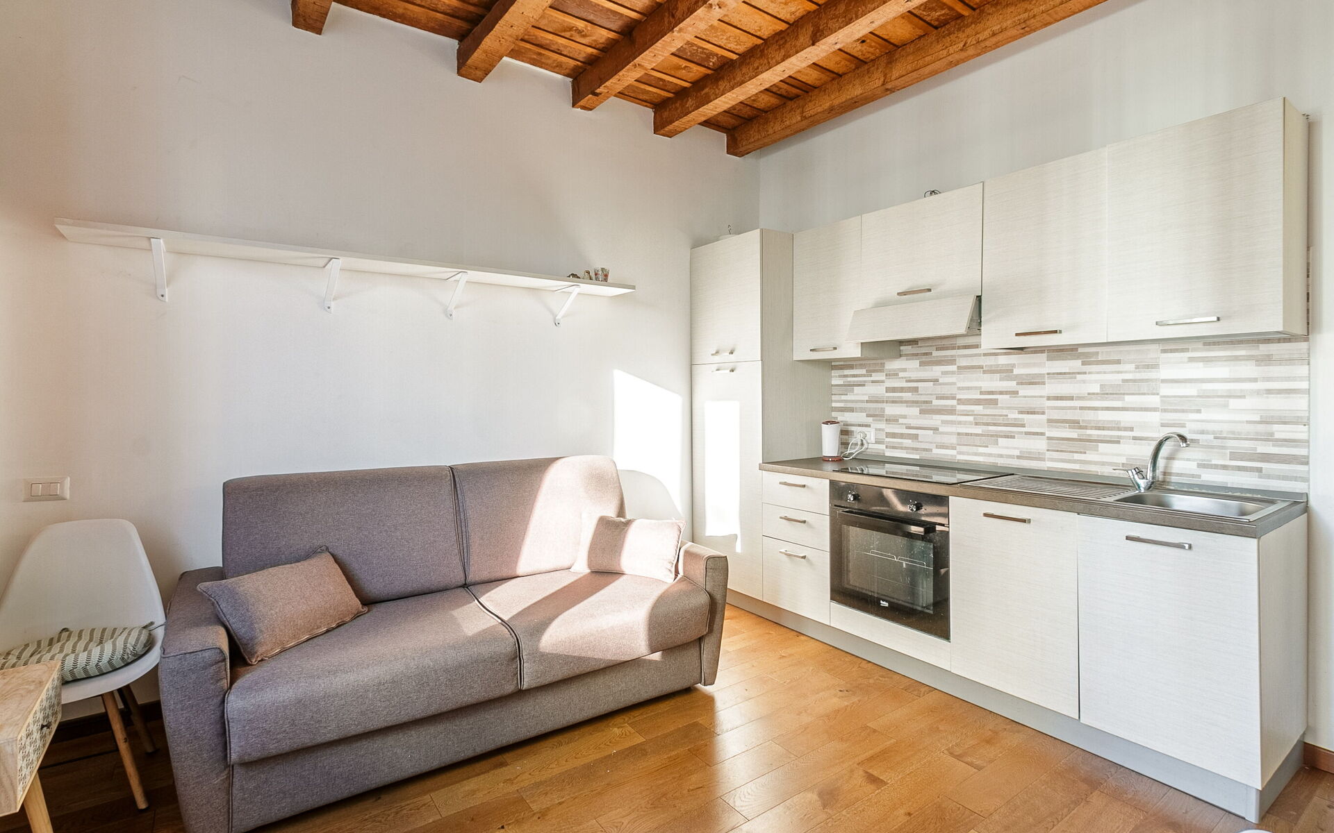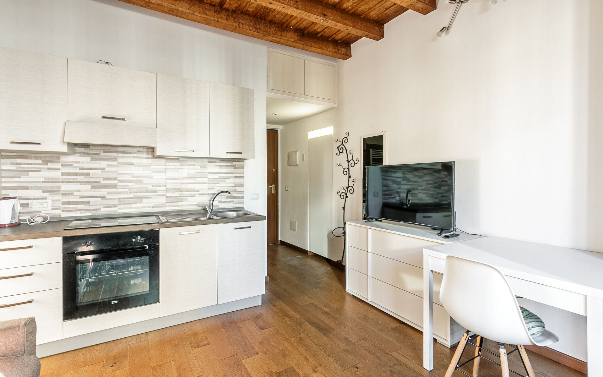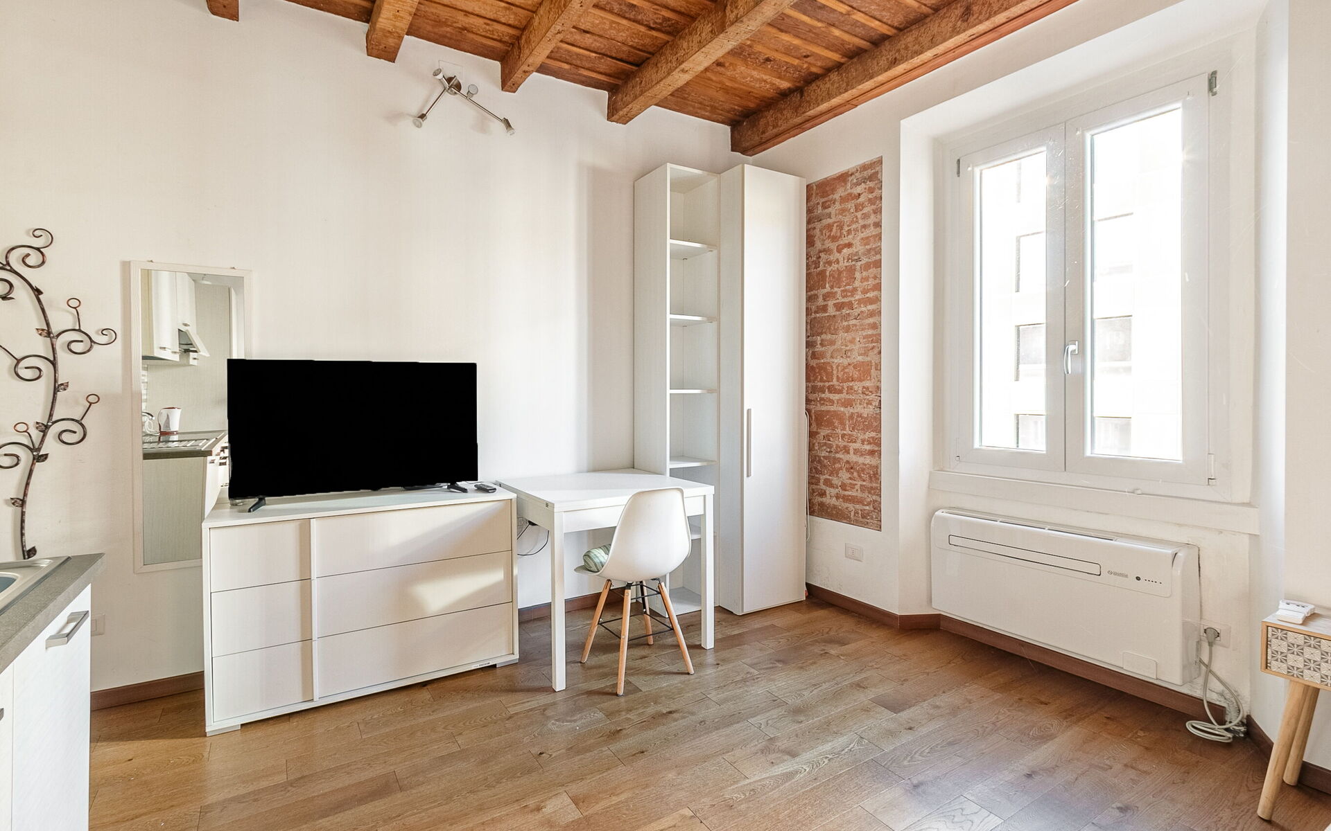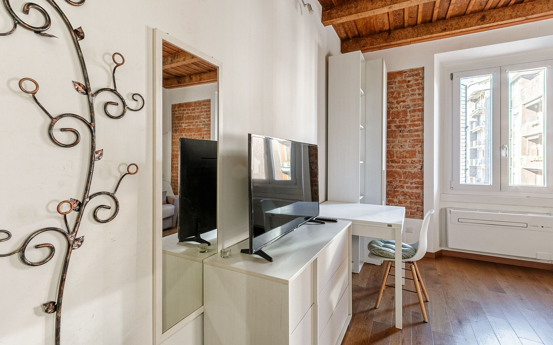 Entering you enter the single room in which we find a comfortable French sofa bed, the TV area with a 50-inch smart TV, a table for 2 people, a wardrobe and a chest of drawers.