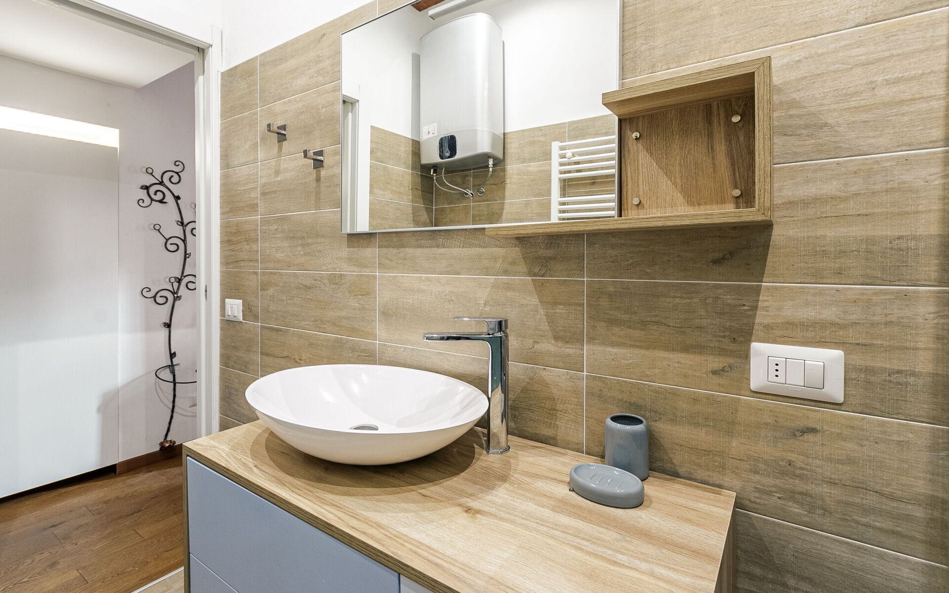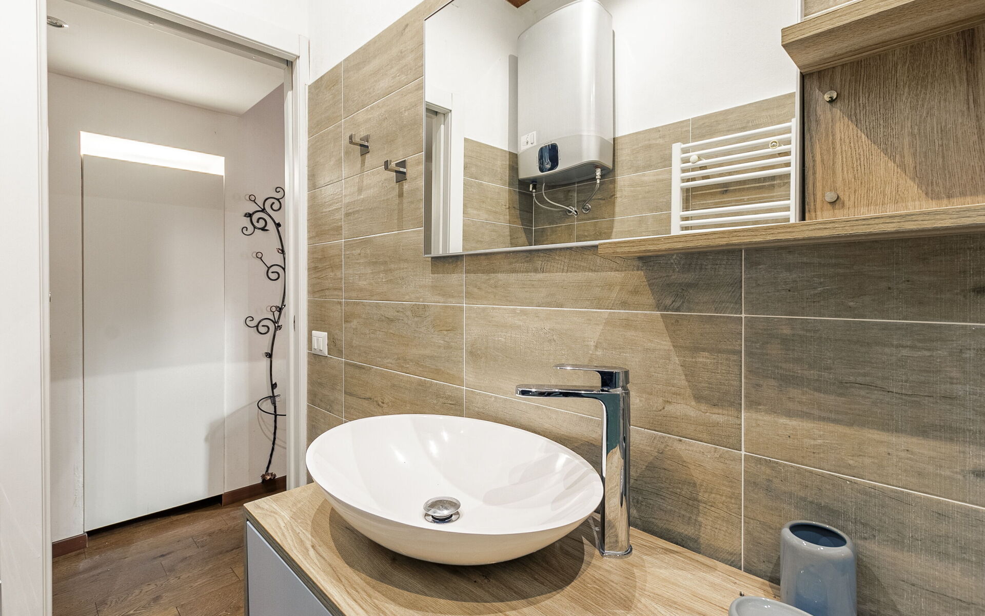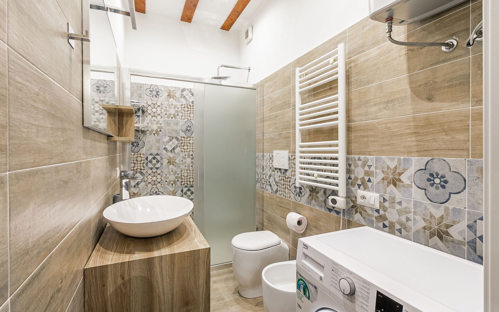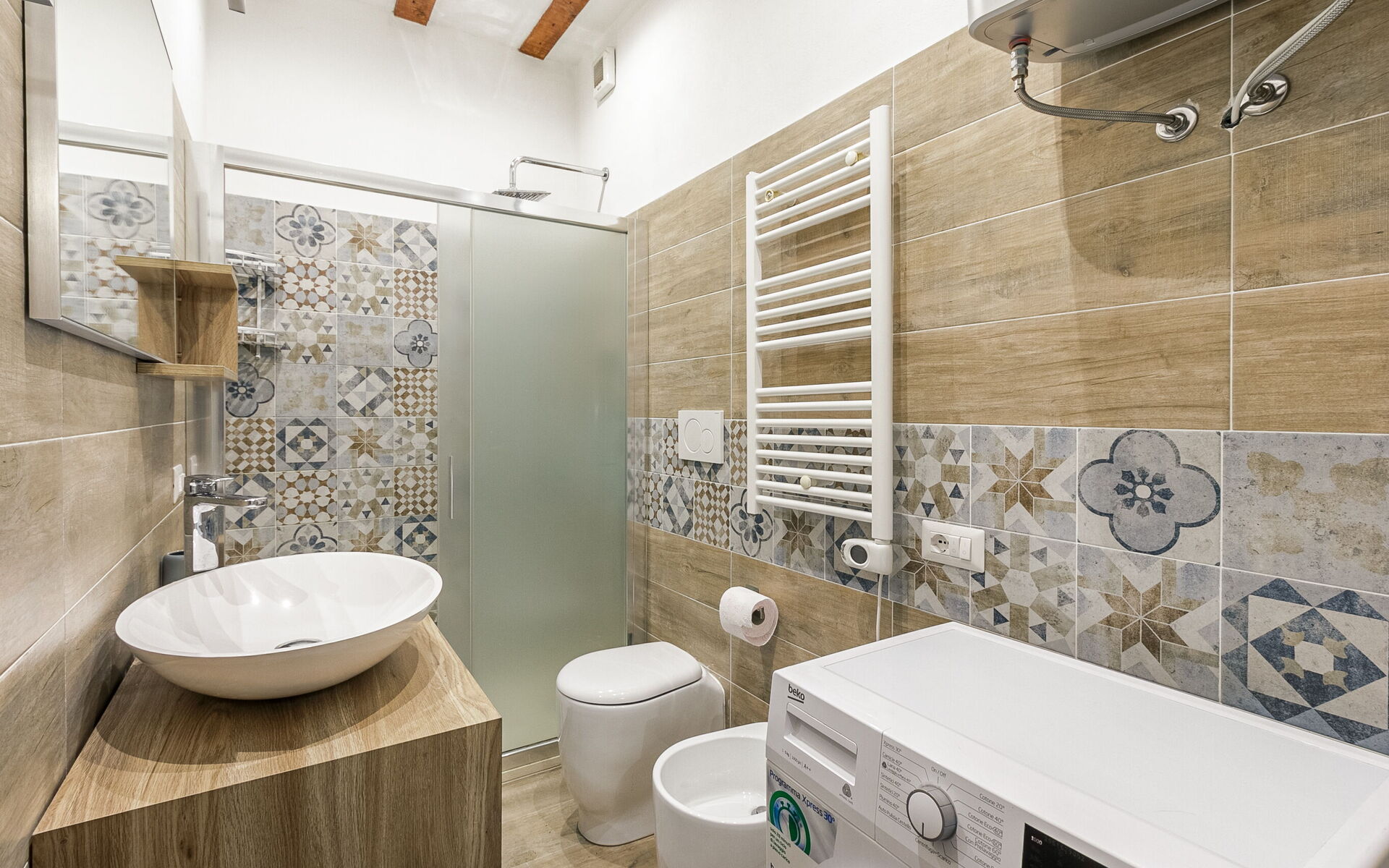 In front of the bathroom equipped with washing machine, sink, bidet, toilet and large shower, we find a small closet.