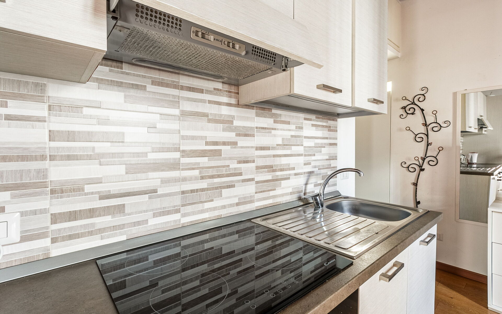 The kitchen is complete with fridge, freezer, oven, induction hob and kettle.