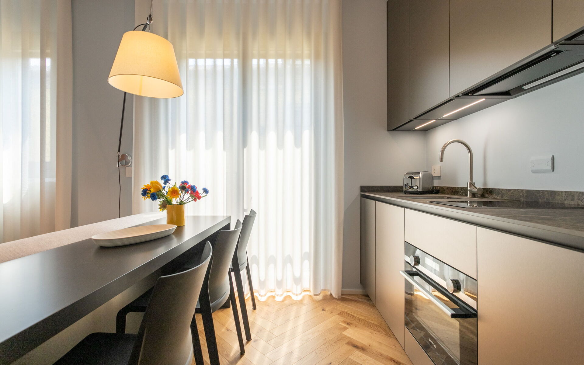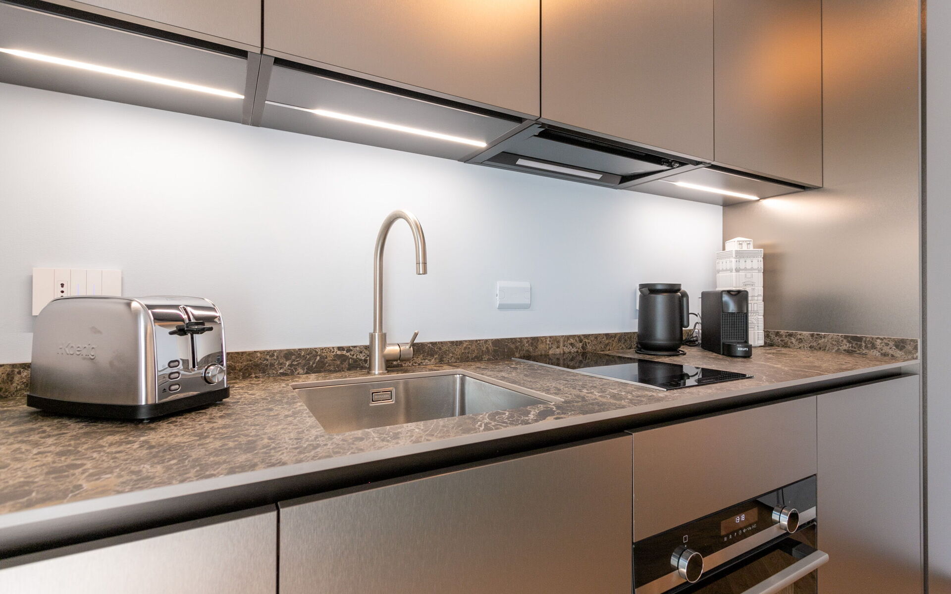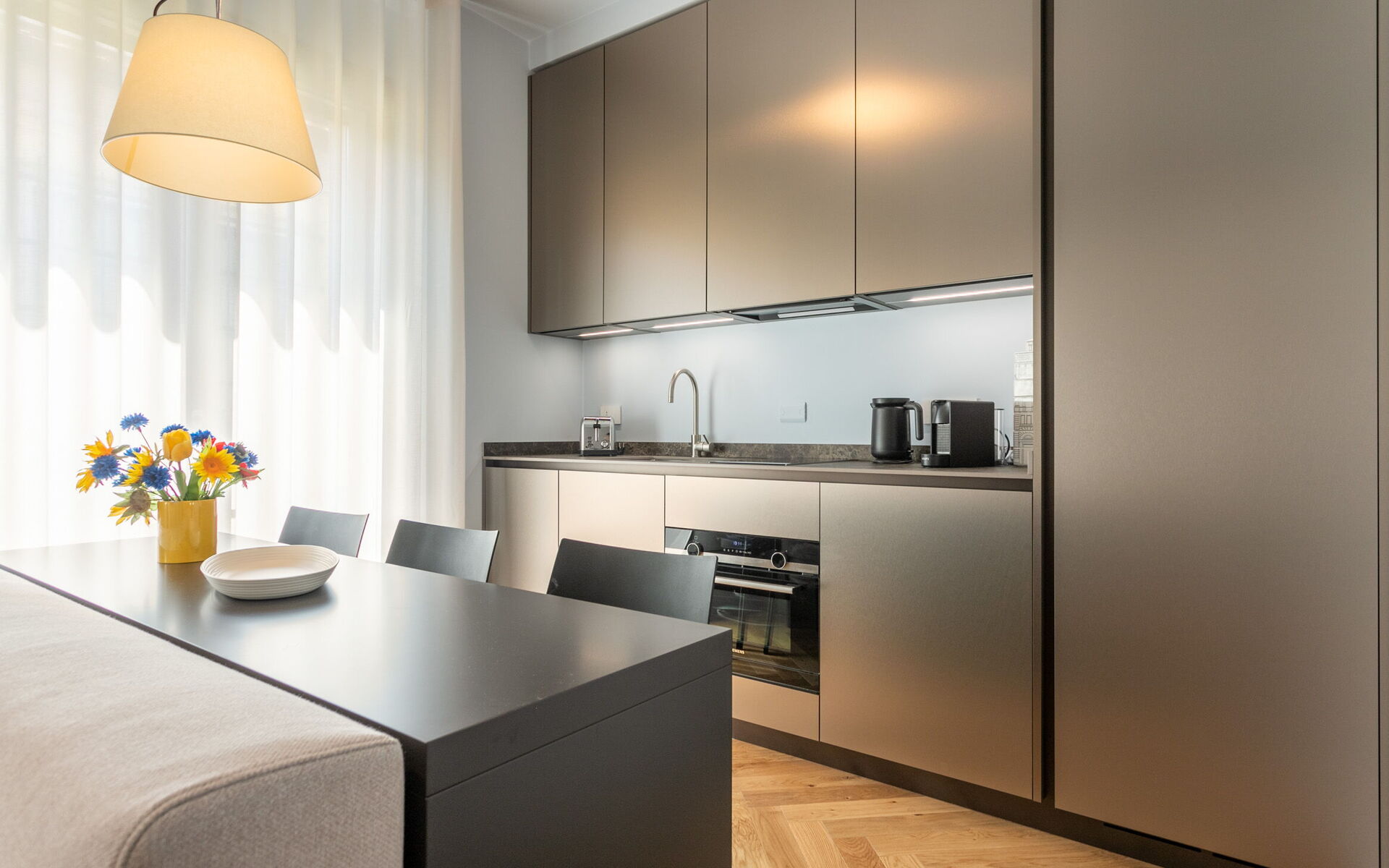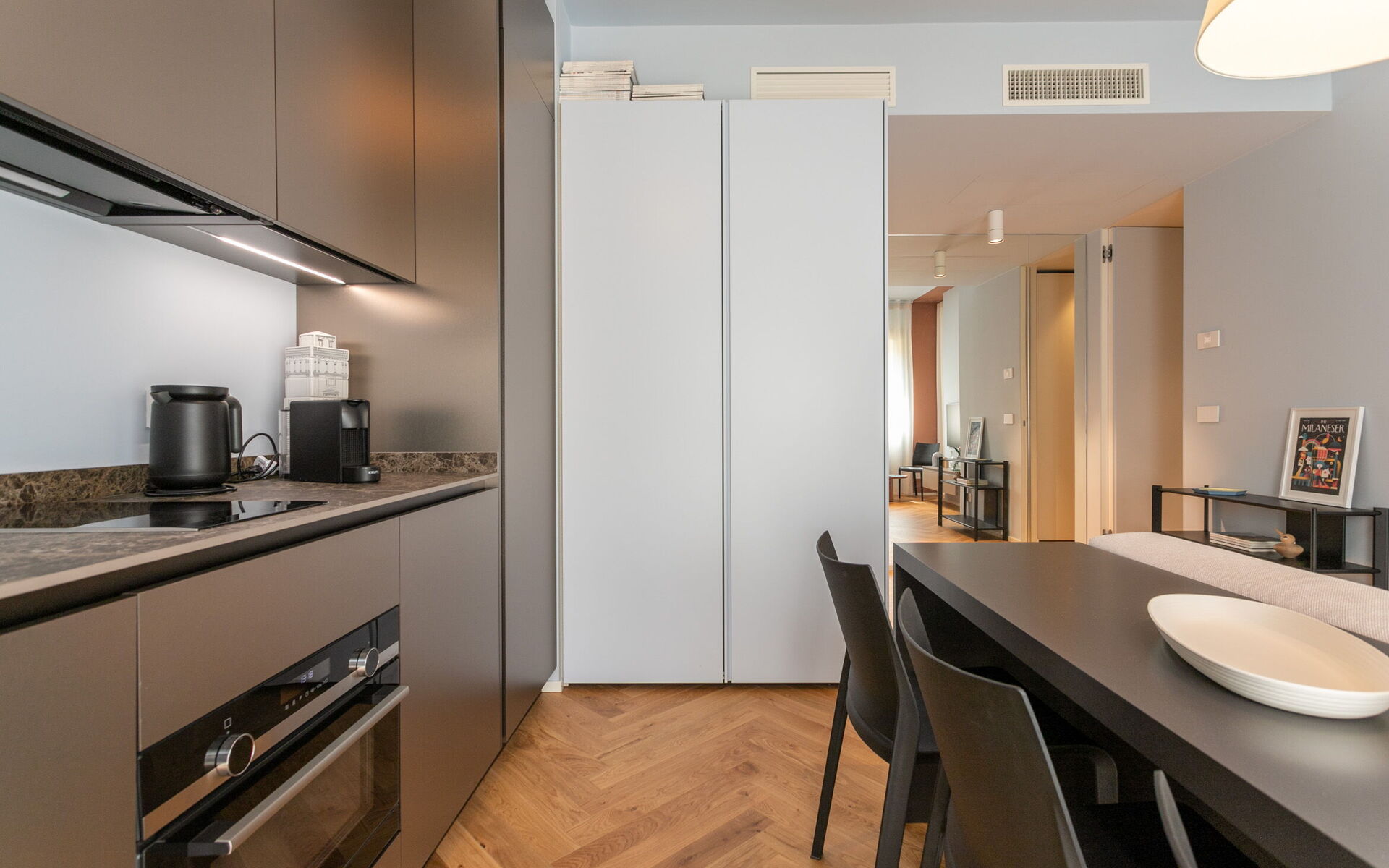 The open kitchen has a refrigerator, freezer, dishwasher, traditional combined oven and microwave, two-burner induction hob and coffee machine.