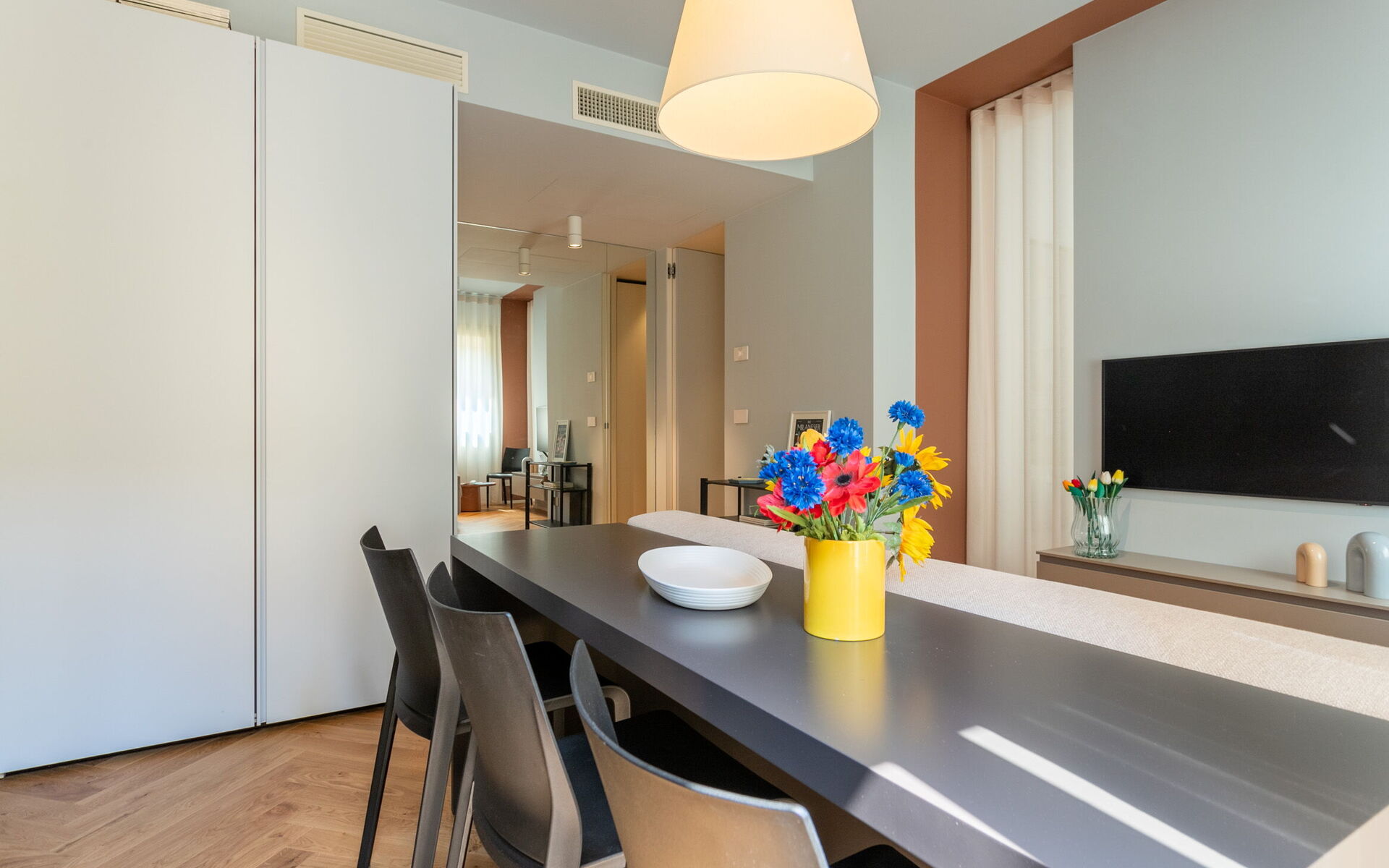 Upon entering you access the living area with a two-seater sofa, 43-inch smart TV and a table for 3 people.