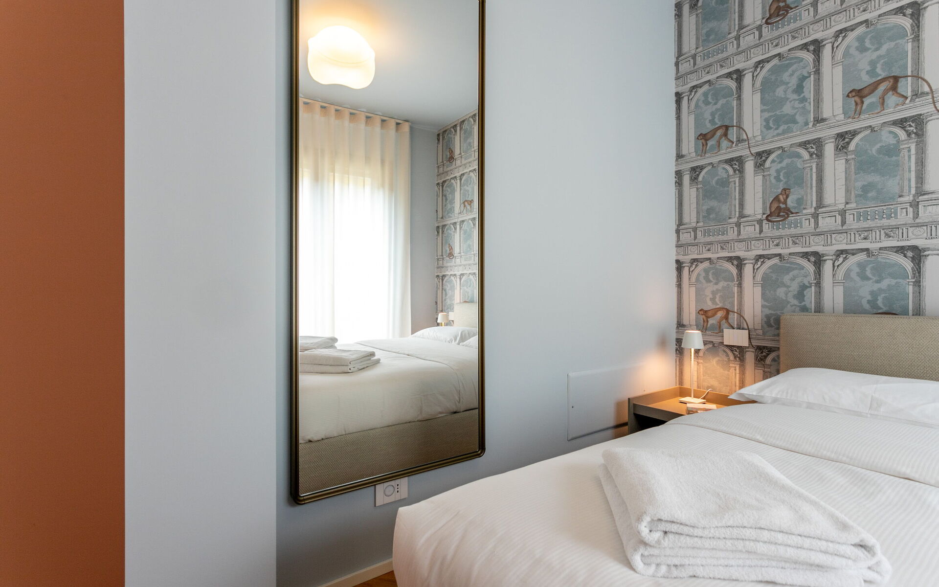 The sleeping area is equipped with a double bed, bedside tables, lamps and a full-length mirror.