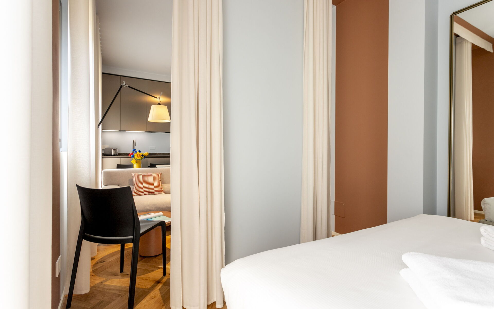 The sleeping area is equipped with a double bed, bedside tables, lamps, and a full-length mirror.