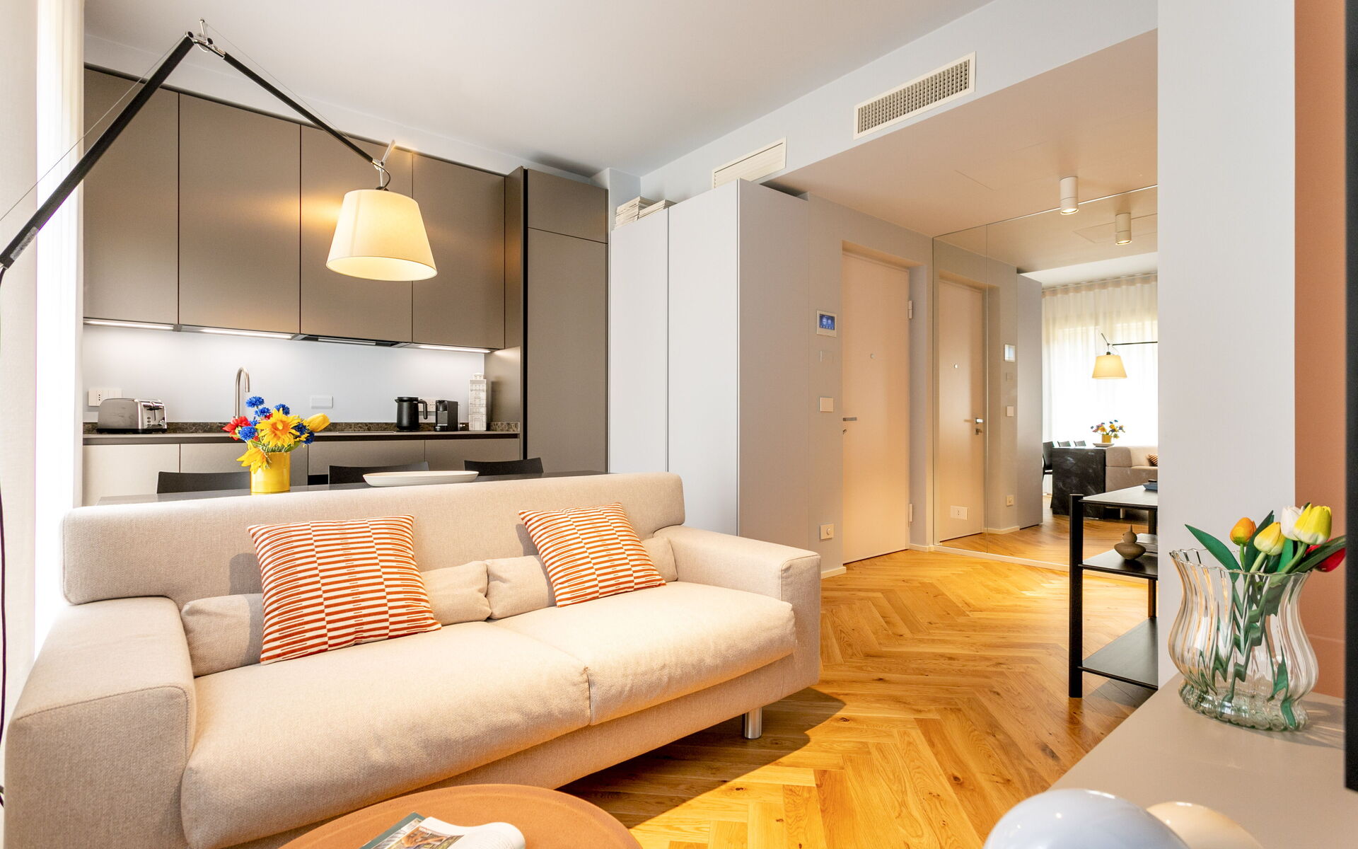 The open kitchen is complete with refrigerator, freezer, dishwasher, traditional combined oven and microwave, two-burner induction hob and coffee machine.
