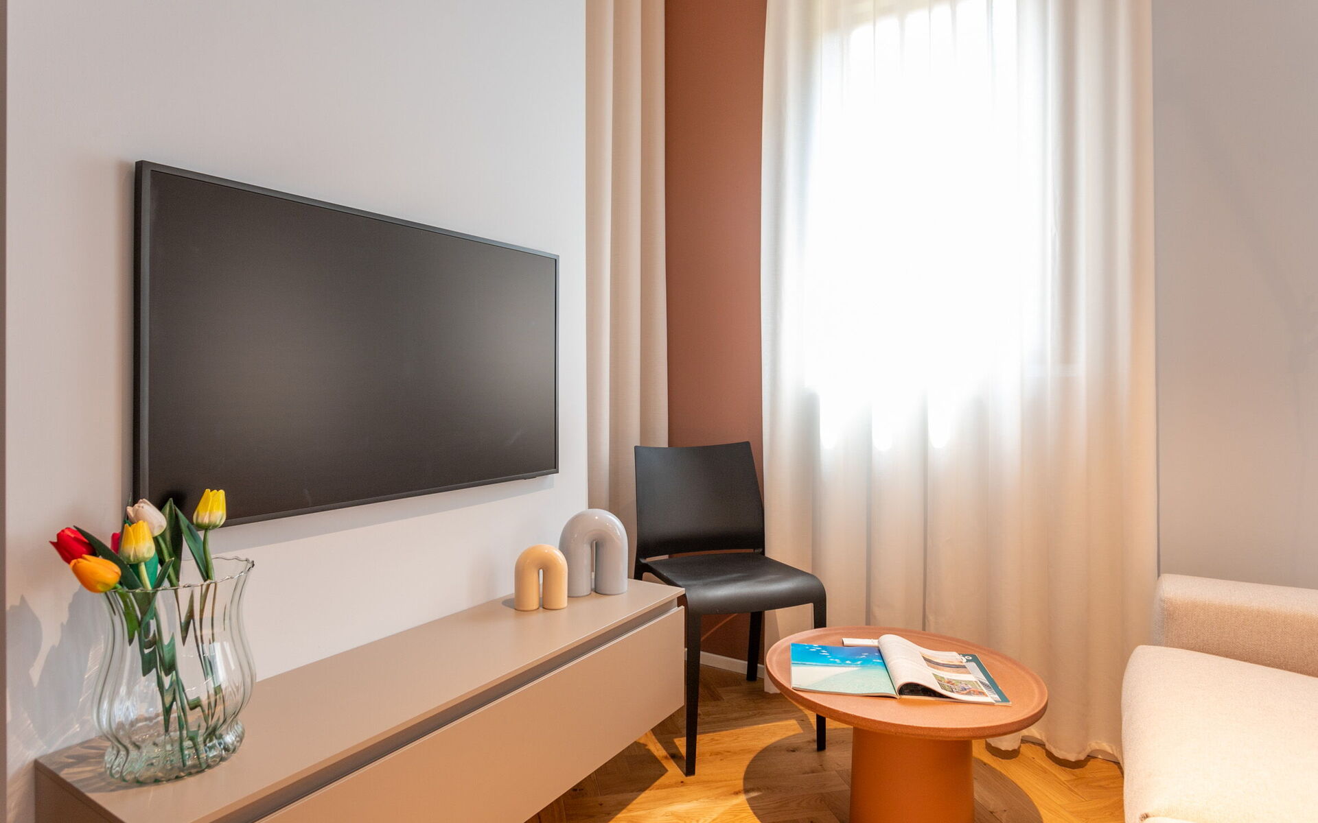 Upon entering you access the living area with a two-seater sofa, 43-inch smart TV, and a table for 3 people.