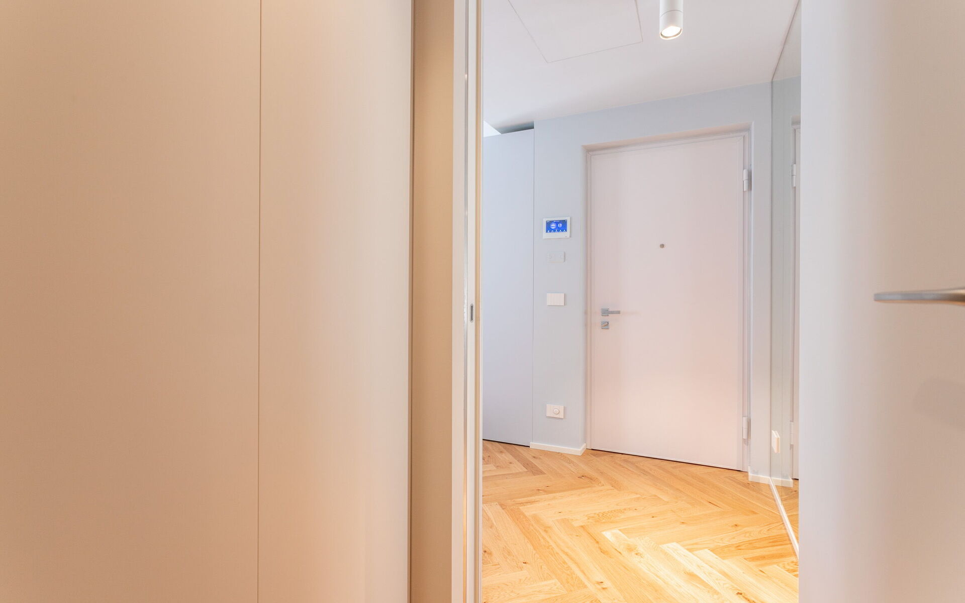 The apartment has a centralized heating and cooling system, a home automation system for controlling lights and shutters, and parquet flooring.