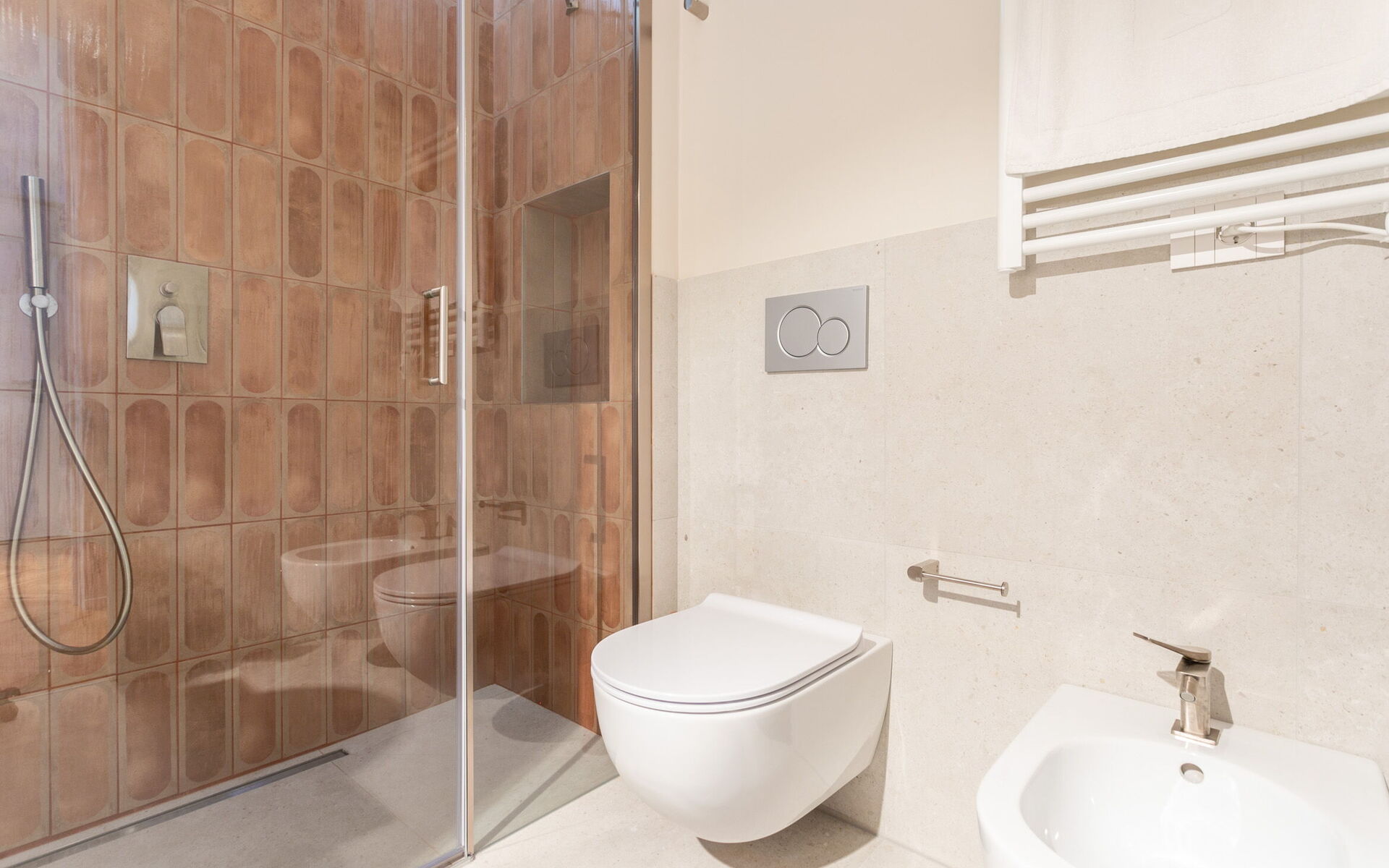 The antebathroom has a laundry area with washing machine and dryer while the bathroom is equipped with a large shower, toilet, bidet and sink.