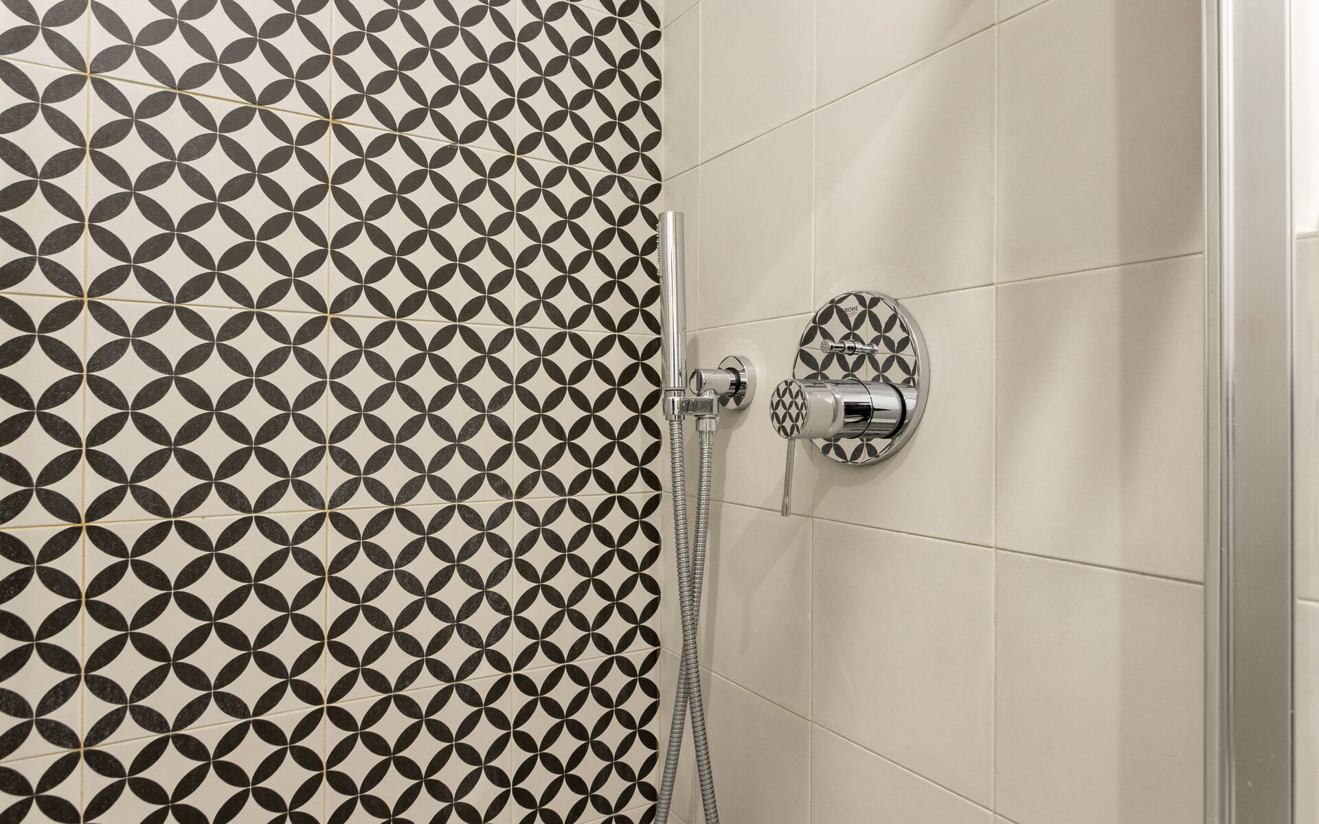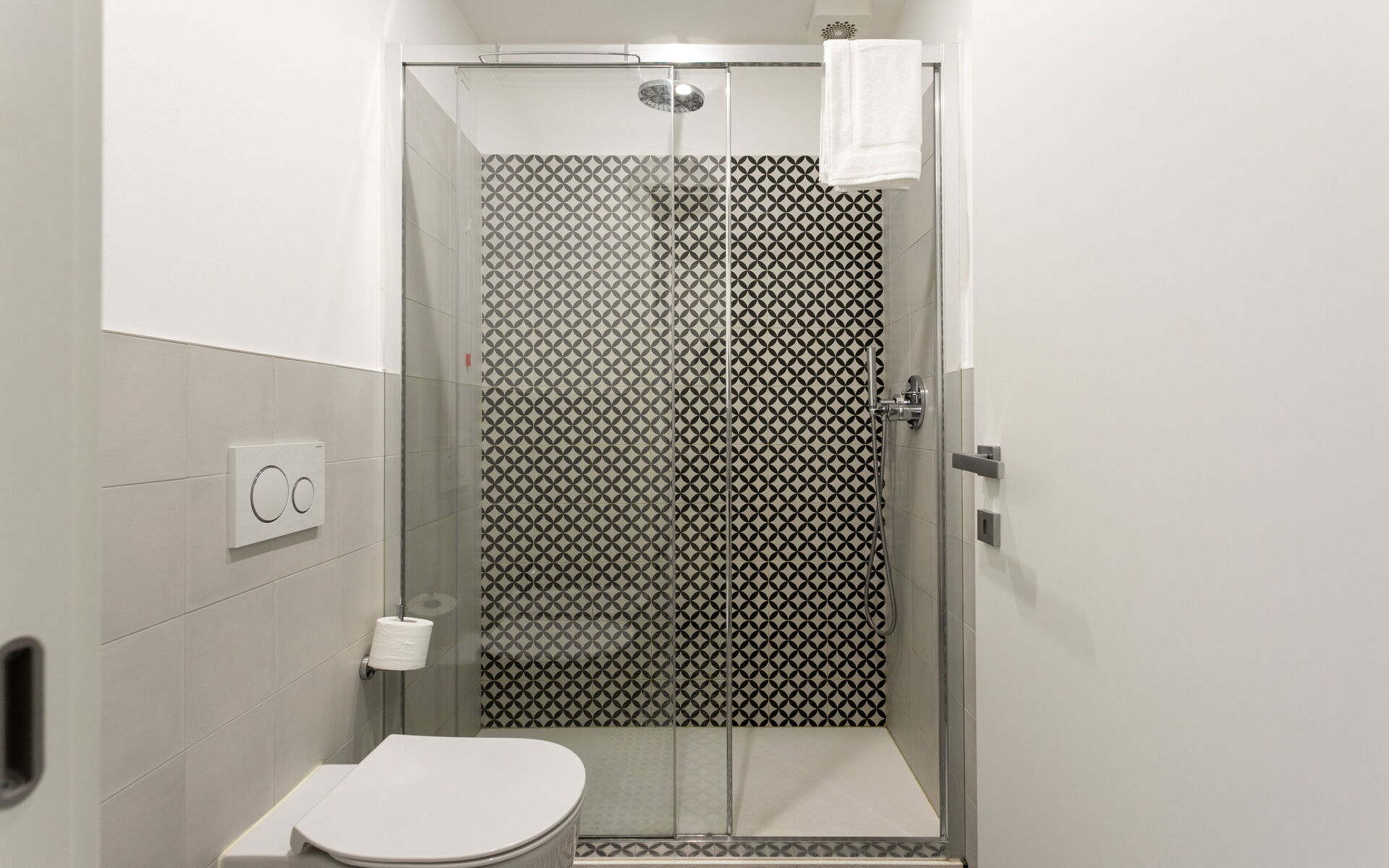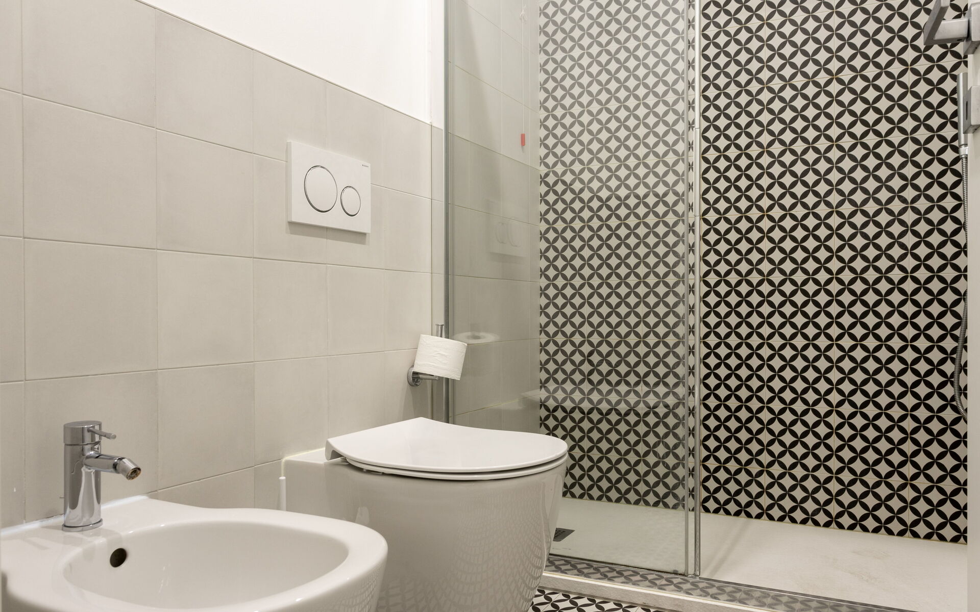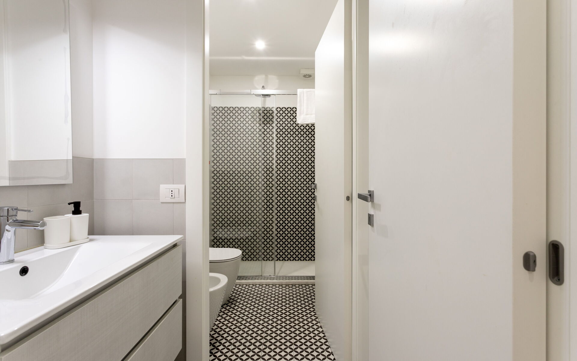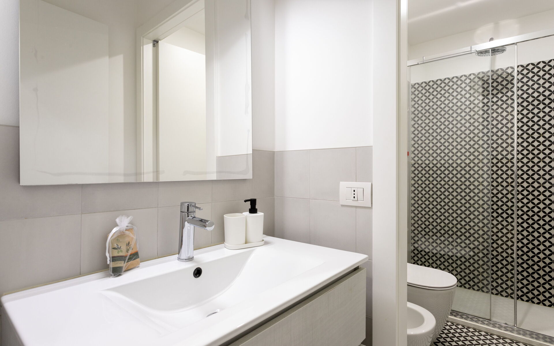 The apartment is completed by the bathroom with a large shower, sink, toilet, and bidet.