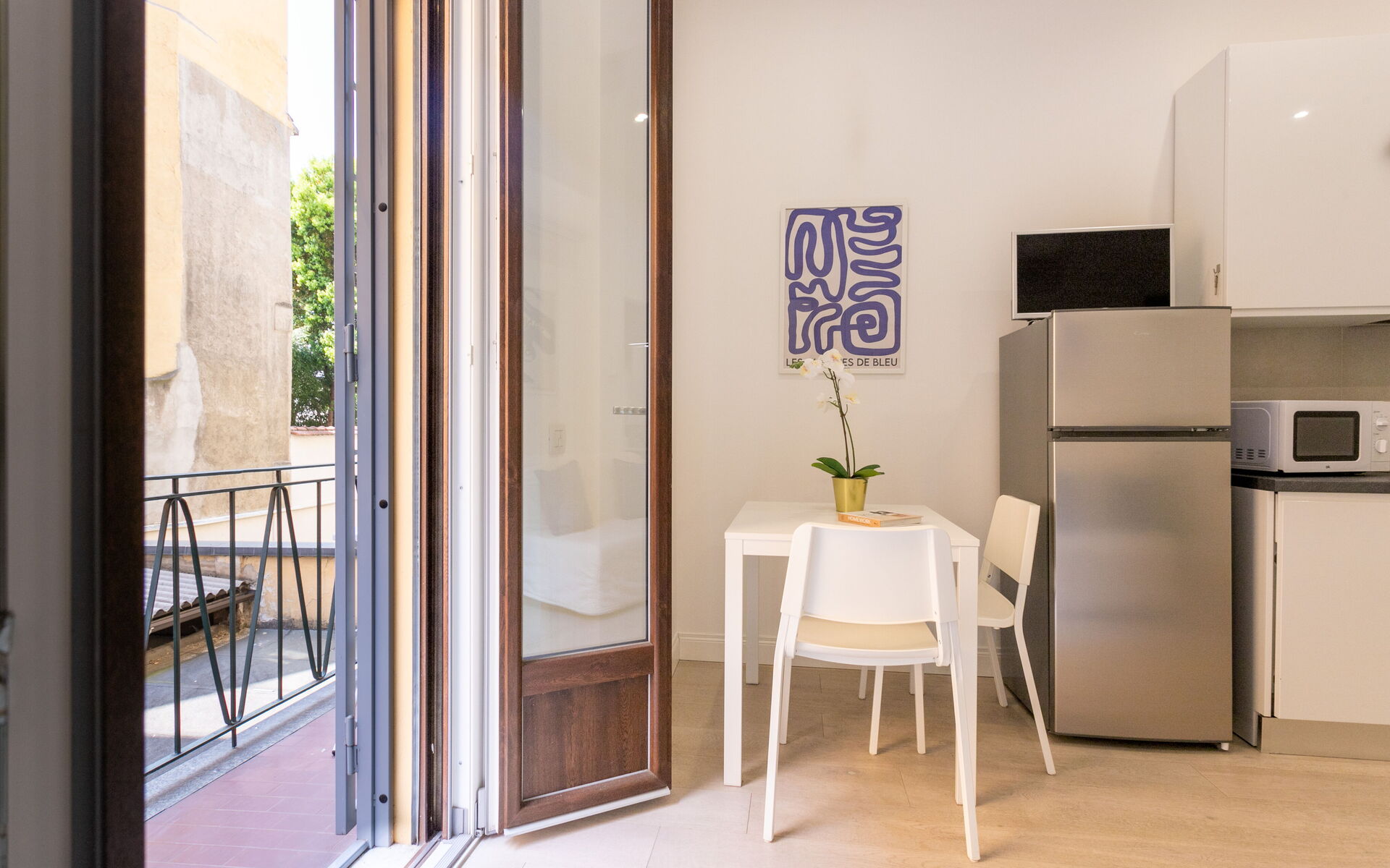 From the living room, access is to a large balcony overlooking the external courtyard, which is set up with a table and two chairs.