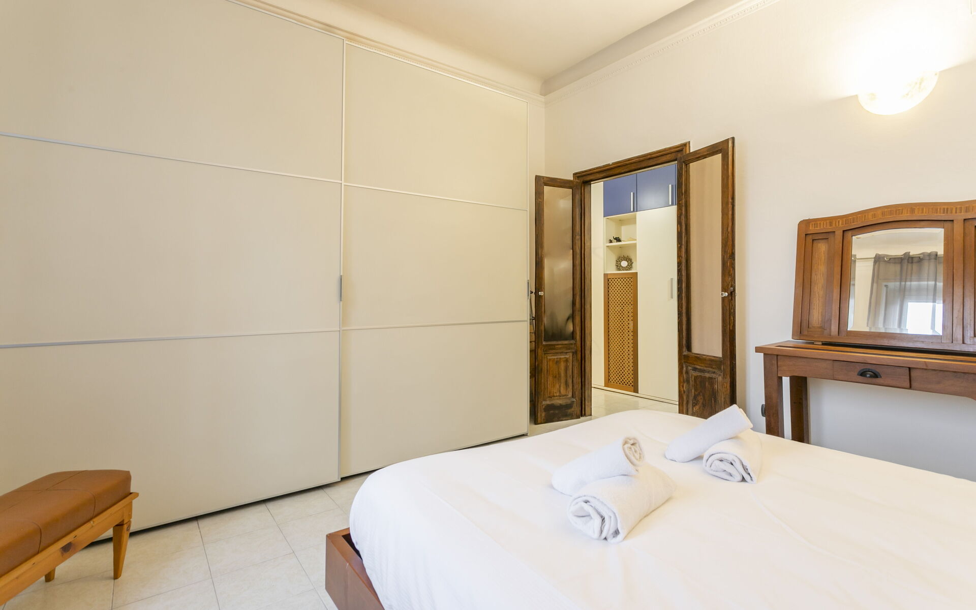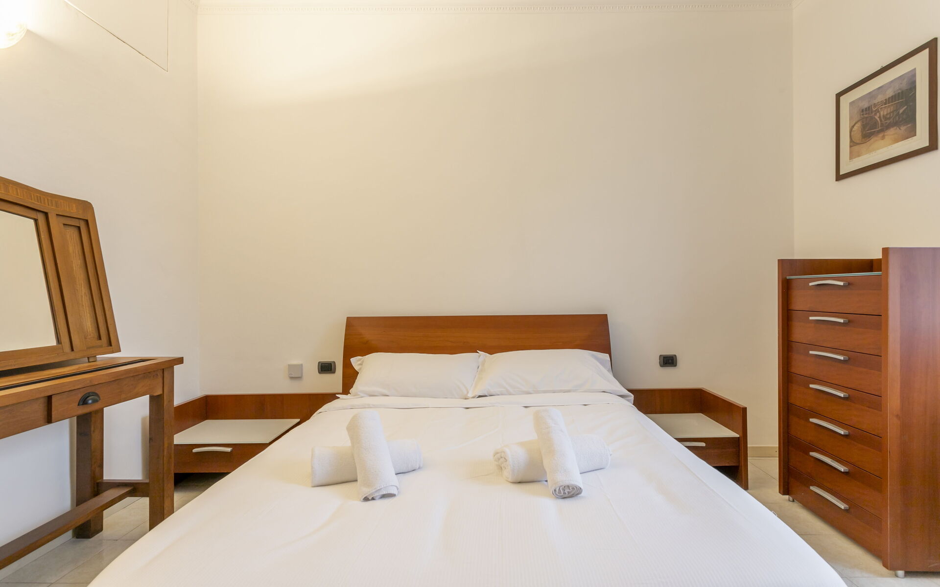 The bedroom features a comfortable bed (160cm x 185cm), a chest of drawers, a dressing table with mirror, and a large wardrobe with two sliding doors.