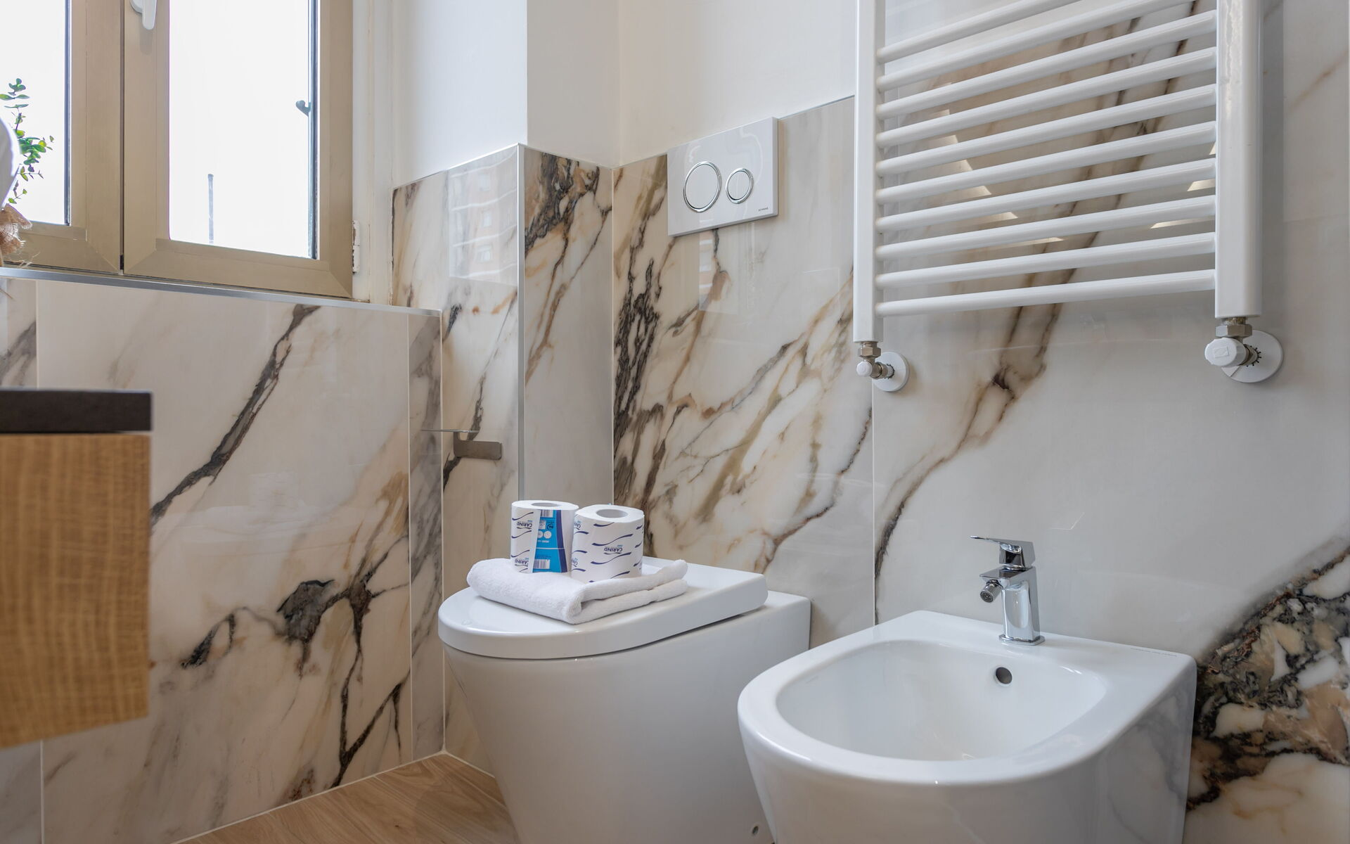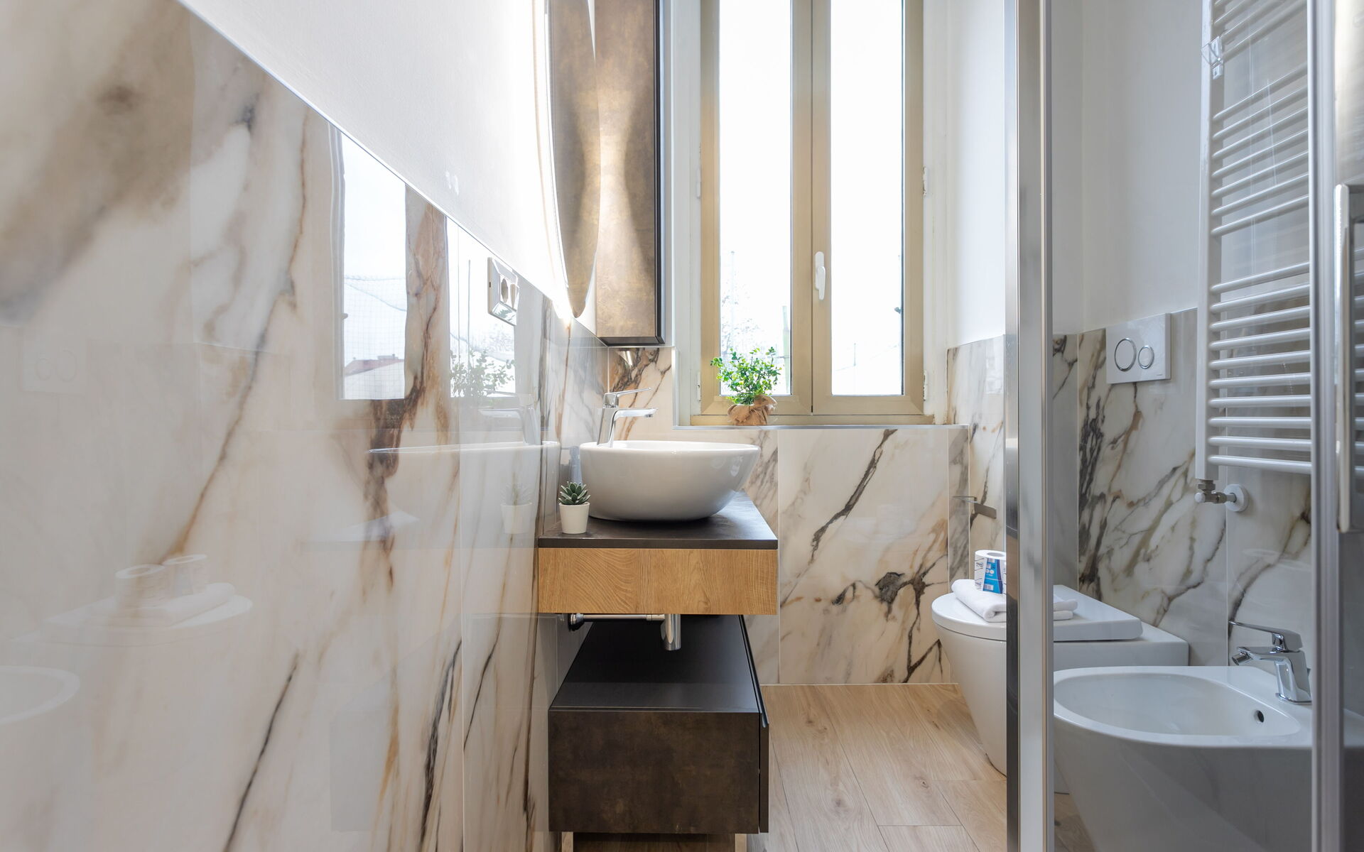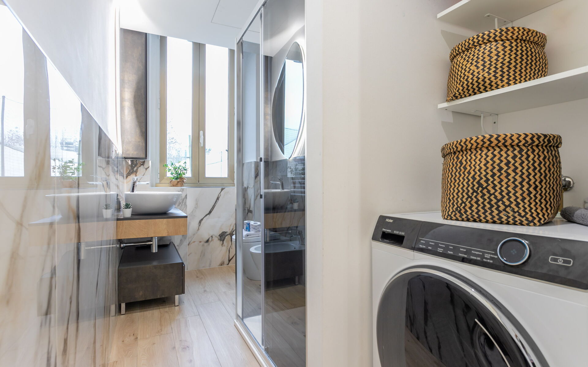 The apartment includes a windowed bathroom with a large shower, toilet, bidet, sink, and a convenient washer/dryer laundry area.