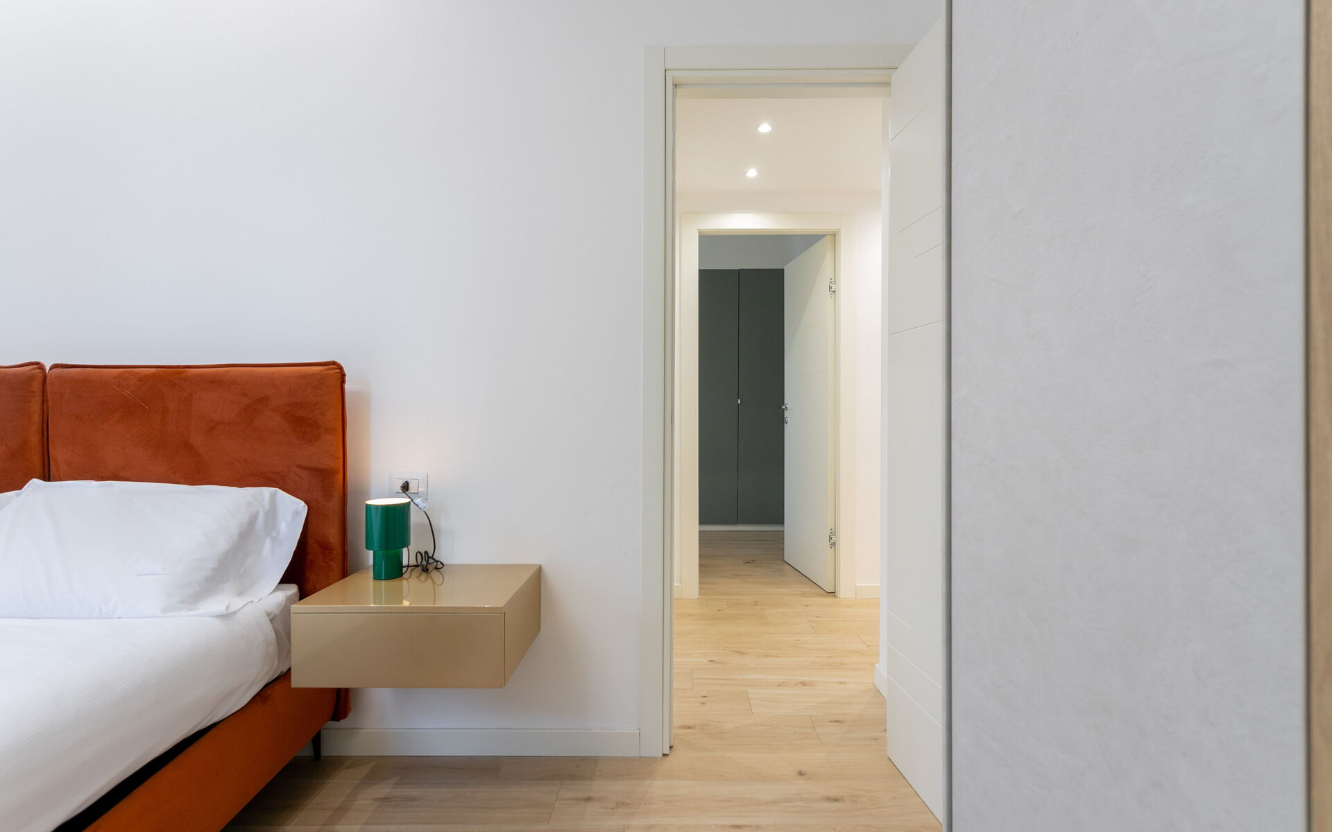 The master bedroom features a queen-size bed, bedside tables with lamps, and a spacious five-door wardrobe.