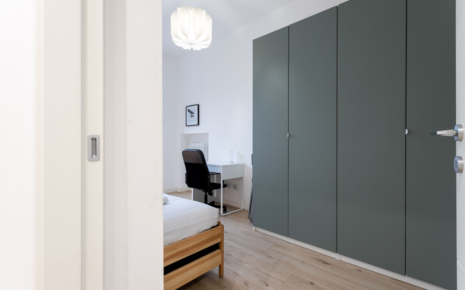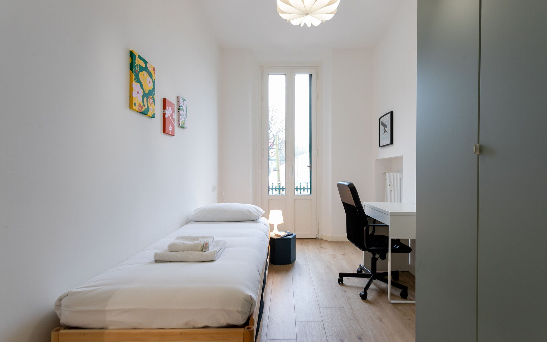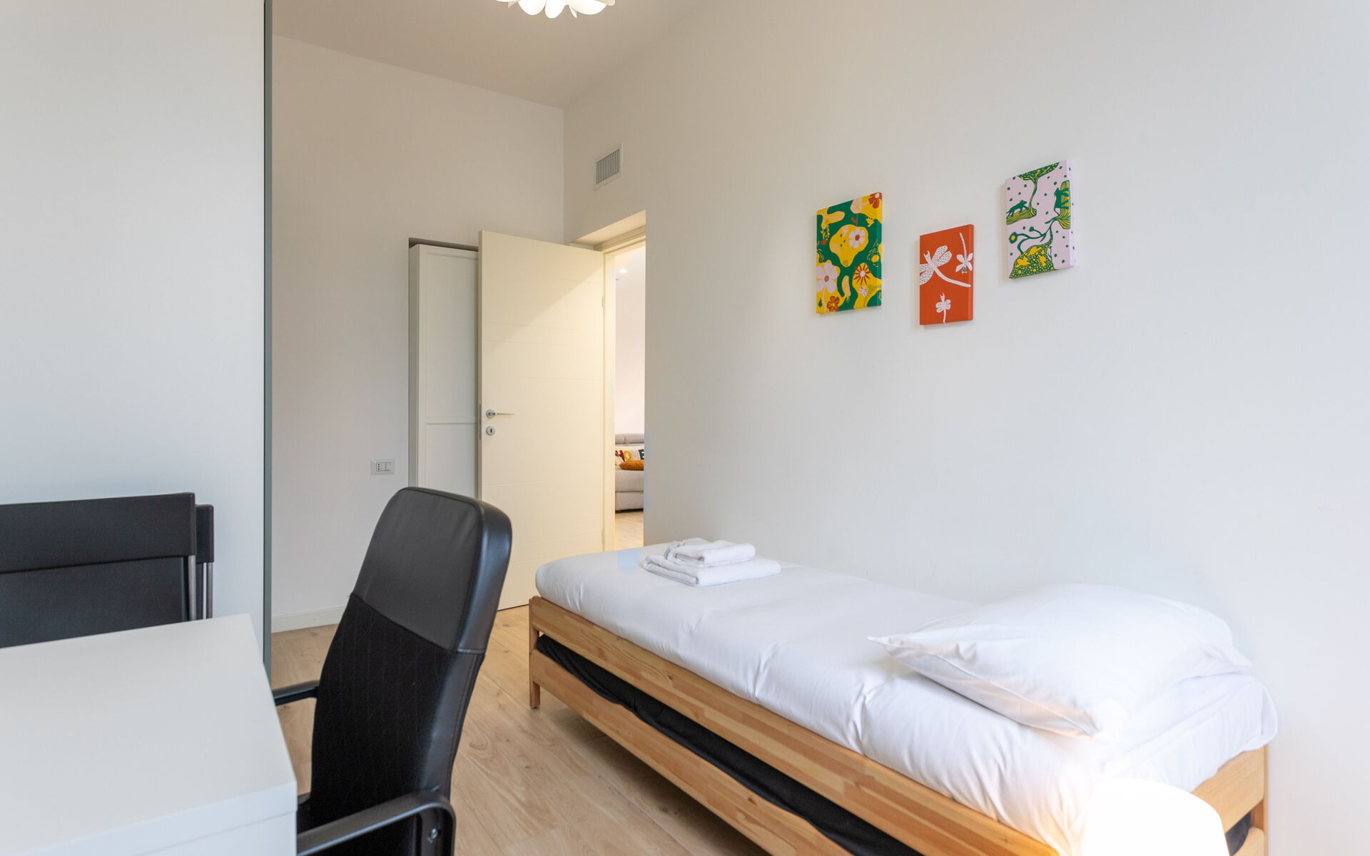 The second bedroom offers a single bed with an optional pull-out bed, a four-door wardrobe, shoe rack, and access to a balcony—perfect for children or additional guests.