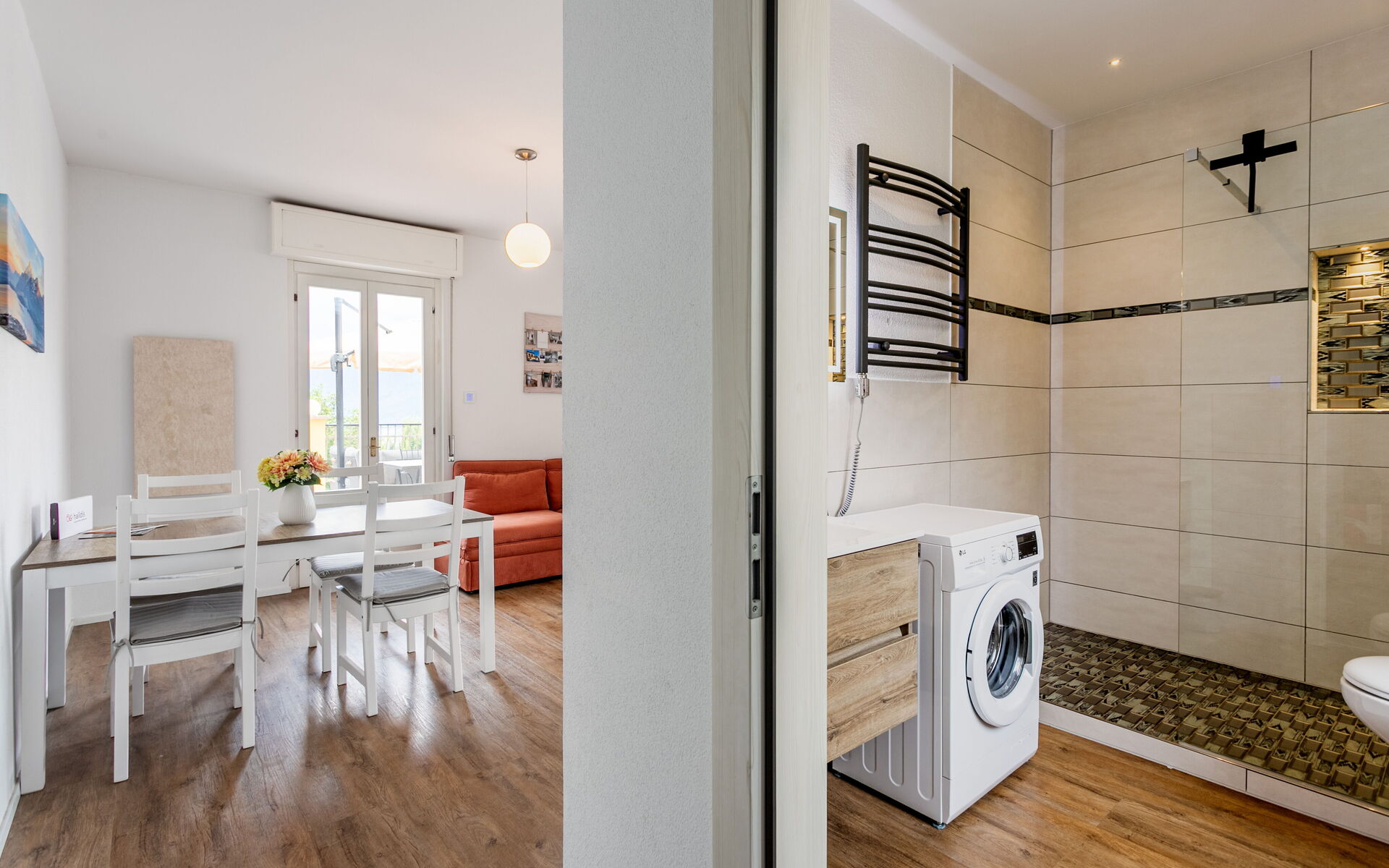 The apartment features a modern, fully equipped kitchen, ideal for preparing meals at home, and two bathrooms, providing extra comfort and privacy for guests. A washing machine is also available, making the apartment suitable for longer stays.
