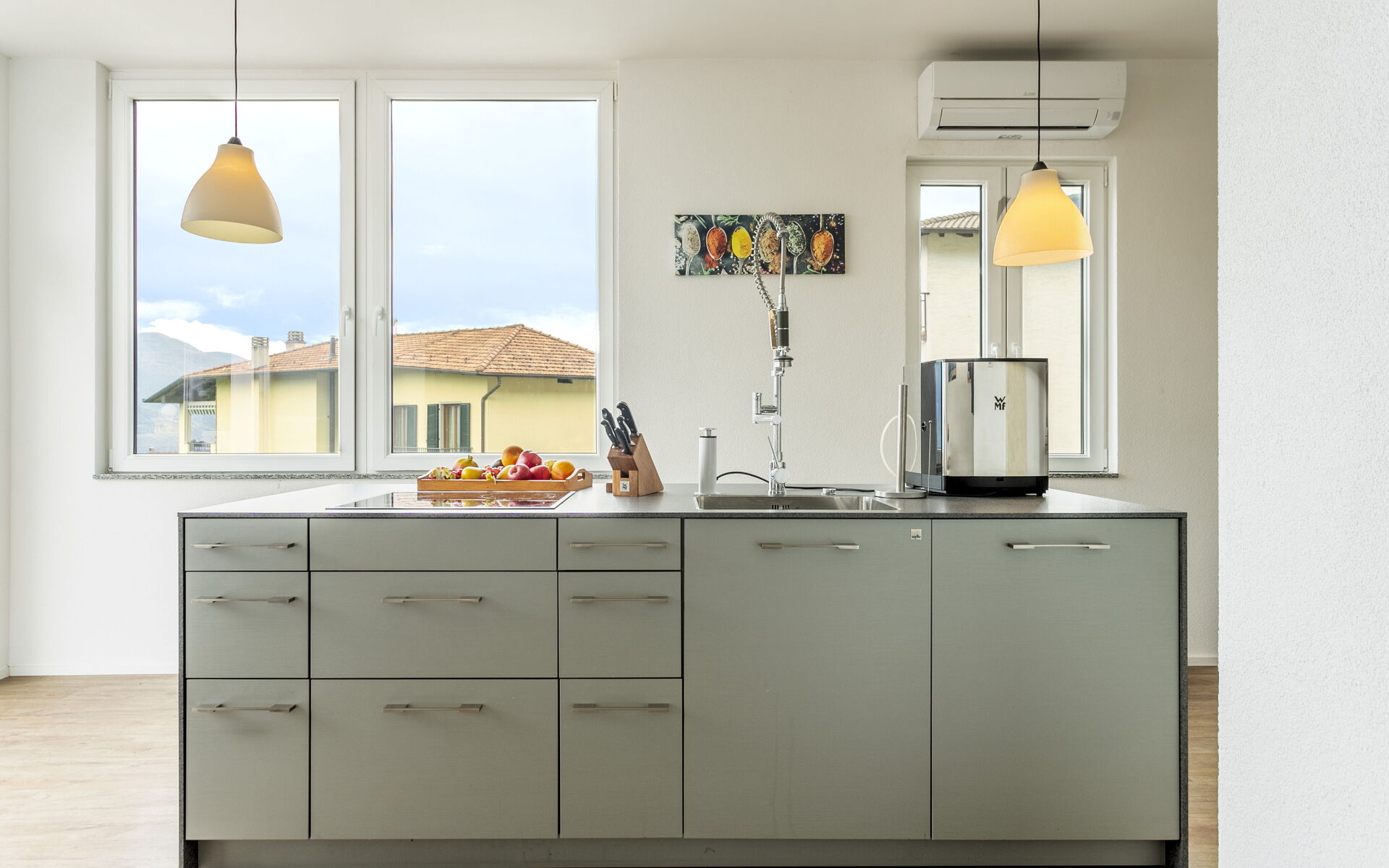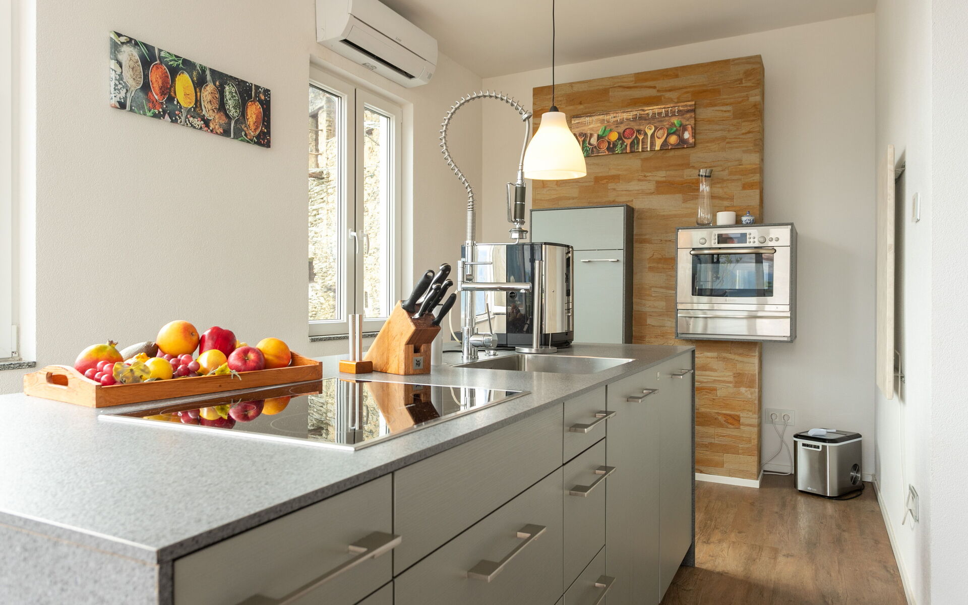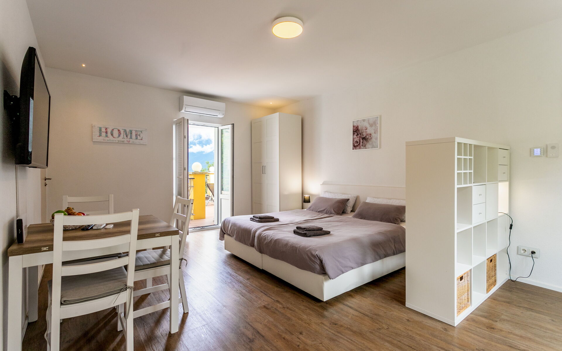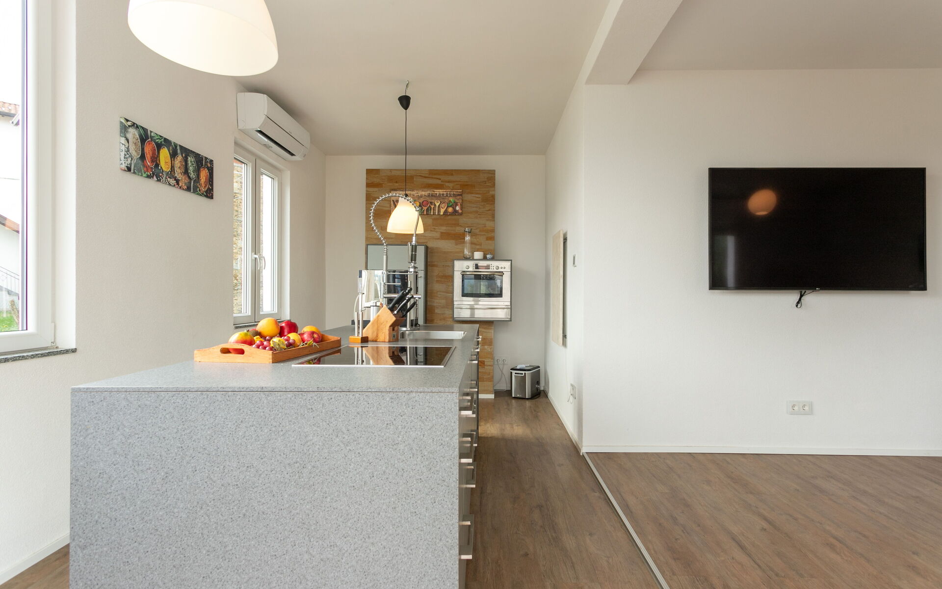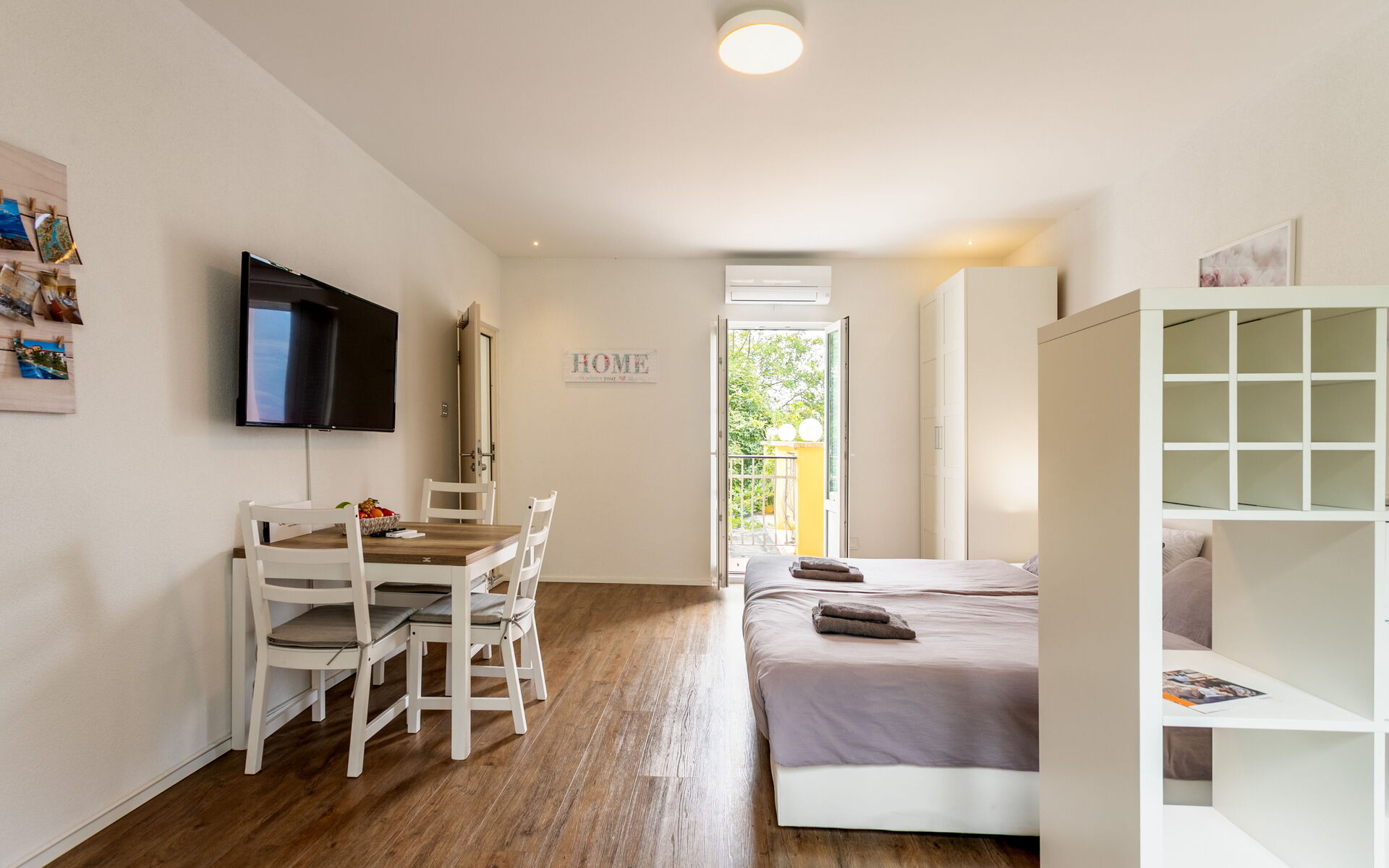 Located on the first floor, the apartment unifies two units into one comfortable living space and offers a modern and inviting atmosphere. It is equipped with air conditioning and electric heating, ensuring comfort throughout the year.