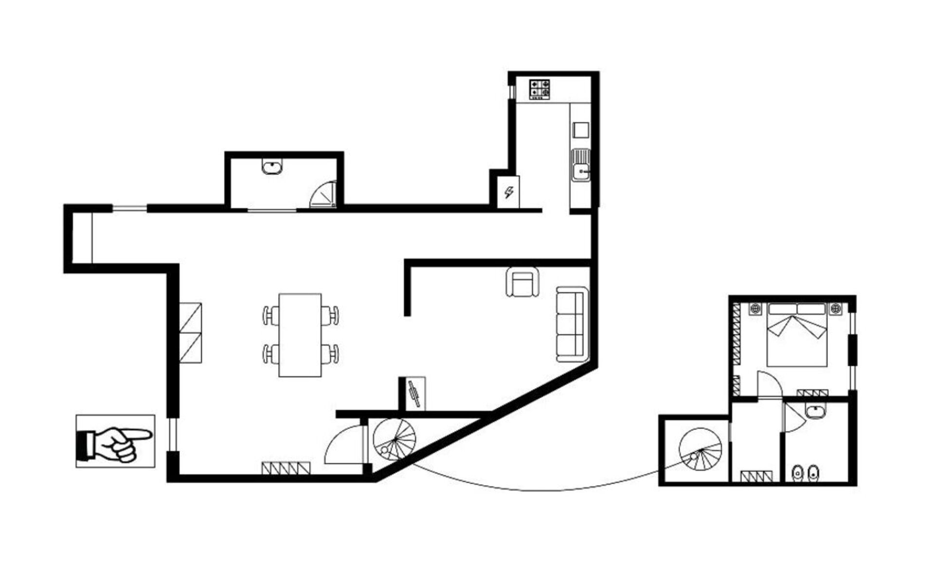 On the first level, guests will find a spacious living room with a single sofa bed, a generous dining area with a large table, and a compact yet fully equipped kitchen, complete with a traditional oven, fridge, freezer and coffee machine.