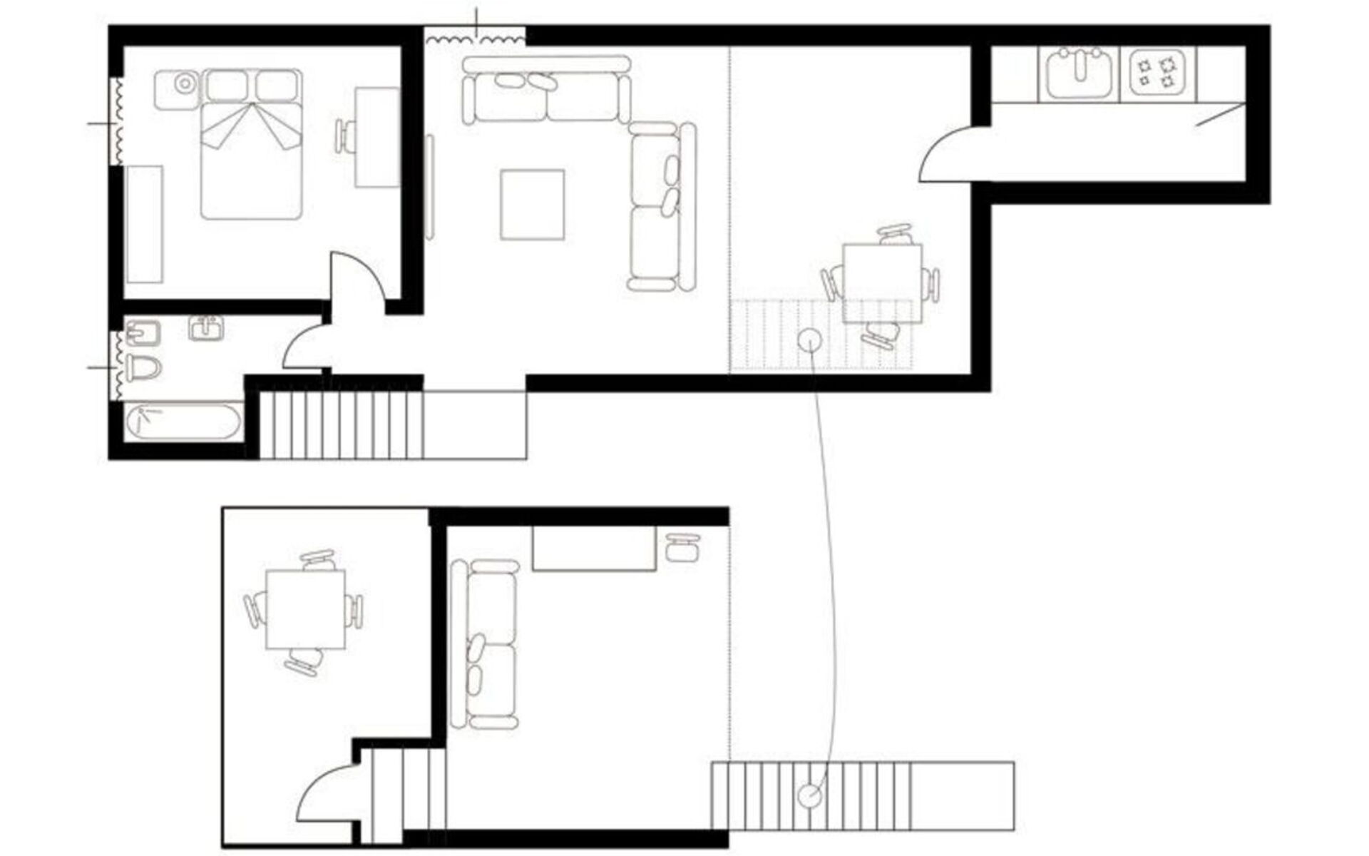 The apartment features one double bedroom, a bathroom with bathtub, a living area with dining space and equipped kitchen. The mezzanine level includes two single beds (90 cm), comfortably accommodating two additional guests.