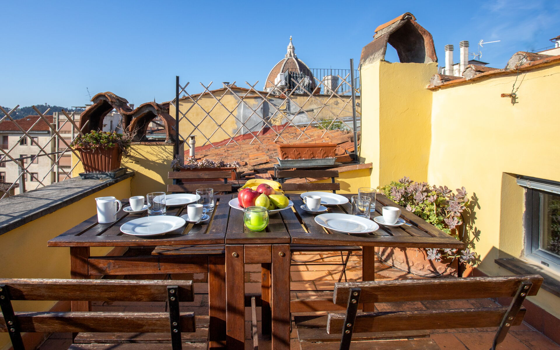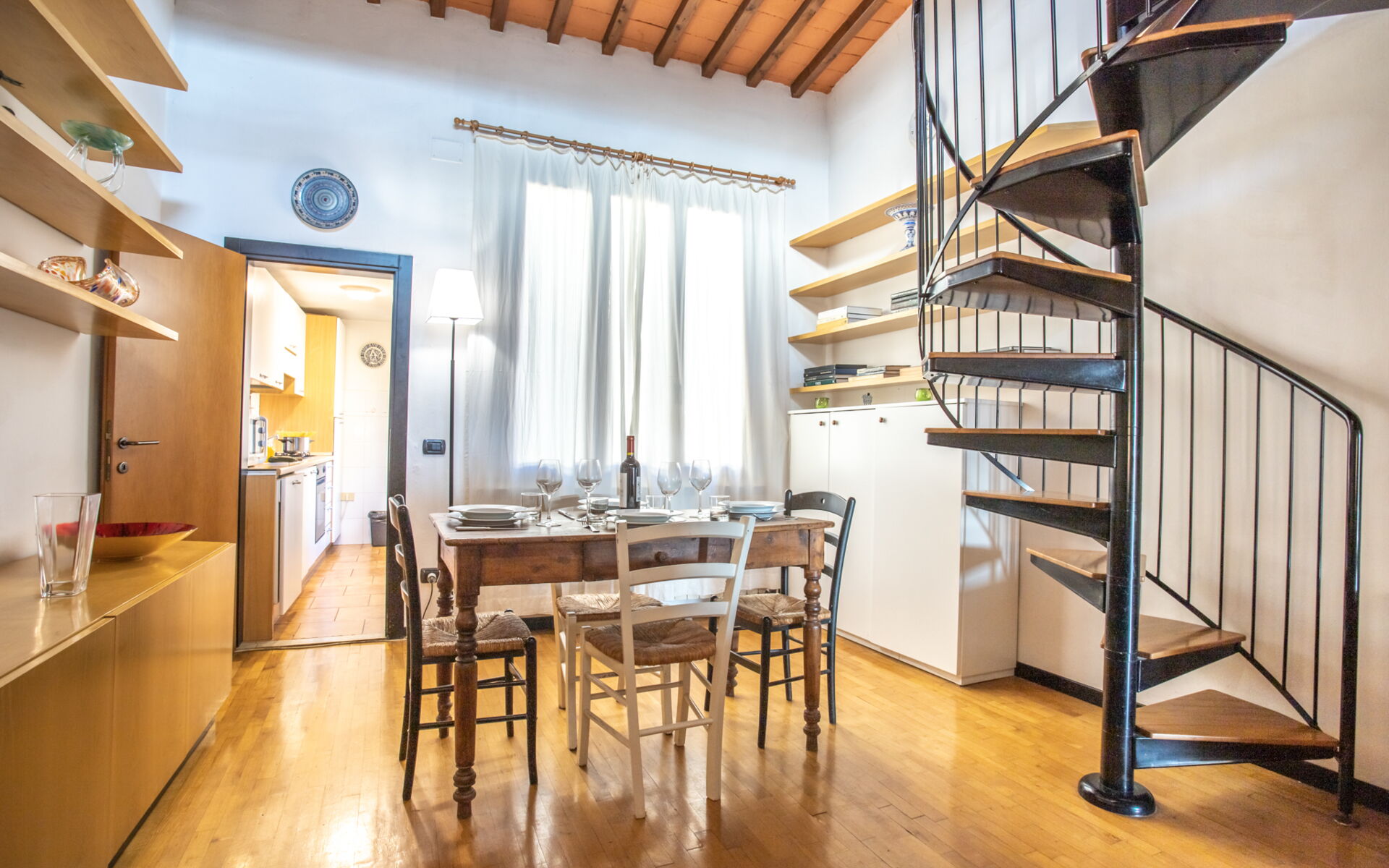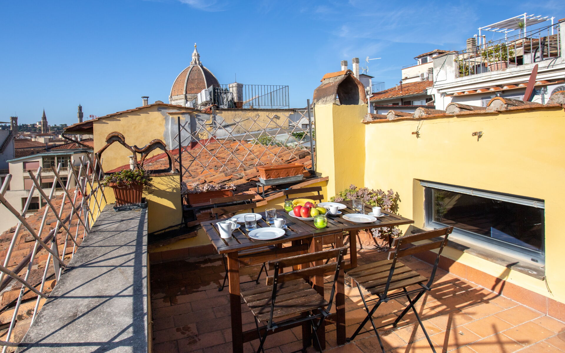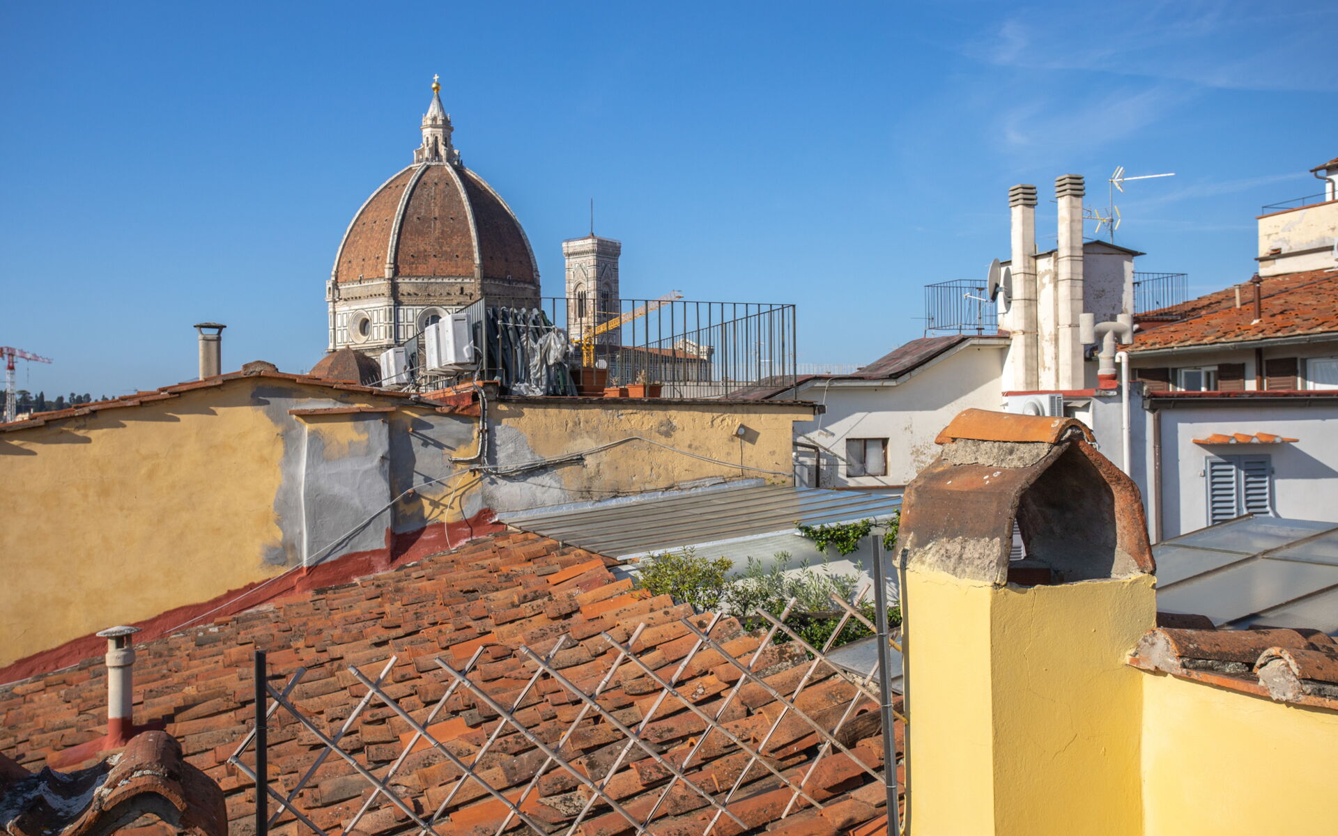 Its highlight is the private terrace, accessible from the mezzanine, perfect for relaxing at sunset while enjoying views over Florence’s rooftops. The atmosphere combines medieval charm with distinctive architectural details.