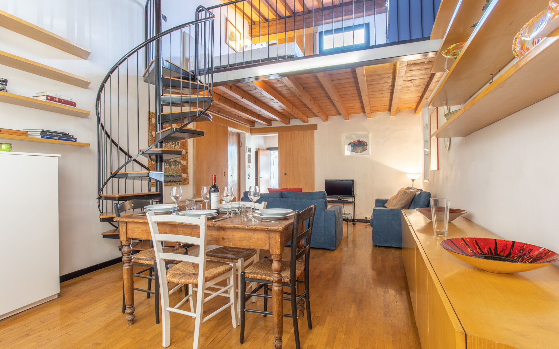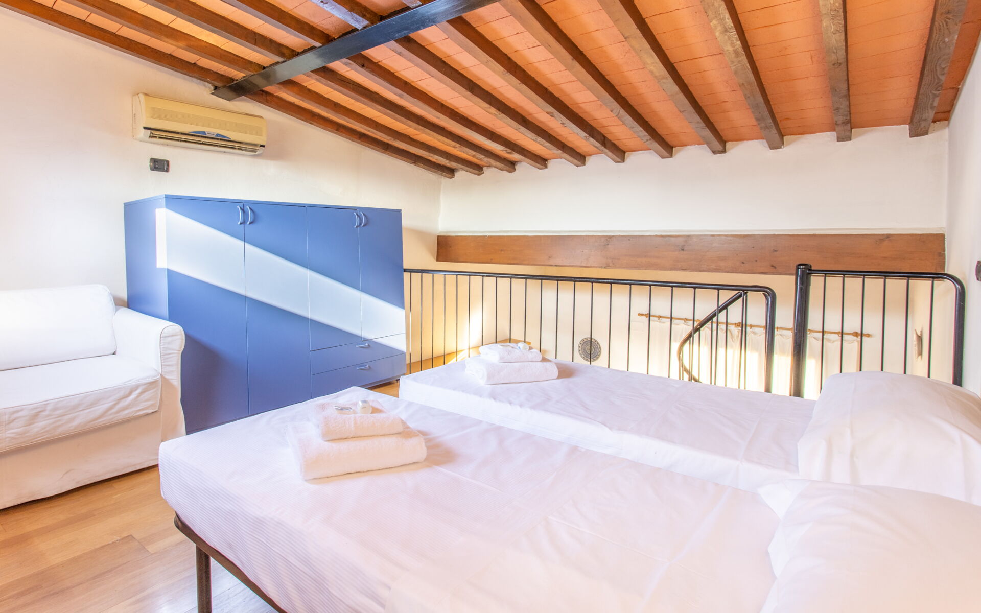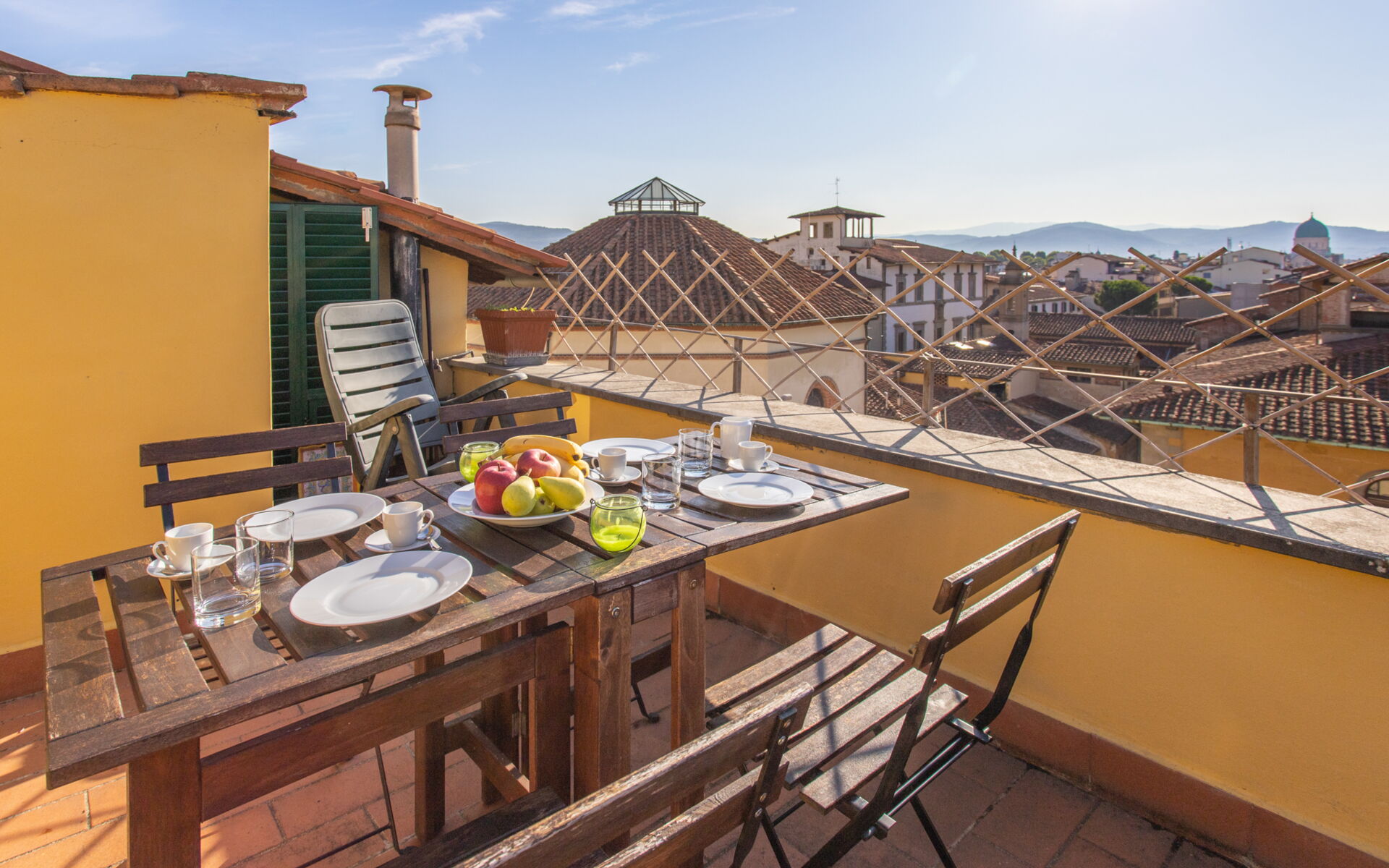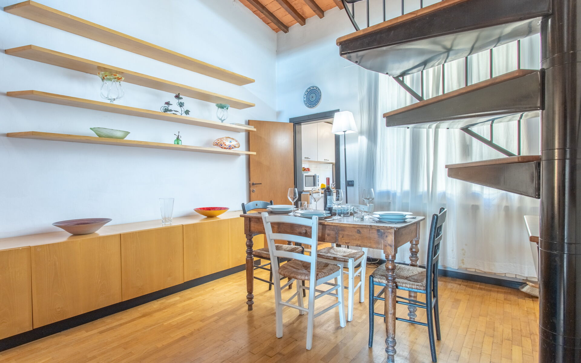 Its highlight is the private terrace, accessible from the mezzanine, perfect for relaxing at sunset while enjoying views over Florence’s rooftops. The atmosphere combines medieval charm with distinctive architectural details.