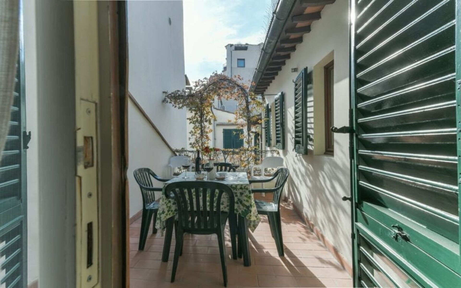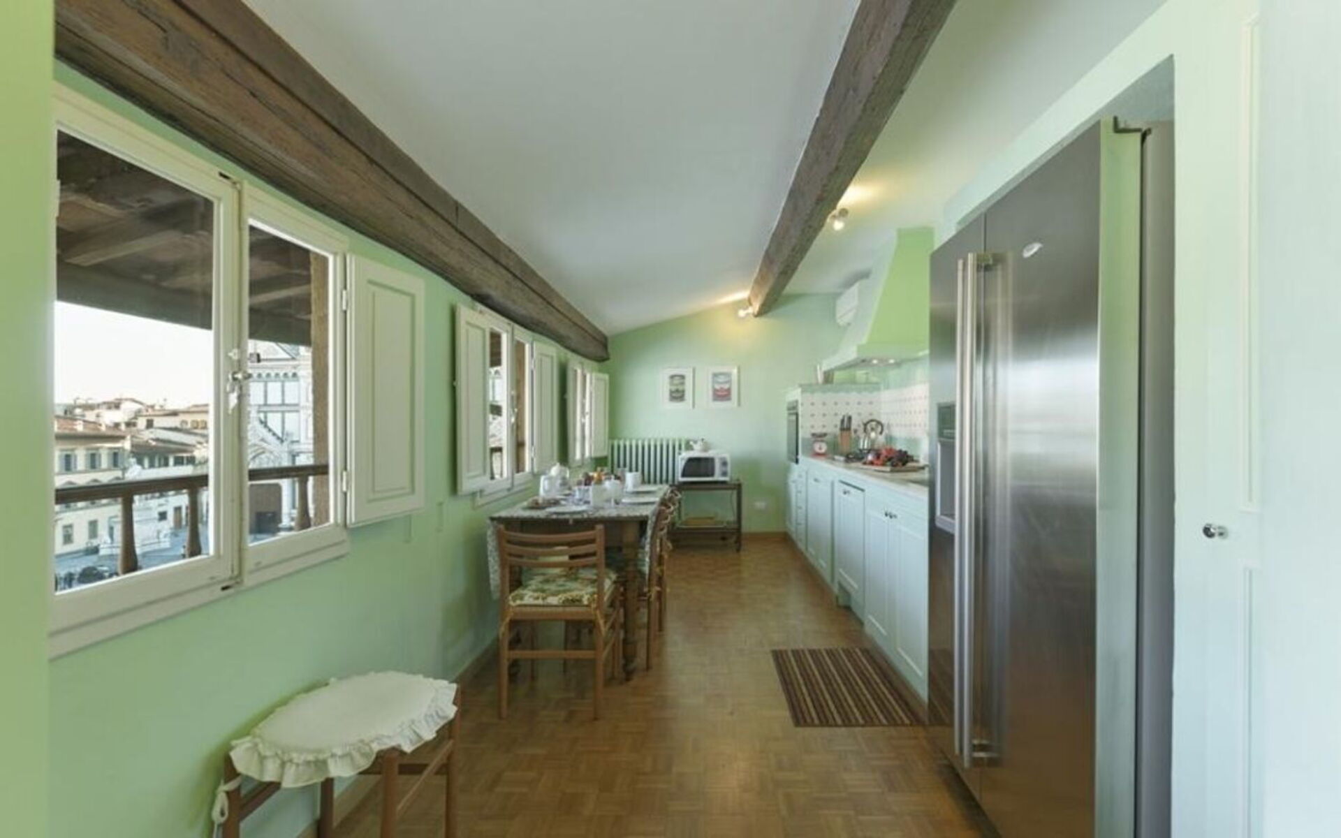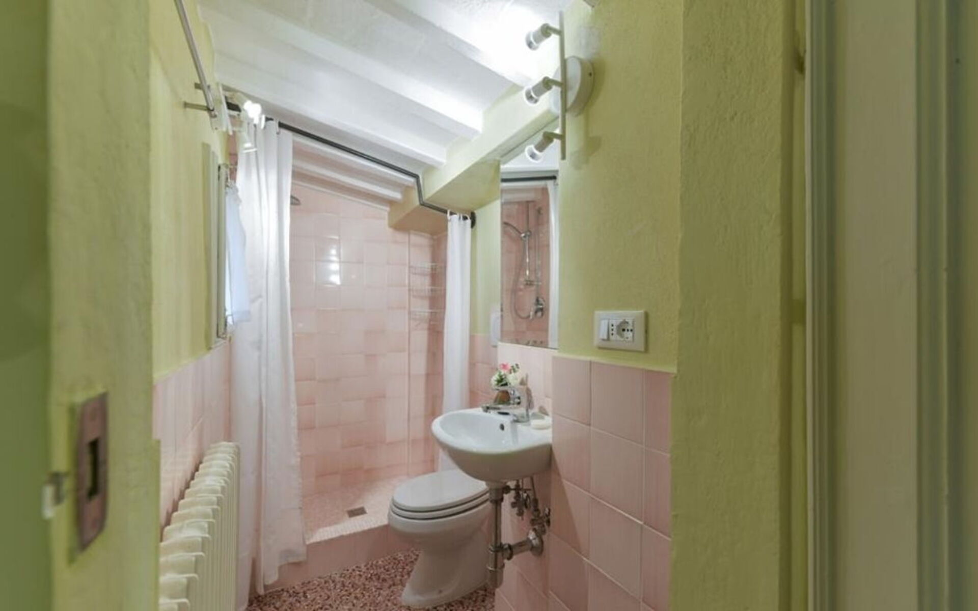 There is the first double bedroom (mattress with 160 cm - can be divided) and windows overlooking the rooftops, in front of this bedroom is a bathroom with a bathtub, on the left is the second double bedroom (mattress with 160 cm - can be divided) and access to the private terrace and the ensuite bathroom with shower. Continuing to the left and going down 4 steps it's possible to reach the third bedroom with two single beds (mattress with 90cm - cannot be joined together) with en suite bathroom with shower and curtain.